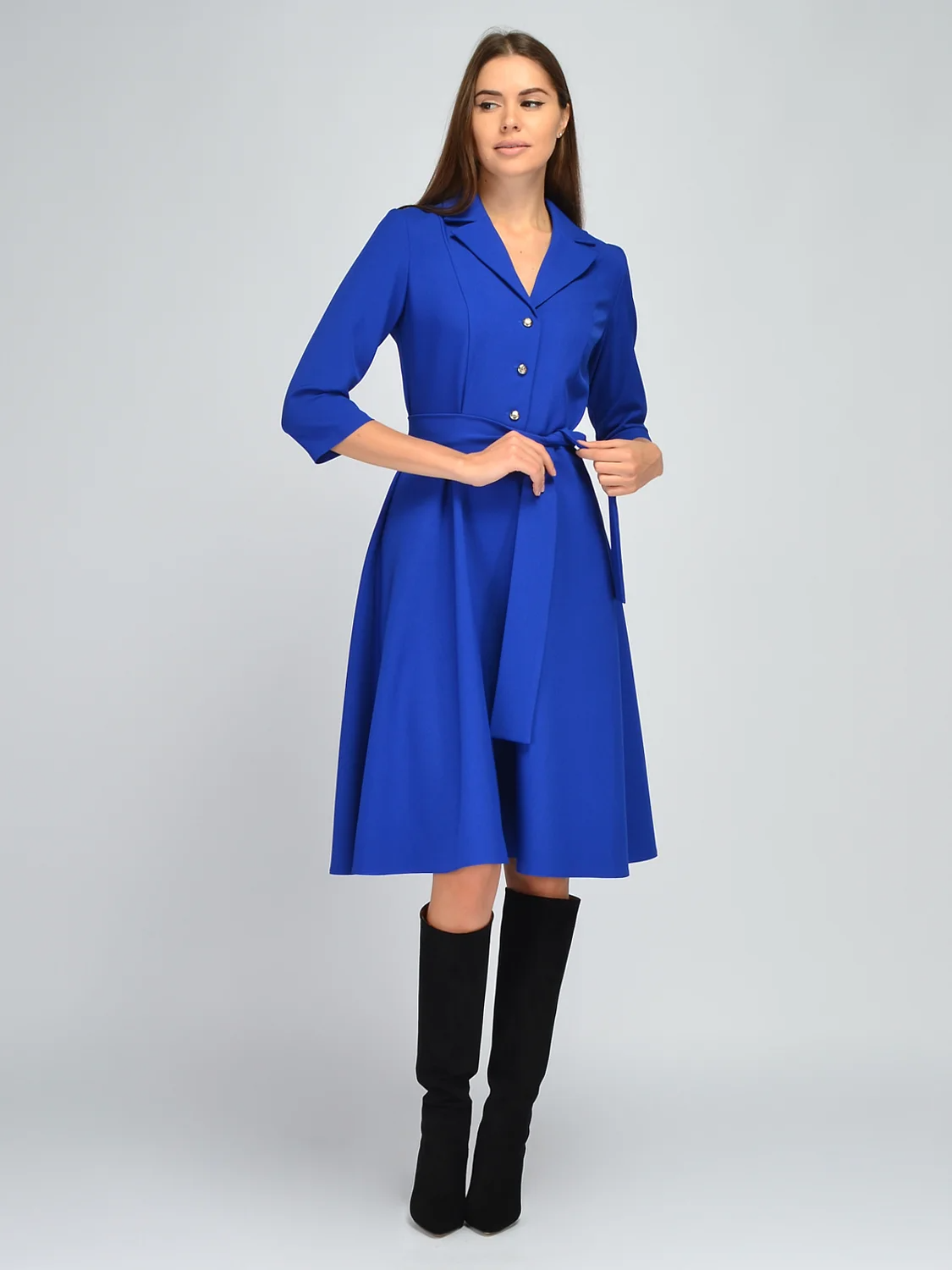 Нарядное платье миди с отложным воротником идеально подойдет не только для торжественного мероприятия, но и для офиса, и на каждый день. У стильного платья классический отложной воротник, переходящий в V-образный вырез горловины, красиво приоткрывая ключицу. Платье до колен имеет застежку пуговицы на полочке. Элегантное платье комплектуется поясом в цвет платья, выгодно подчеркивая талию. Приталенное платье с юбкой колокольчик создает романтичный и женственный образ. Удобные рукава три четверти не сковывают движений. Платье с пышной юбкой позволит Вам чувствовать себя свободно и уверенно, скрывая возможные недостатки фигуры. Вертикальные вытачки визуально вытягивают силуэт. Шикарное платье с юбкой в складку выпускается в широком размерном ряду, в наличии большие размеры плюс сайз plus size. Лаконичный фасон и универсальная длина платья позволяют его носить и взрослым женщинам, и молодым девушкам. Чтобы выглядеть выше и стройнее, выбирайте обувь к платью на высоком каблуке. Не забудьте завершить праздничный образ подходящими украшениями и прической.
