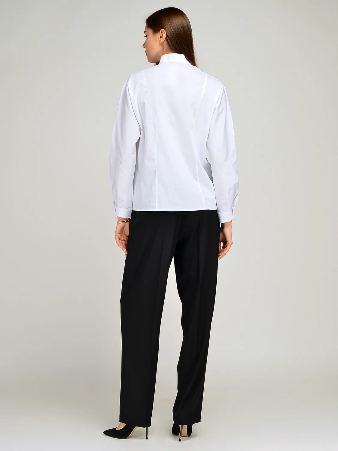 Базовая блузка рубашка оверсайз с рукавами формы летучая мышь и декоративными складками по рукавам привнесет разнообразия в классические офисные или праздничные образы. Горловина выполнена в виде воротника-стойки, застегивается блузка на потайные пуговицы. Сдержанный и при этом эффектный фасон не оставит Вас незамеченной и станет изюминкой осеннего гардероба.