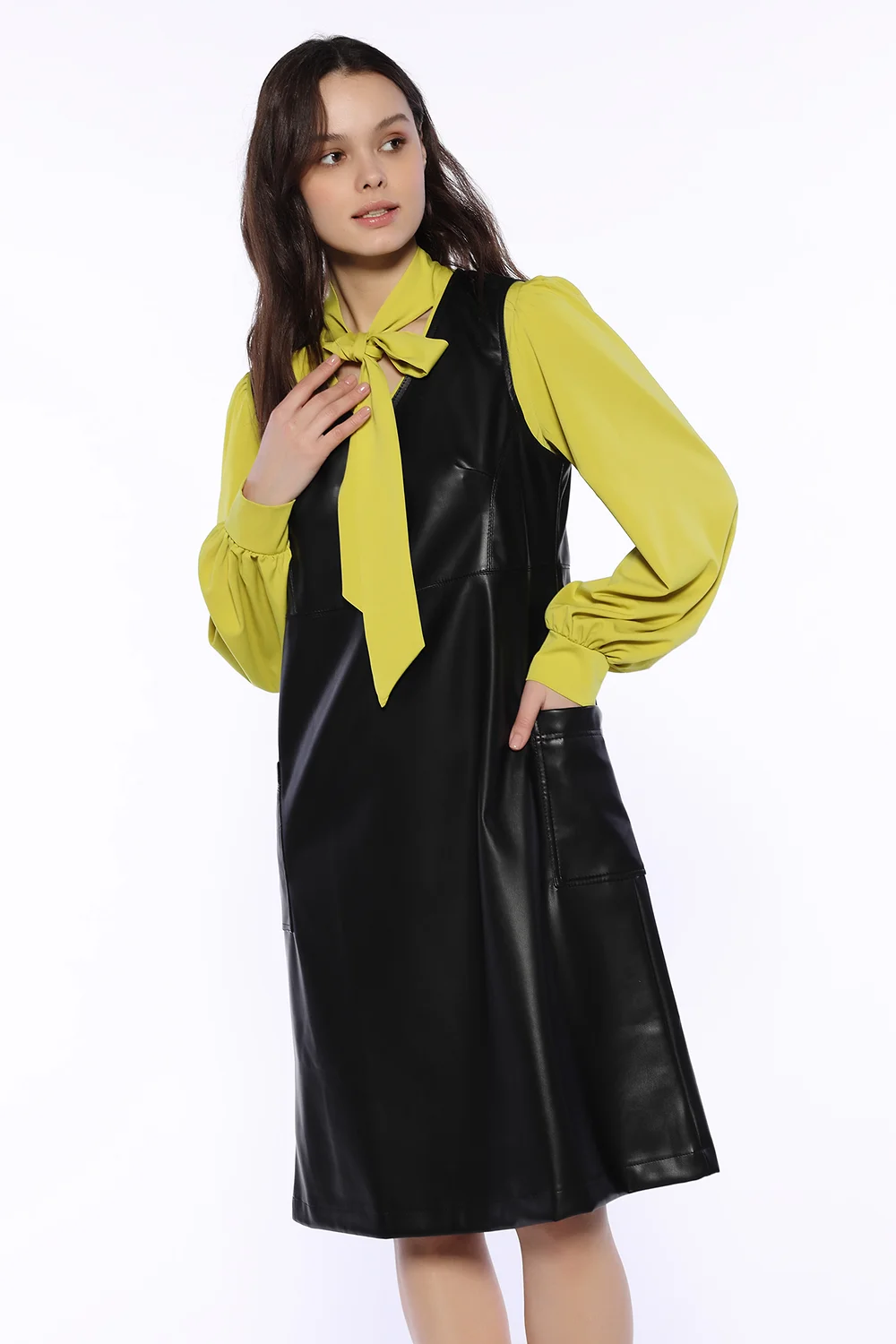 Стильный женский кожаный сарафан миди с V образным вырезом станет ярким элементом осеннего и зимнего гардероба. Лаконичный фасон приталенного сарафана дополнен боковыми карманами для удобства. Удобный сарафан выполнен из приятной наощупь экокожи. В более теплую погоду Вы можете носить сарафан как самостоятельную единицу, а когда станет прохладно, наденьте под него водолазку, джемпер или лонгслив, чтобы собрать уютный закрытый образ.