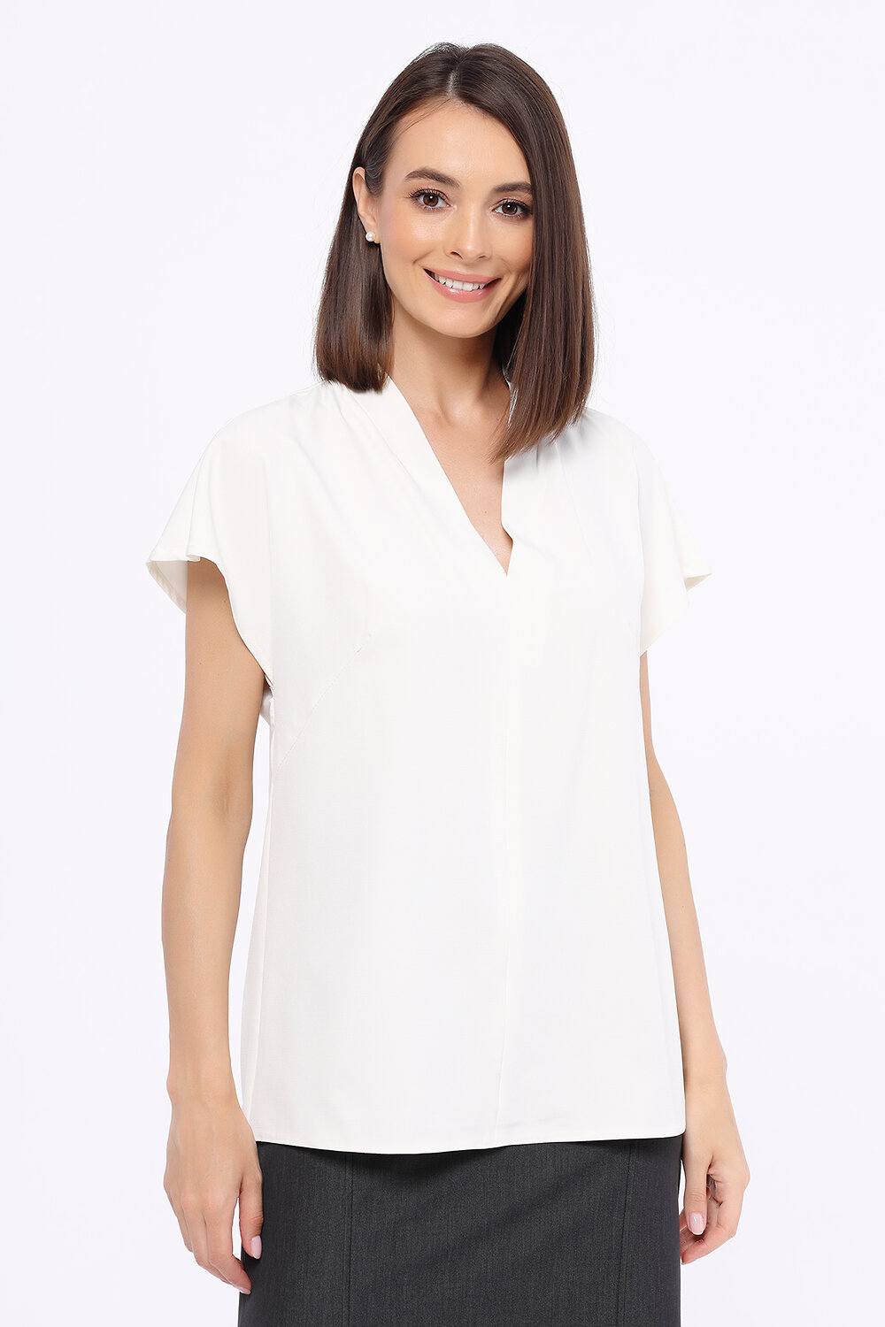 Блузка с коротким рукавом станет универсальным элементом Вашего гардероба. Блузка прямого кроя с коротким рукавом позволит Вам чувствовать себя свободно, комфортно и женственно. Утончённый V-образный вырез выгодно подчёркивает линию шеи. Блузка прямого кроя гармонично впишется как в офисный, так и в повседневный стиль.