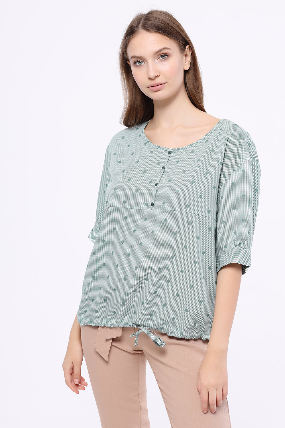 Прямая блузка свободного силуэта гармонично дополнит Ваш весенний гардероб. В составе блузки хлопок, благодаря чему Вы будете чувствовать себя комфортно в жаркую погоду. Округлая горловина и укороченный рукав до локтя создают мягкий женственный образ. Декоративные пуговицы и кулиска придадут Вашему образу романтичности. Прямая блузка с кулиской поможет завершить офисный или повседневный образы.