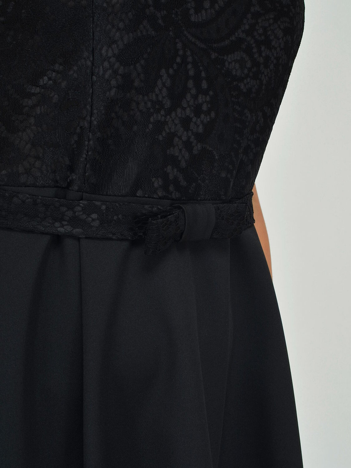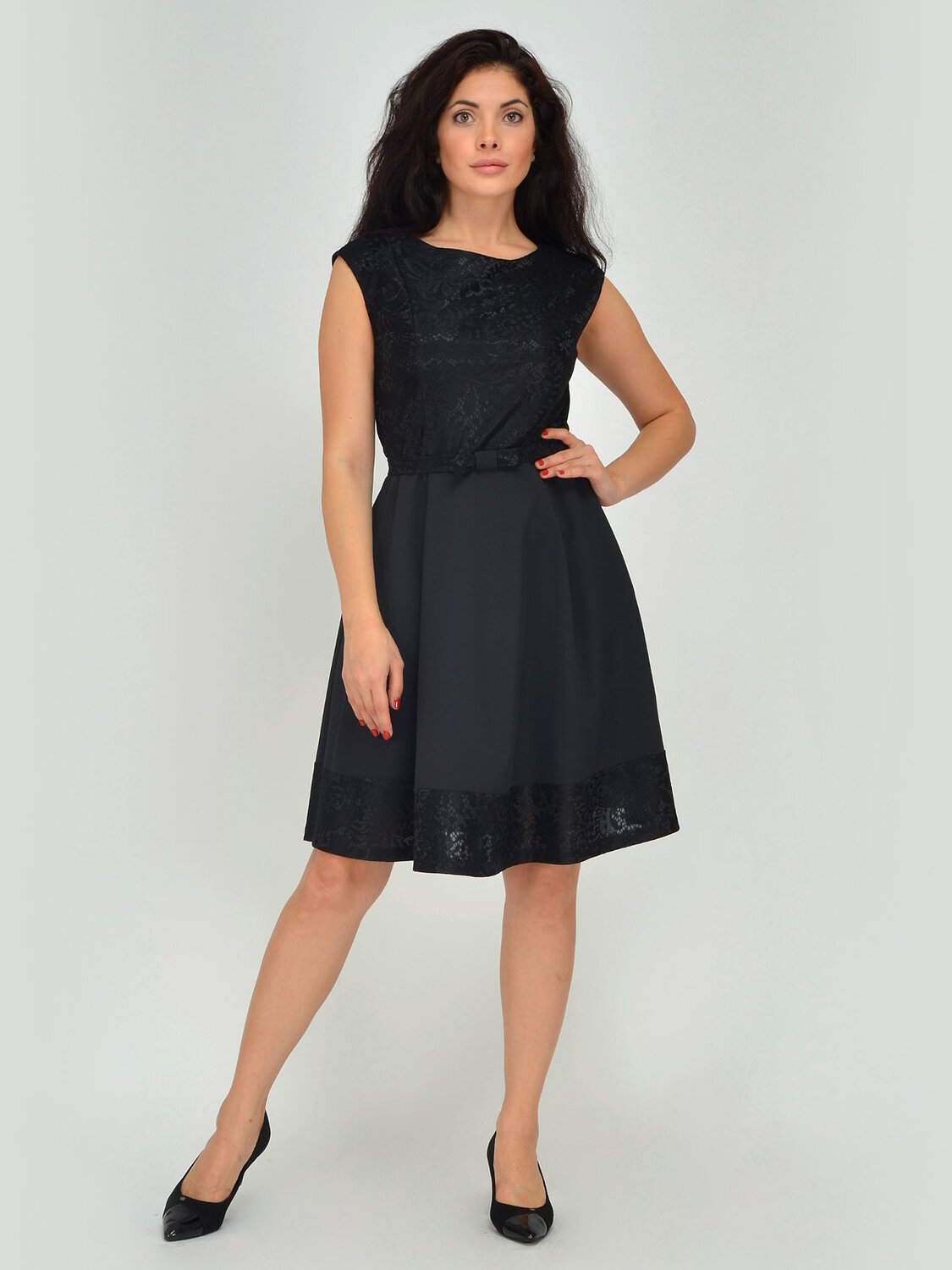 Платье женское отрезное по линии талии , клешеное. Низ юбки и верх изделия из отделочной кружевной ткани. По спинке V-образный вырез. В боковых швах карманы. Изделие с поясом