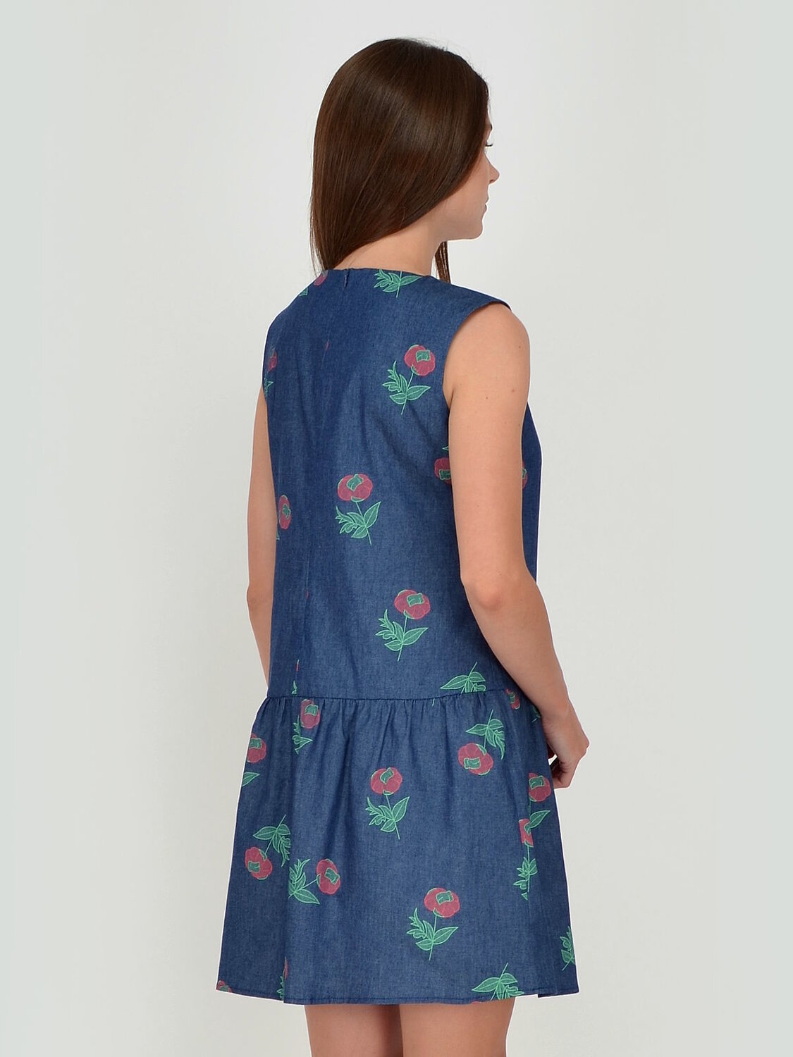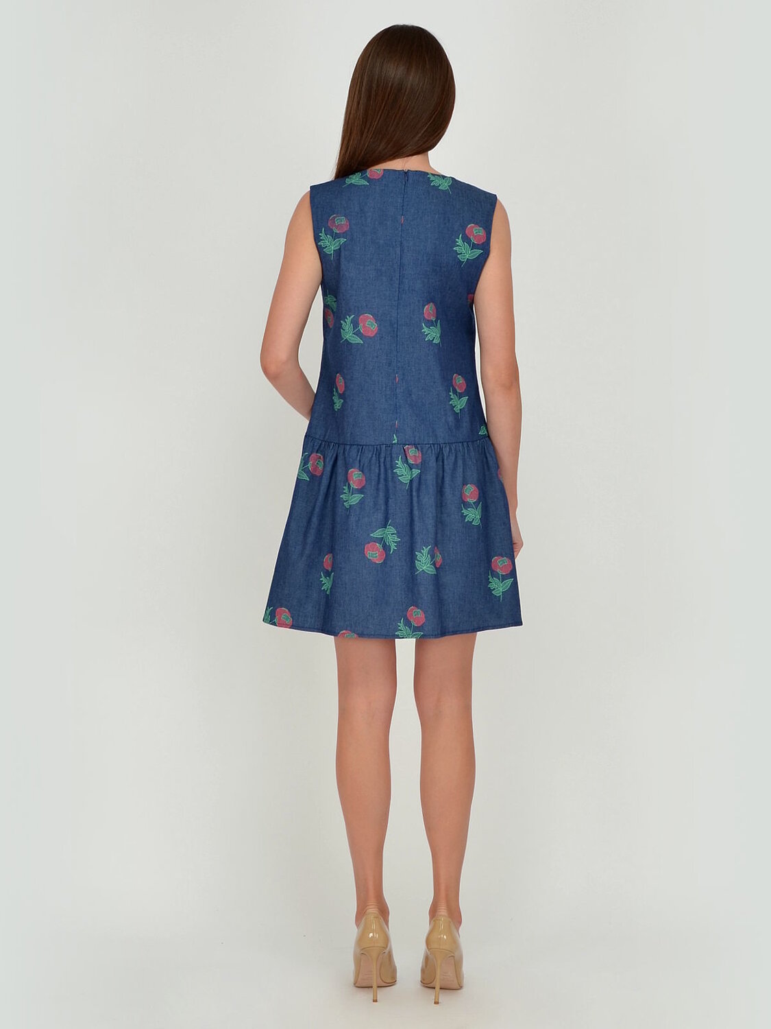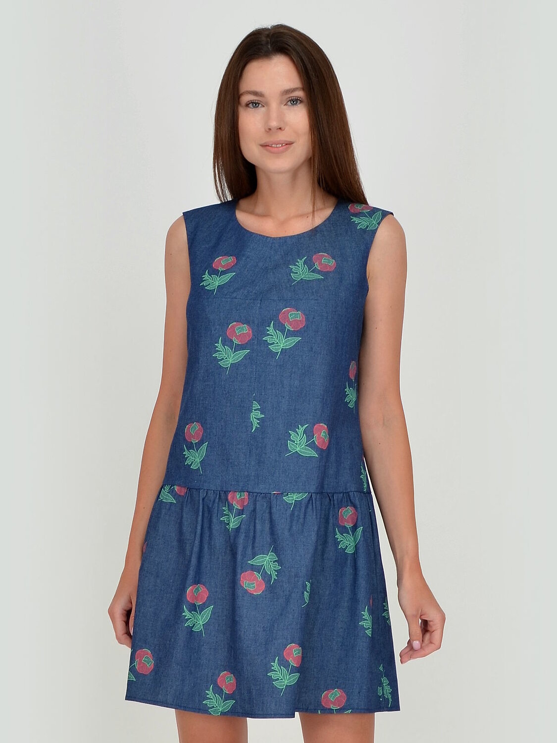 Платье женское без рукавов полуприлегающего слуэта. По низу широкий волан. Изделие без подкладки.