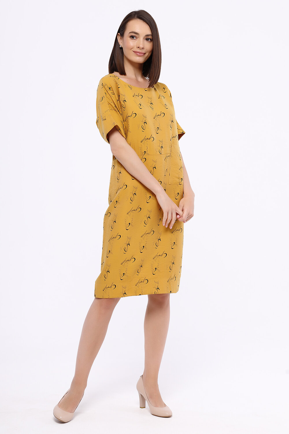 В составе платья вискоза 70%, полиэстер 30%. Вырез горловины - округлый. Рукава короткие. Без застёжки. Длина миди. Конструктивный элемент - накладной карман. Крой прямой. Рукава цельнокроеные. Форма рукавов - летучая мышь. Рекомендована стирка при температуре не более 30С.