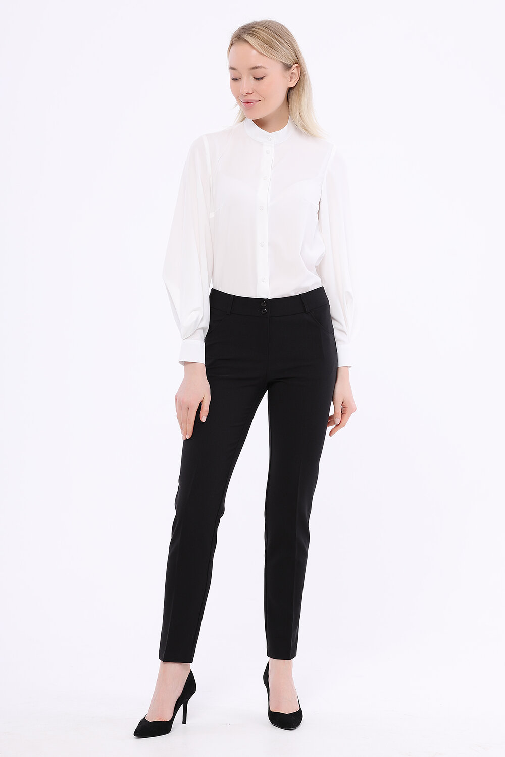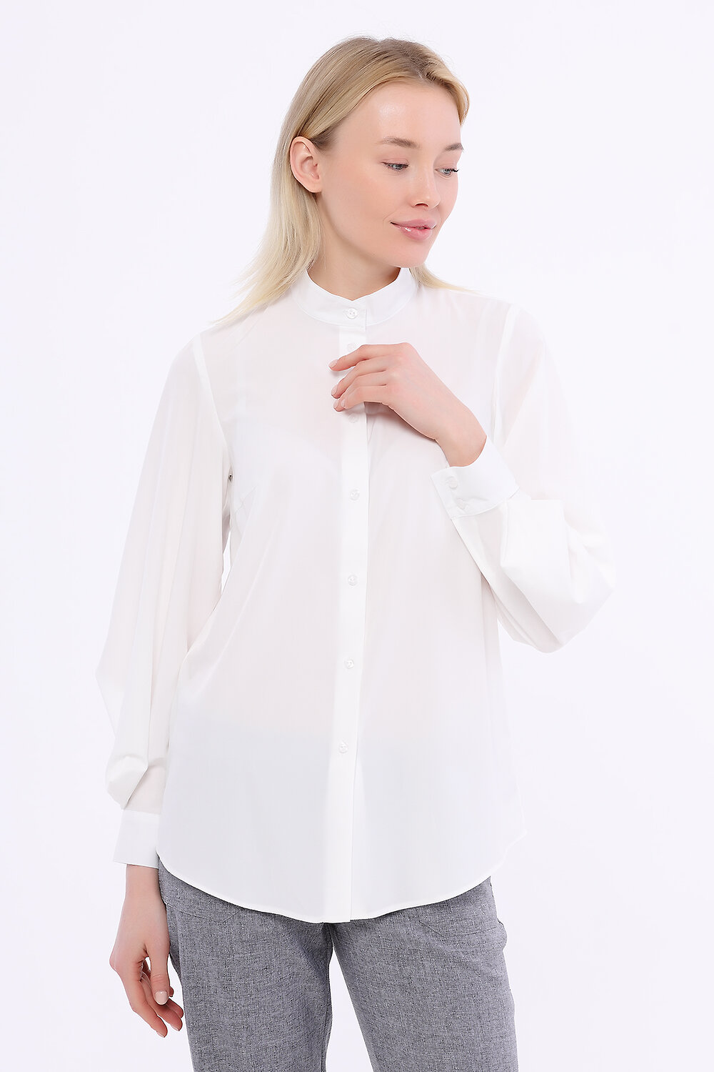 Приталенная блузка с объёмными рукавами - беспроигрышный вариант для весенней поры. Аккуратный воротник-стойка и длинные рукава на манжете с декоративной складкой составляют строгий и современный стиль. Ткань блузки лёгкая и воздушная, что придаёт образу утончённости и элегантности. Блузка с фигурным низом приятна к телу, её захочется надеть на самые разные мероприятия.
