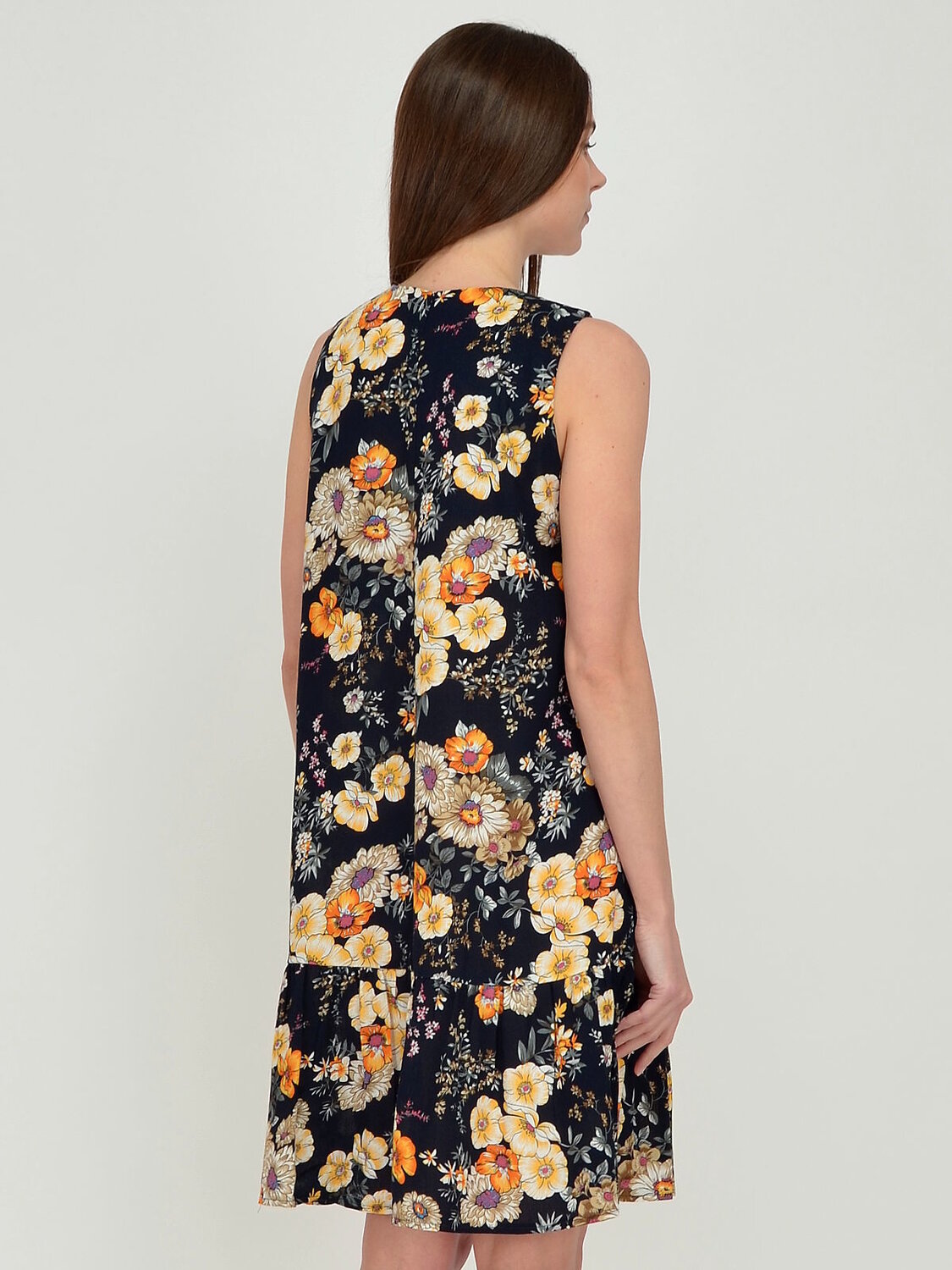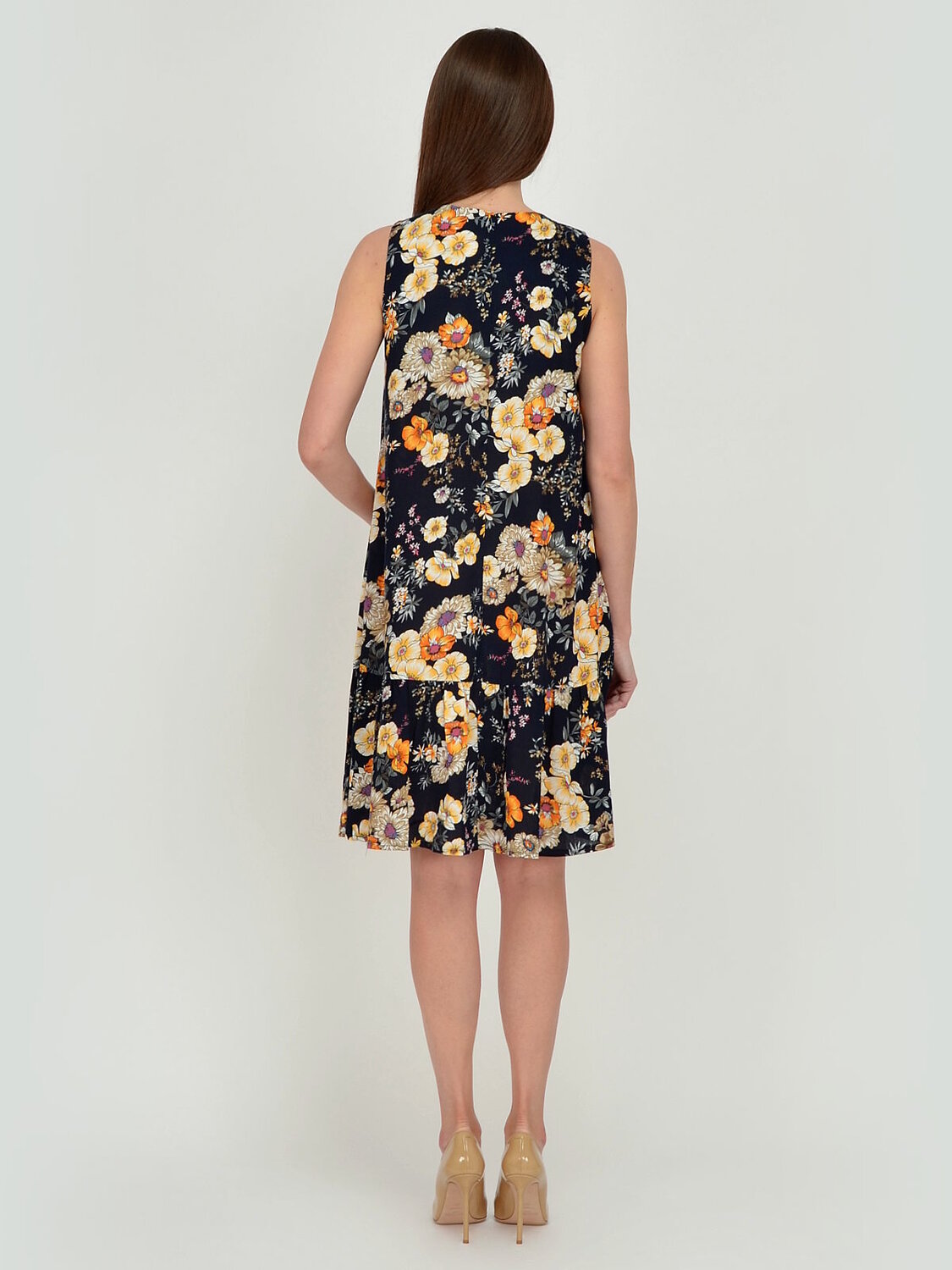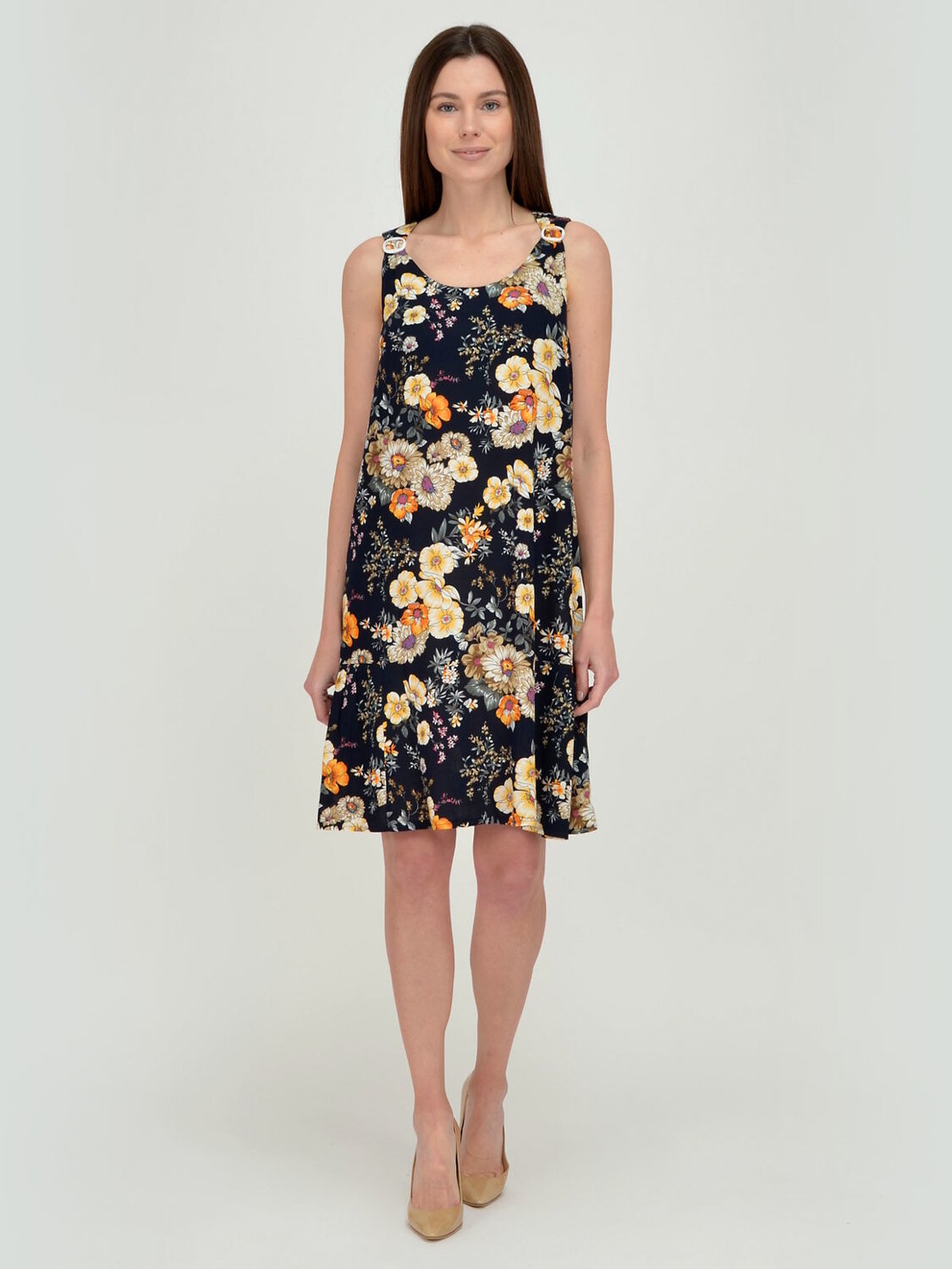 Платье женское без рукавов свободного силуэта.В низу по бокам вшиты воланы. Пряжки регулируют ширину лямок.