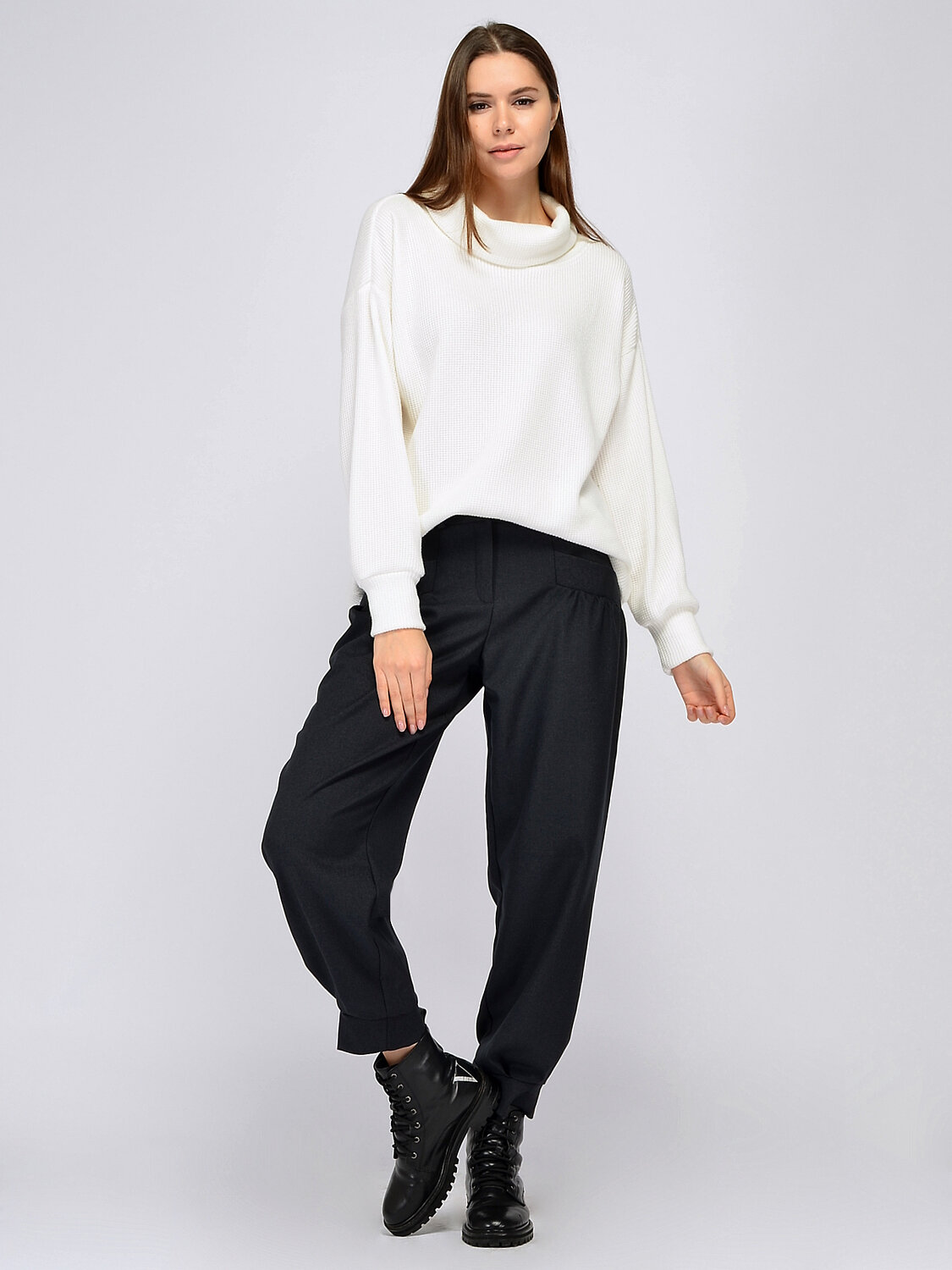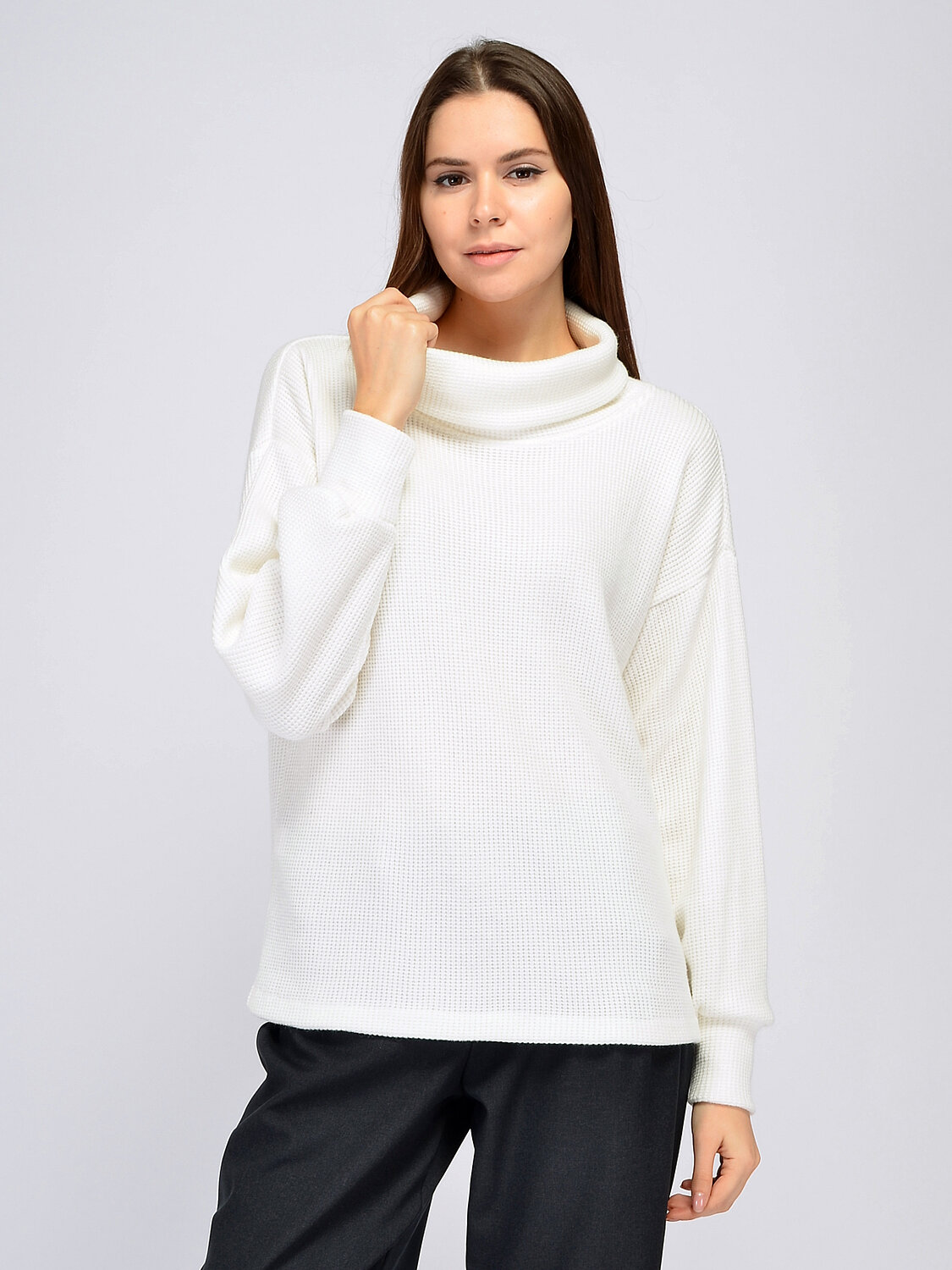 Джемпер с воротником хомутом. Невозможно представить осеннюю и зимнюю пору без уютного и комфортного свитера силуэта оверсайз с крупным воротником. Идеальный силуэт джемпера гармонично дополнит и офисный, и городской образы. Вам не захочется снимать эту вещь, поскольку она выполнена из приятного к телу материала и выглядит идеально. Вырез горловины круглый. Воротник хомут. Рукава длинные. Рукава втачные. Без застежки. Крой прямой. Рекомендована стирка при температуре не более 30С. Свободный джемпер с длинными рукавами носите навыпуск или заправляйте за пояс. Универсальный фасон одинаково удачно сочетается как с классическими вещами, так и с повседневными. Для придания образу торжественности наденьте на шею крупное украшение. Обувь выбирайте исходя из собственных предпочтений и мероприятия.
