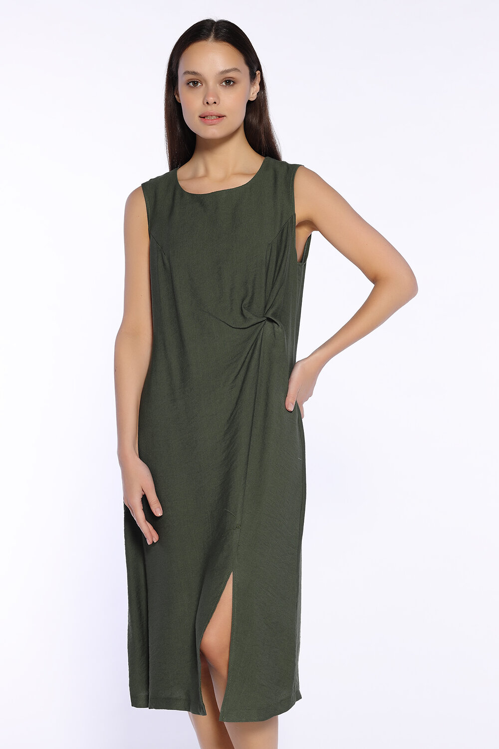 Лёгкое платье миди с разрезом создано для летнего гардероба современной девушки. Лаконичный силуэт, округлый вырез горловины, декоративная складка на линии талии и эффектный разрез на передней части платья создают элегантный и женственный образ. В составе платья хлопок, что позволит Вам чувствовать себя комфортно даже в жаркую погоду. Длина миди подходит любому типу фигуры.