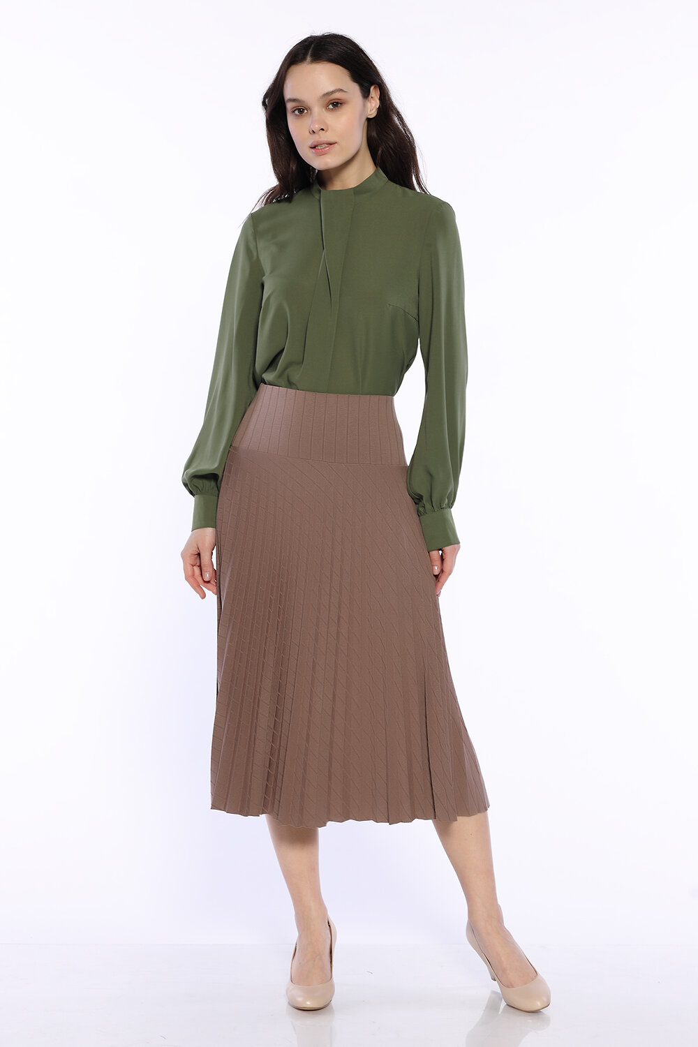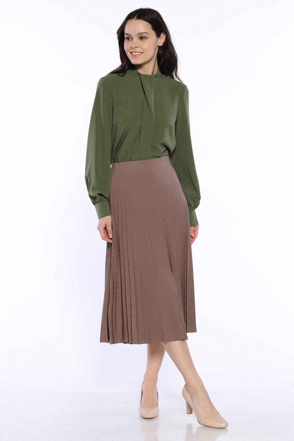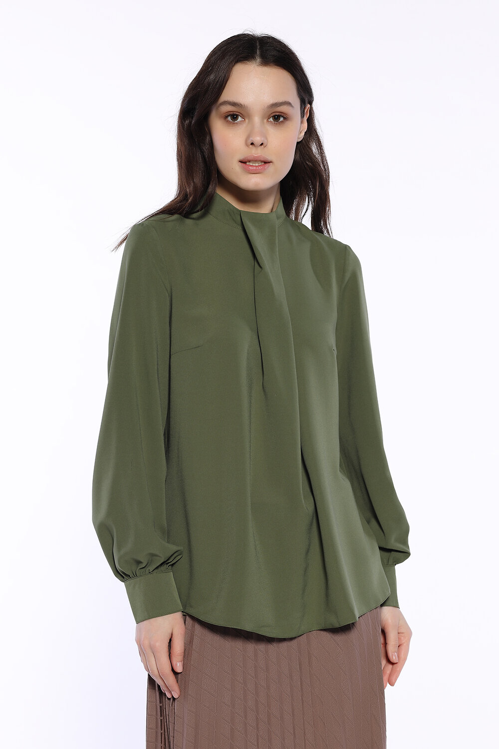 Блузка женская прямого силуэта.Рукав длинный на манжете. Воротник-стойка с застежкой на пуговицы. На передней полочке декоративная складка.