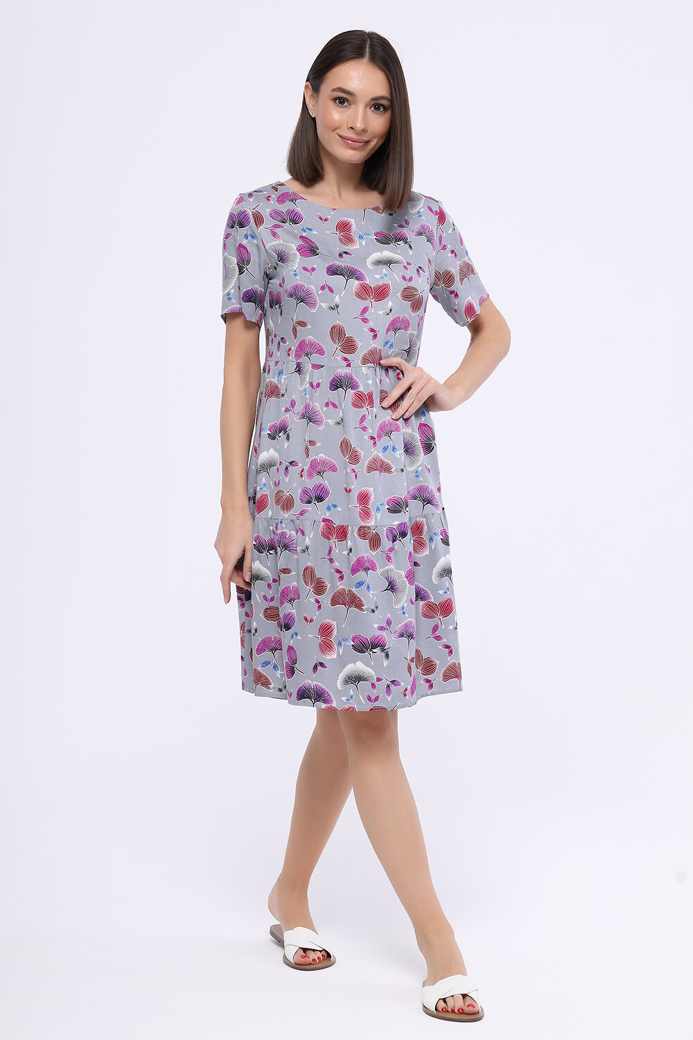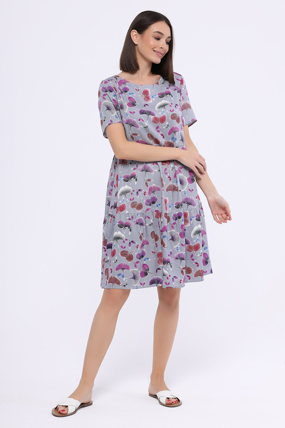 В составе платья хлопок 50%, вискоза 50%. Вырез горловины - круглый. Рукав короткий. Длина мини. Крой прямой. Свободный силуэт. Без карманов. Рукав втачной. Рекомендована стирка при температуре не более 30С.