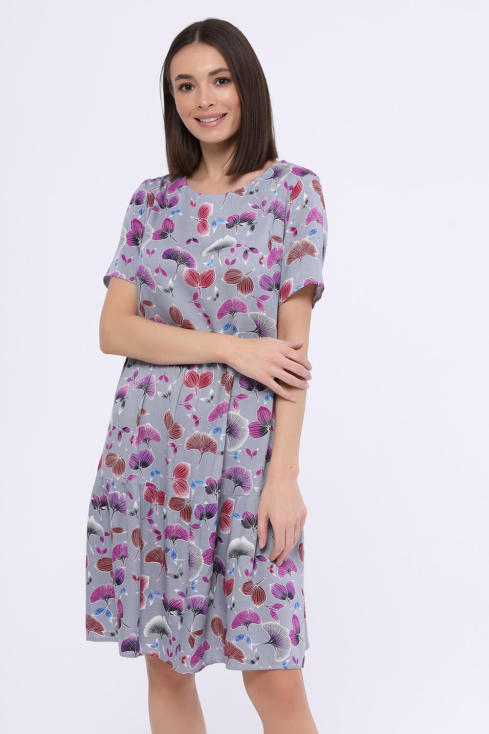 В составе платья хлопок 50%, вискоза 50%. Вырез горловины - круглый. Рукав короткий. Длина мини. Крой прямой. Свободный силуэт. Без карманов. Рукав втачной. Рекомендована стирка при температуре не более 30С.