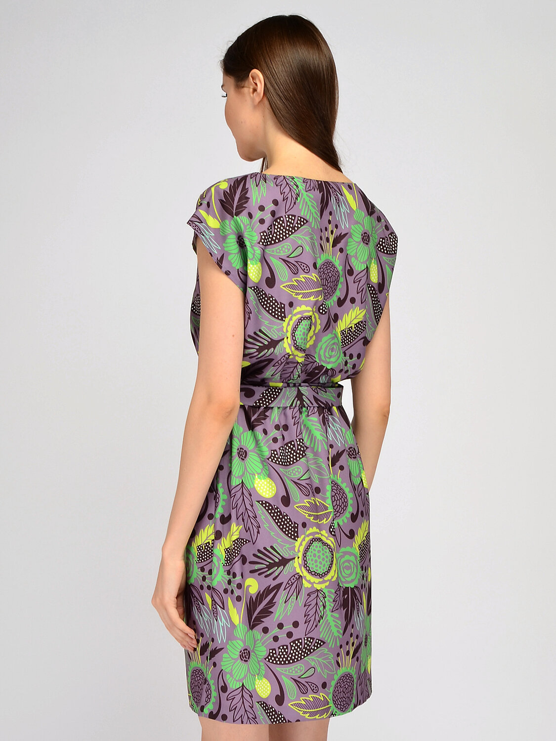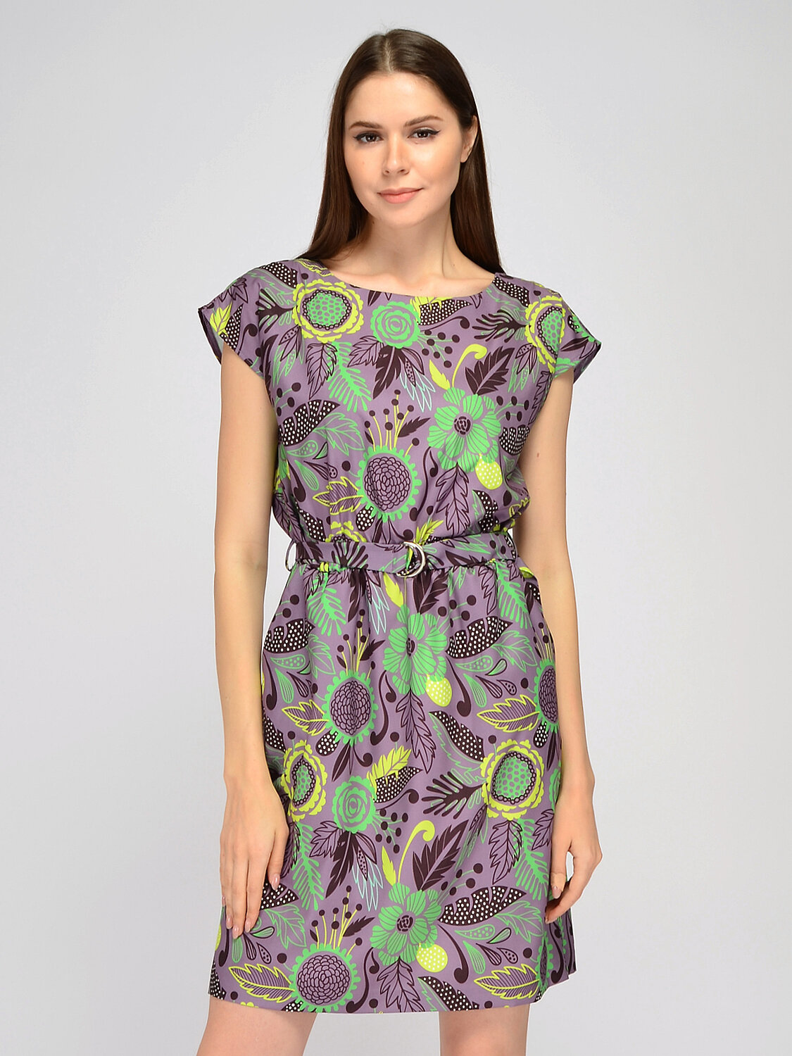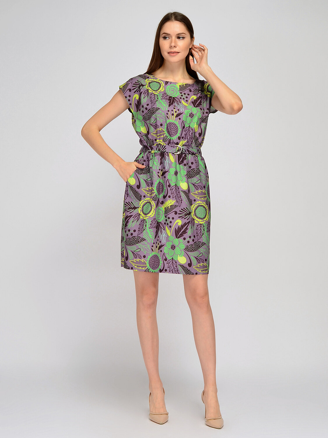 В составе платья полиэстер 50%, вискоза 50%. Вырез горловины - круглый. Рукав короткий. Комплектация - пояс. Без застёжки. Длина - миди. Крой расклешенный к низу. Модель платья - приталенное. Карманы втачные. Рукав цельнокроеный. Длина миди. Рекомендована стирка при температуре не более 30С.