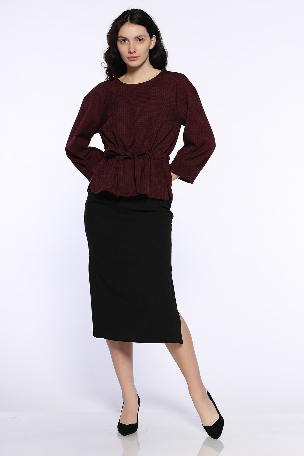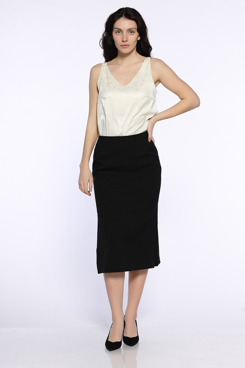 Классическая расклешенная юбка миди с разрезами по бокам найдет место в Вашем осеннем гардеробе. Универсальный фасон позволит составить с ней деловые офисные и праздничные образы. Выбирайте обувь на высоком или низком ходу, а блузку, рубашку или топ желательно носить заправленными за пояс. Свободный фасон скроет возможные недостатки фигуры в зоне бедер.