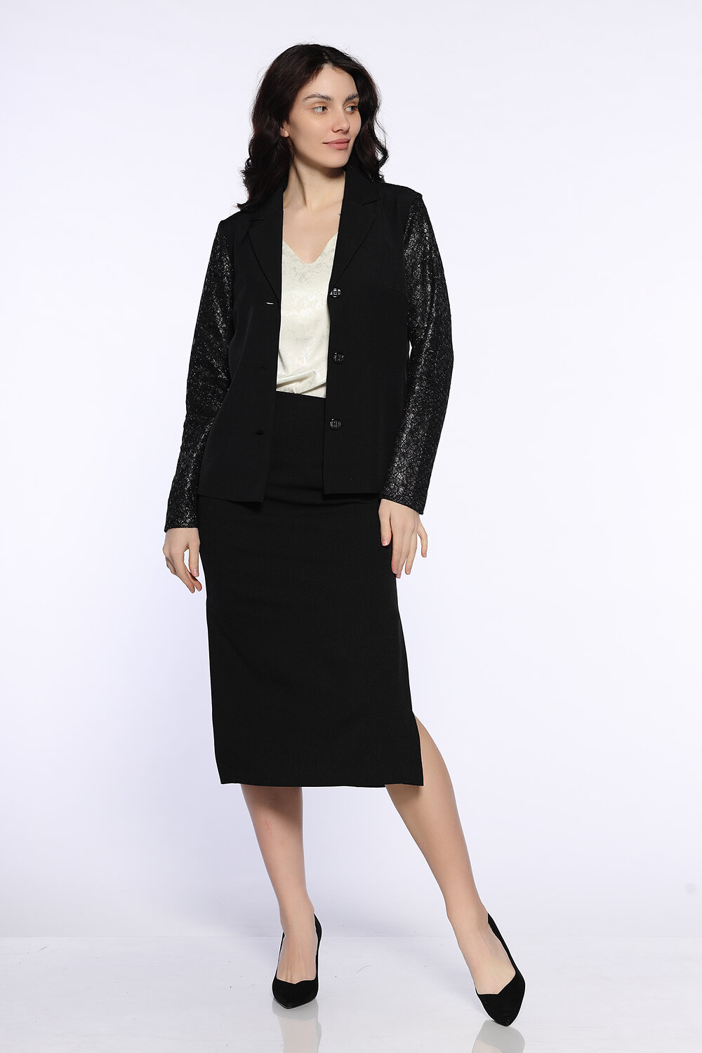 Классическая расклешенная юбка миди с разрезами по бокам найдет место в Вашем осеннем гардеробе. Универсальный фасон позволит составить с ней деловые офисные и праздничные образы. Выбирайте обувь на высоком или низком ходу, а блузку, рубашку или топ желательно носить заправленными за пояс. Свободный фасон скроет возможные недостатки фигуры в зоне бедер.