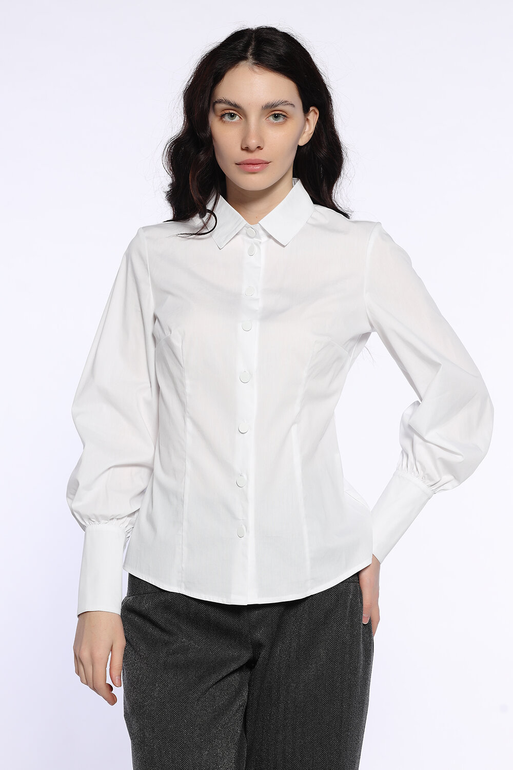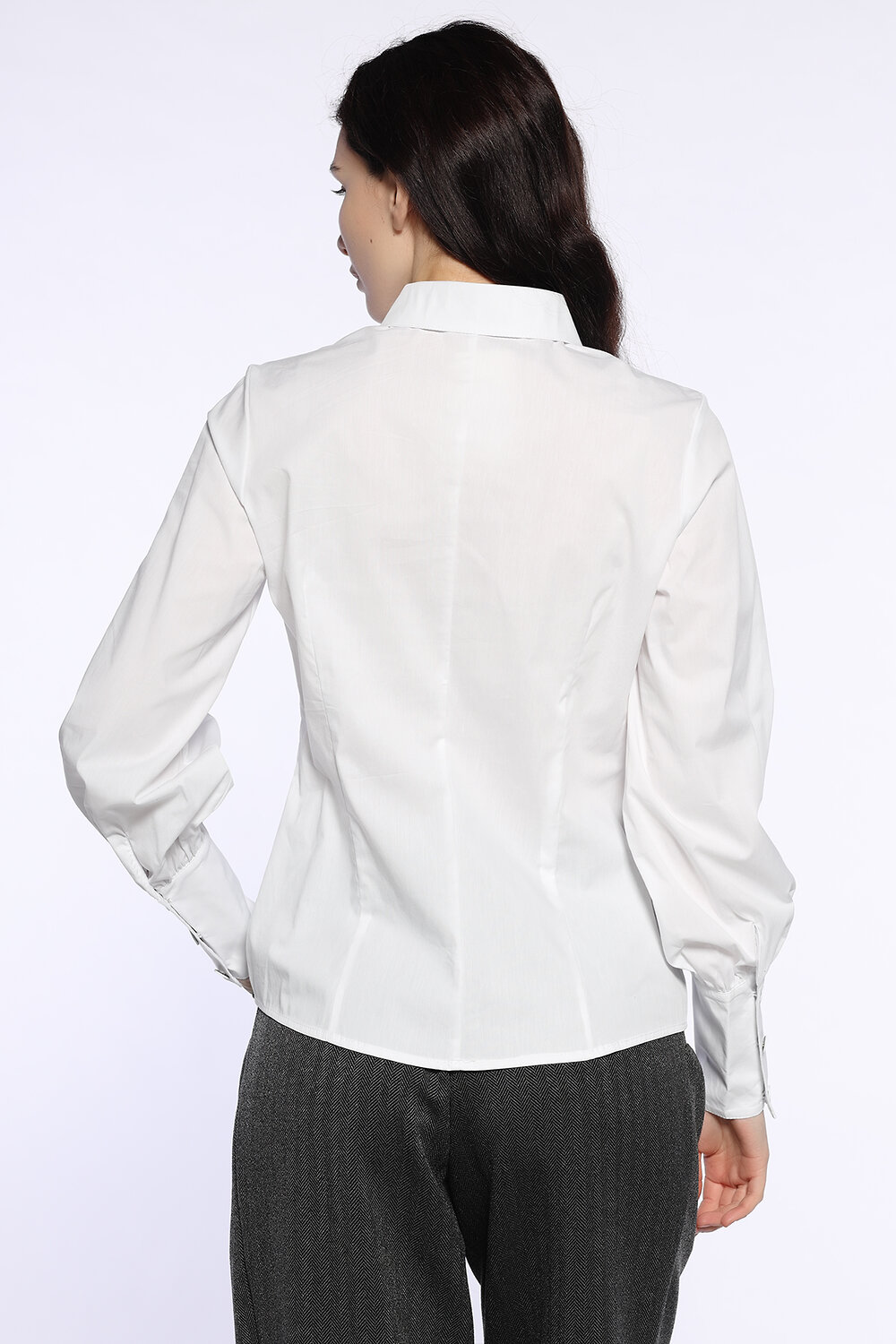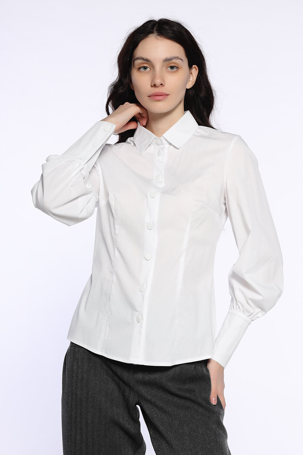 Классическая женская блузка рубашка с отложным воротником и длинными объемными рукавами станет очаровательным дополнением осенних образов в офис, на праздник или в театр. Лаконичный приталенный фасон блузки дополнен пышными рукавами с удлиненными манжетами и складками, придавая образу изысканности. Универсальная блузка впишется и в строгий, и в повседневный стиль в зависимости от подобранных вещей и аксессуаров.