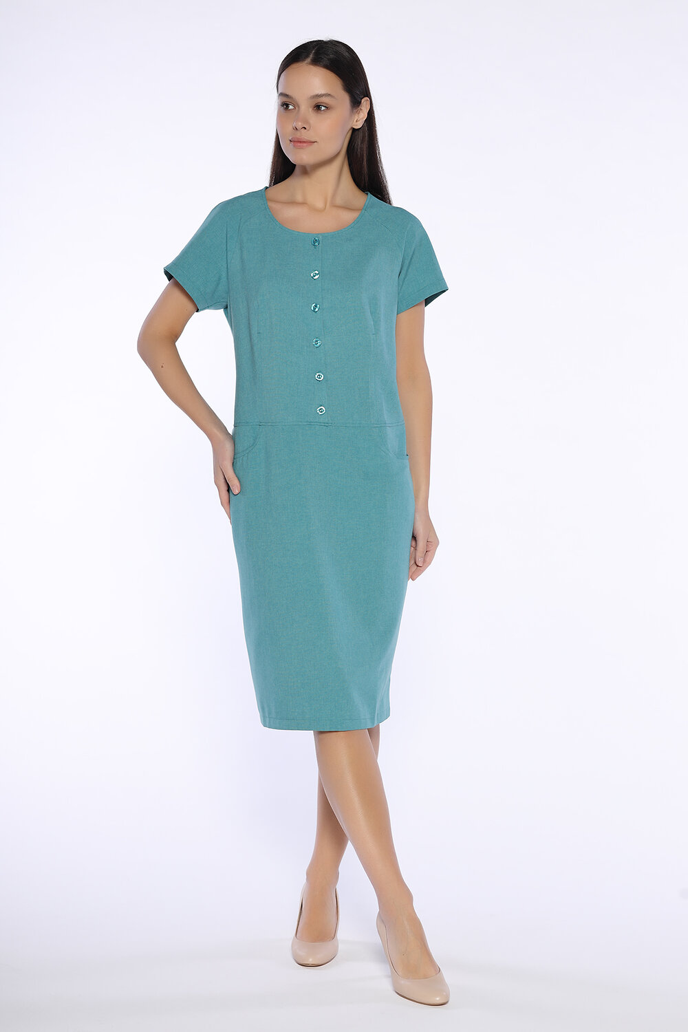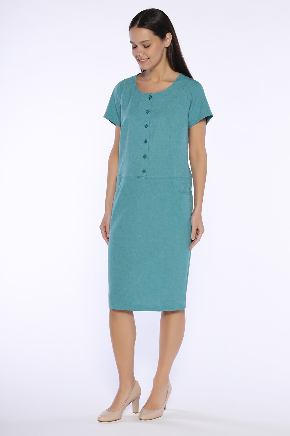 Платье миди с короткими рукавами. Лаконичное платье миди с короткими рукавами формы реглан идеально подойдёт для офисного или повседневного гардероба в теплое время года. Округлая горловина и короткие рукава обеспечивают ощущение максимального комфорта. Прямое платье миди застёгивается на пуговицы, а также на передней части платья расположены карманы в шве. Вырез горловины круглый. Без отделки горловины. Рукава короткие. Тип рукава реглан. Вид застежки пуговицы. Конструктивный элемент разрез. Крой прямой. Карманы в шве. Длина миди. Рекомендована стирка при температуре не более 30С. Платье миди с карманами гармонично дополнит и деловой образ, и повседневный, и торжественный. Обувь на высоком ходу и изящные украшения помогут создать офисный и романтичный образы. Открытая обувь на низком ходу и сумка шоппер завершат стильный городской образ в стиле кэжуал.