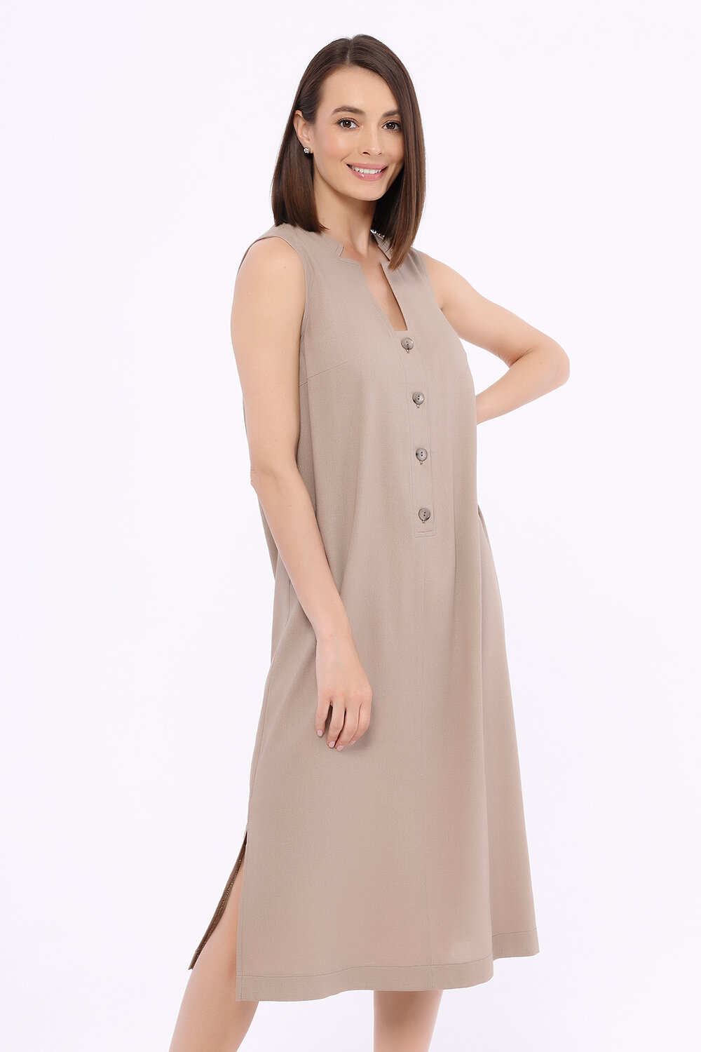 Прямое платье миди без рукавов - идеальная модель для лета. В составе платья лён, благодаря которому Вы будете чувствовать себя максимально комфортно в жаркое время года. Лаконичный фасон дополнен изысканным фигурным воротником, притягивающим взгляды. Платье застёгивается на пуговицы, расположенные на передней части платья. По бокам платья миди снизу располагаются небольшие декоративные разрезы.