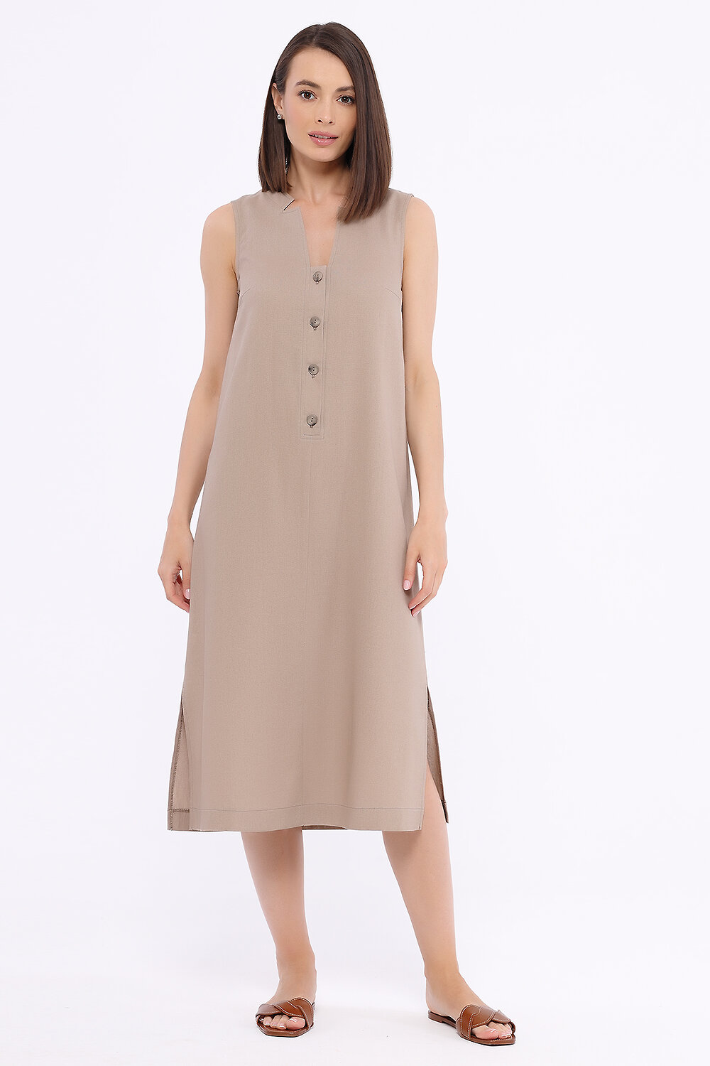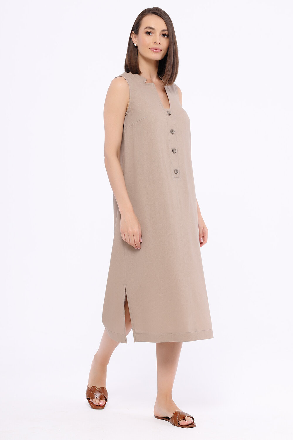 В составе платья вискоза 70%, лён 30%. Вырез горловины - фигурный. Без рукава. Вид застёжки - пуговицы. Декоративный элемент - разрез. Длина миди. Крой прямой. Без карманов. Рекомендована стирка при температуре не более 30С.