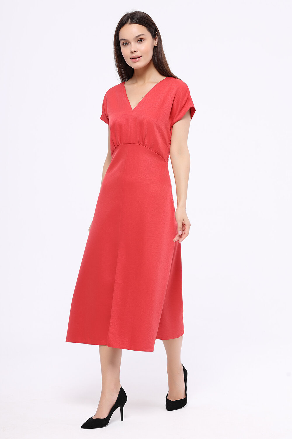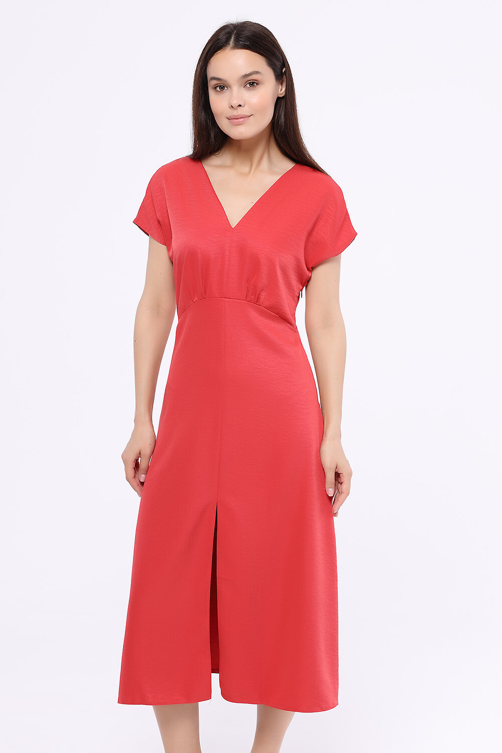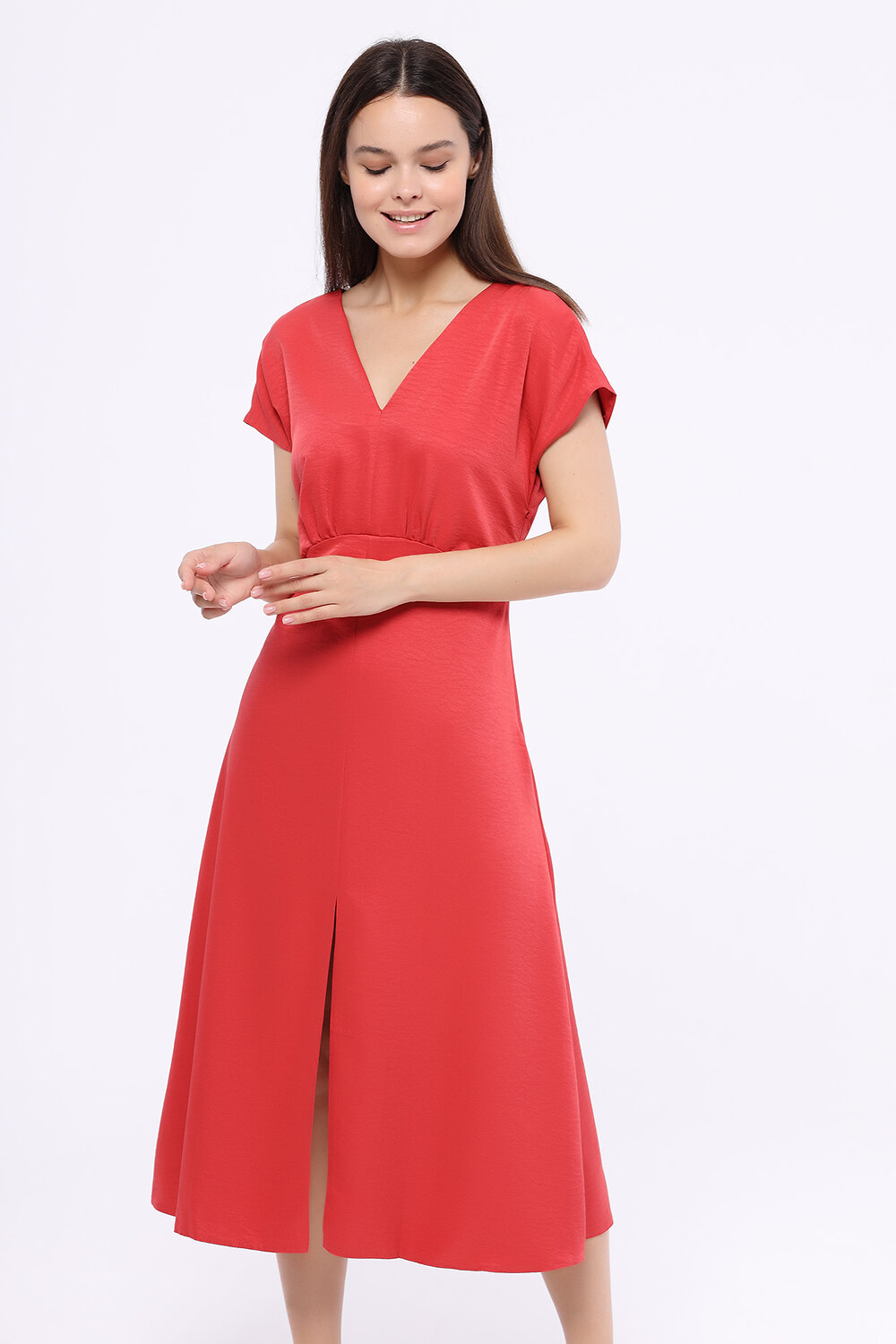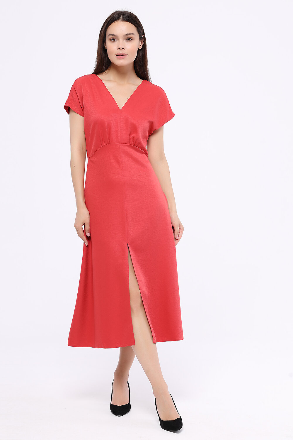 Если Вы ищете изящное летнее платье на выход, выбирайте платье миди с разрезом. Деликатный V-образный вырез акцентирует внимание на ключице, а глубокий разрез на передней части платья будет притягивать взгляды к Вашей походке. Верхняя и нижняя часть платья разделены швом с декоративными складками на линии талии, визуально сужая её.