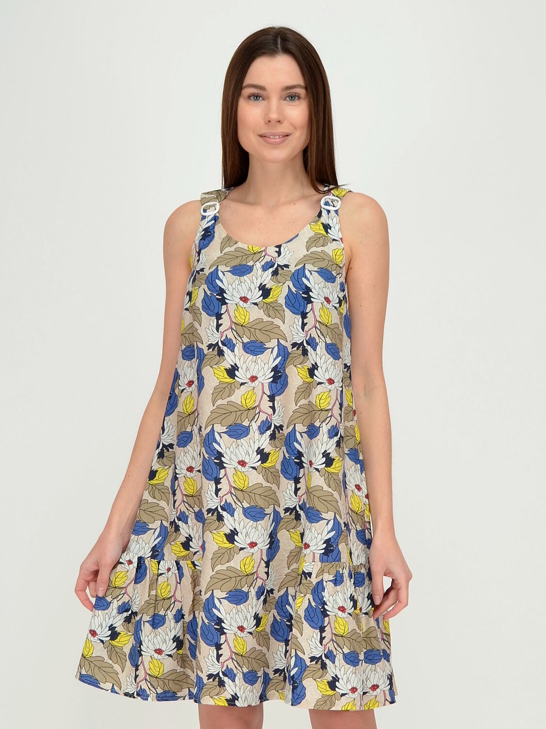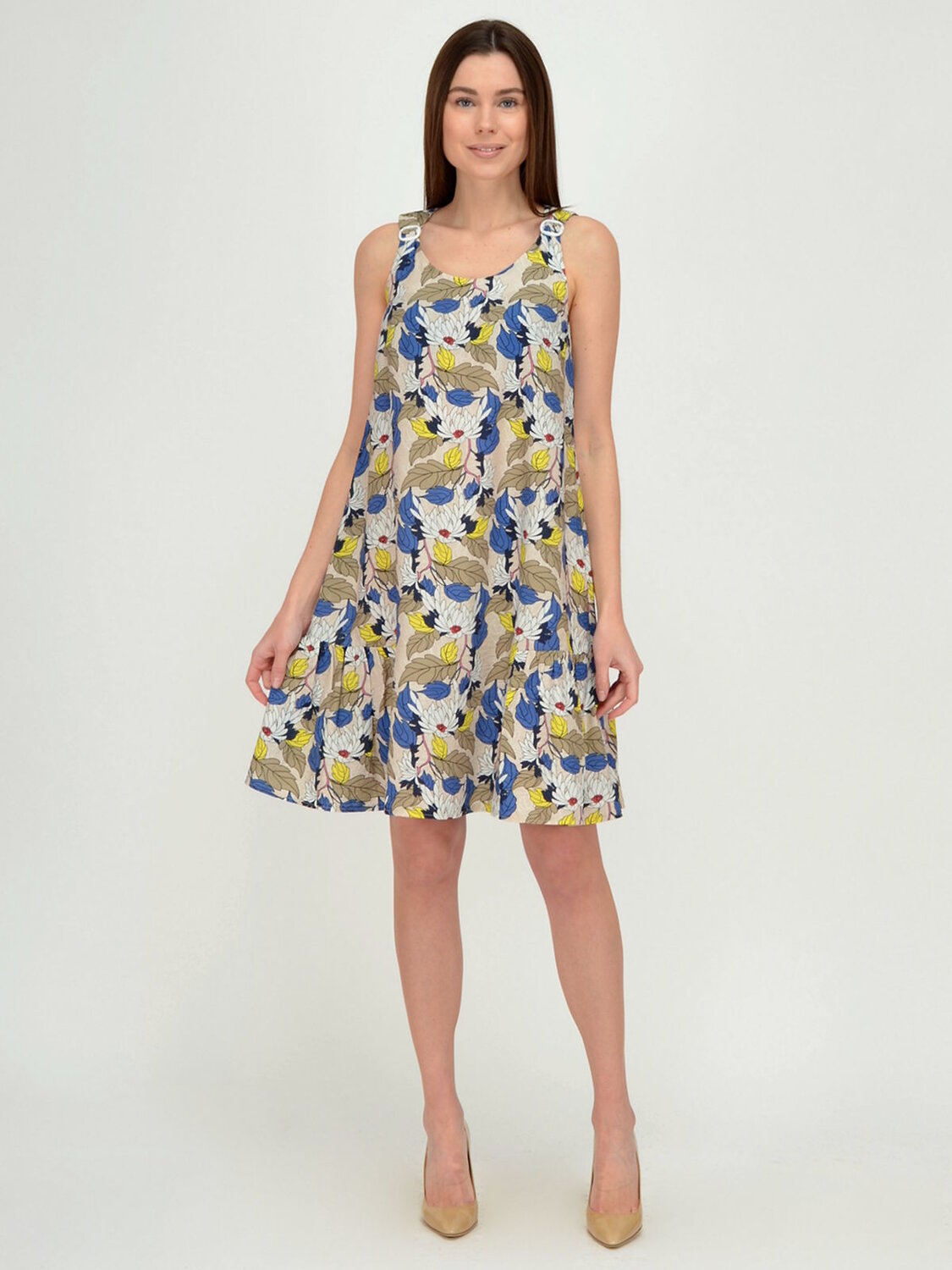 Платье женское без рукавов свободного силуэта.В низу по бокам вшиты воланы. Пряжки регулируют ширину лямок.