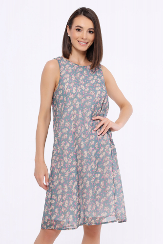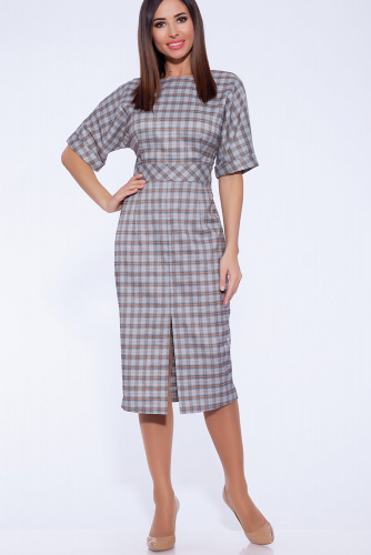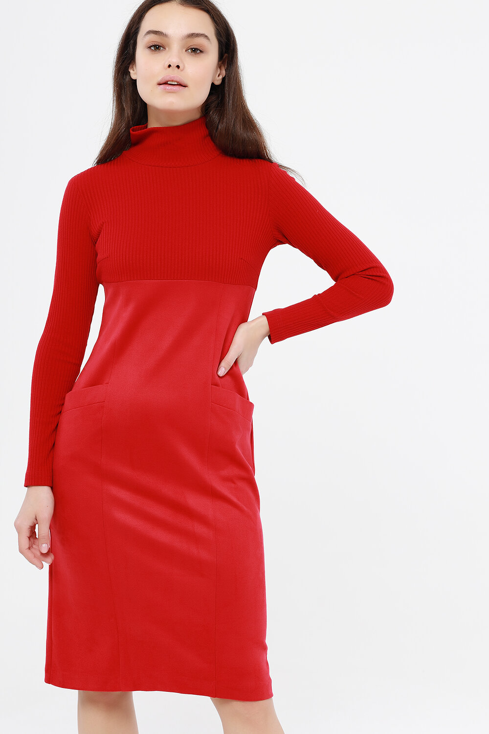 Платье женское, комбинированное. Рукав длинный. Воротник-стойка. На полочке карманы с листочкой .