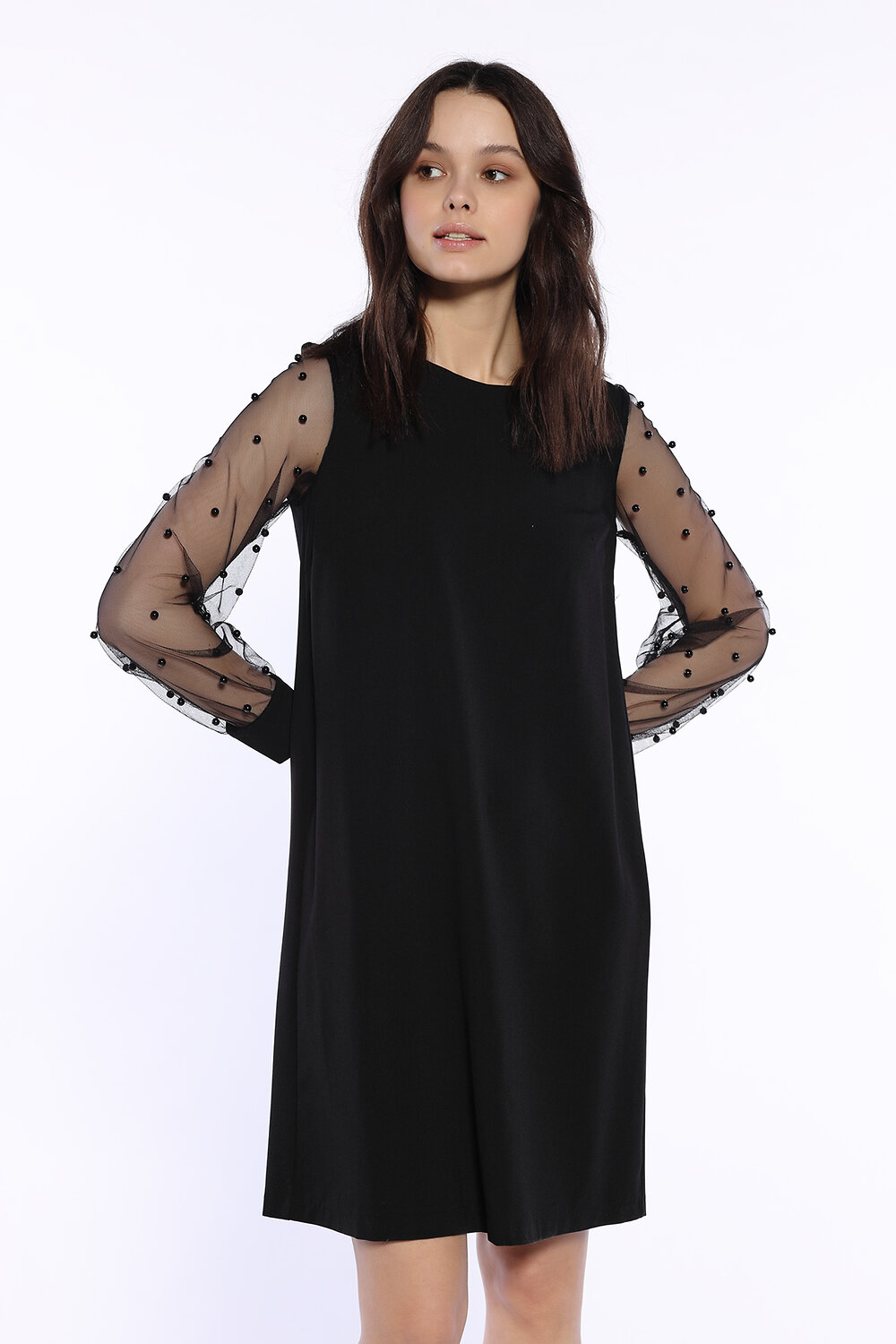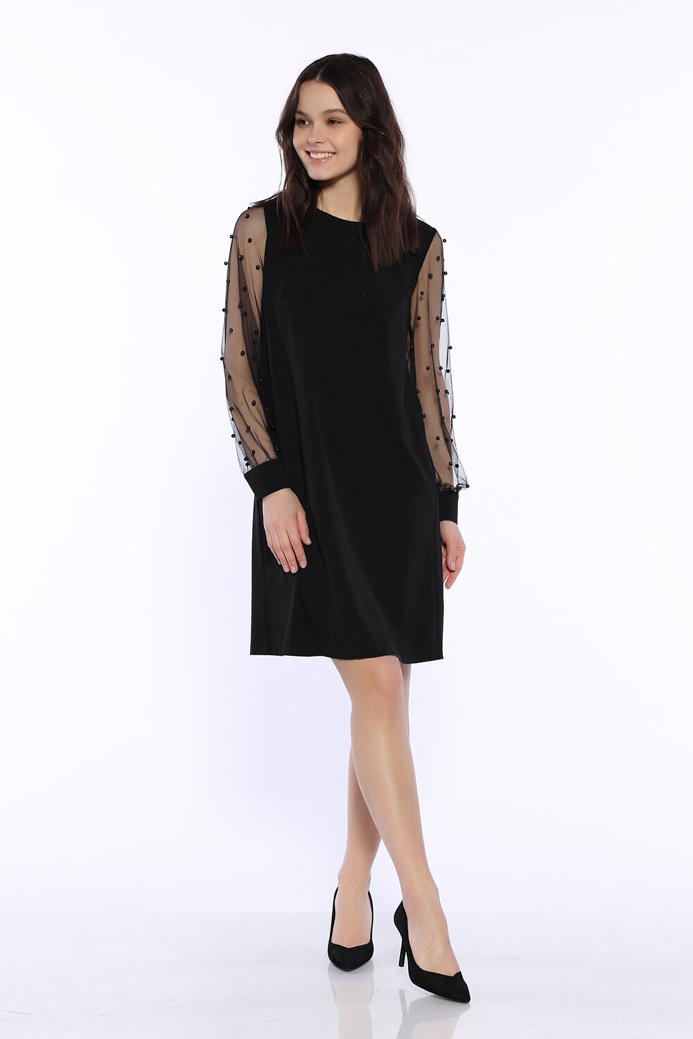 Изящное платье мини приталенного кроя станет отличным решением для праздничного и вечернего образа. Лаконичный крой без рисунков и принта дополнен эффектным элементом в виде прозрачных рукавов, которые декорированы небольшими бусинами. Манжеты выполнены в тон платья, застегиваются на пуговицу. Платье миди с округлым вырезом горловины выпускается в широком размерном ряду, оно замечательно подойдет на любую фигуру, в том числе на большой размер. Выразительное платье выше колена можно дополнить украшениями и аксессуарами, чтобы завершить нарядный образ для праздника, свадьбы, дня рождения, нового года. В качестве обуви к платью подходят различные по стилю и фасону модели: туфли, ботильоны, сапоги, ботинки. Платье с длинным рукавом из сетки имеет полуприлегающий свободный крой, не облегает фигуру и может скрыть ее возможные недостатки. Элегантный фасон подойдет и взрослым женщинам, и молодым девушкам. Успейте порадовать себя стильной новинкой по привлекательной цене!