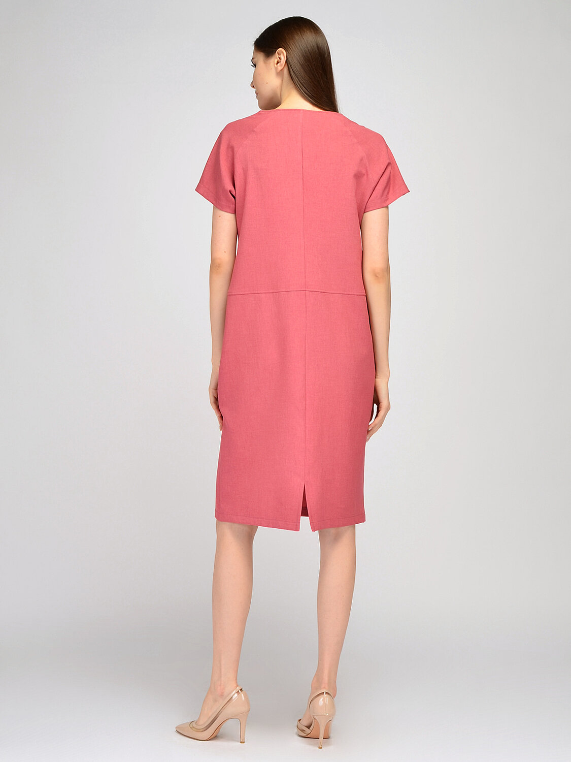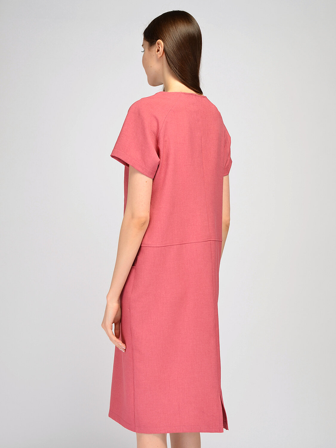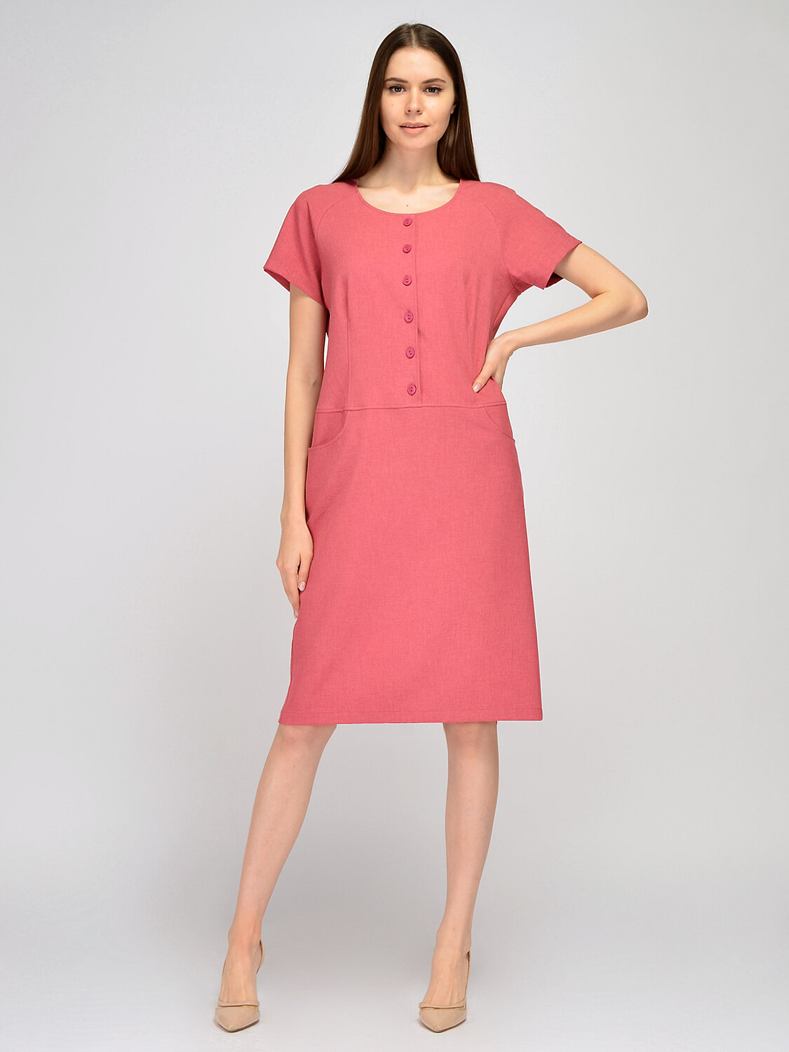 Платье миди с короткими рукавами. Лаконичное платье миди с короткими рукавами формы реглан идеально подойдёт для офисного или повседневного гардероба в теплое время года. Округлая горловина и короткие рукава обеспечивают ощущение максимального комфорта. Прямое платье миди застёгивается на пуговицы, а также на передней части платья расположены карманы в шве. Вырез горловины круглый. Без отделки горловины. Рукава короткие. Тип рукава реглан. Вид застежки пуговицы. Конструктивный элемент разрез. Крой прямой. Карманы в шве. Длина миди. Рекомендована стирка при температуре не более 30С. Платье миди с карманами гармонично дополнит и деловой образ, и повседневный, и торжественный. Обувь на высоком ходу и изящные украшения помогут создать офисный и романтичный образы. Открытая обувь на низком ходу и сумка шоппер завершат стильный городской образ в стиле кэжуал.