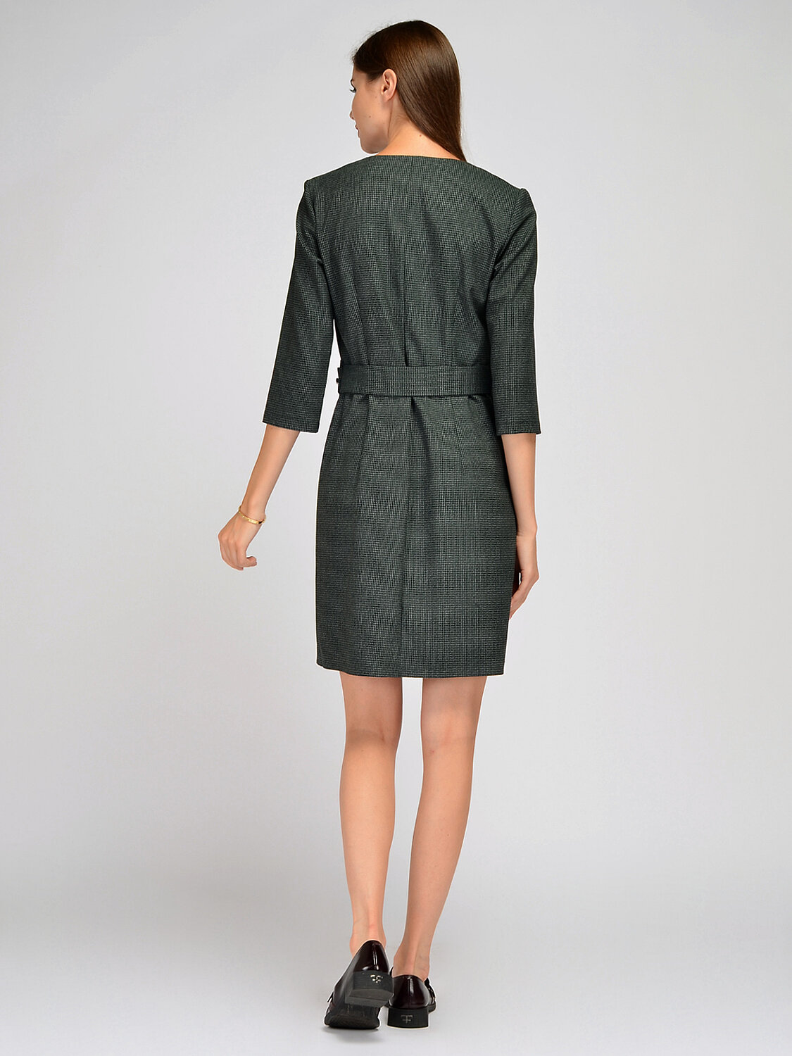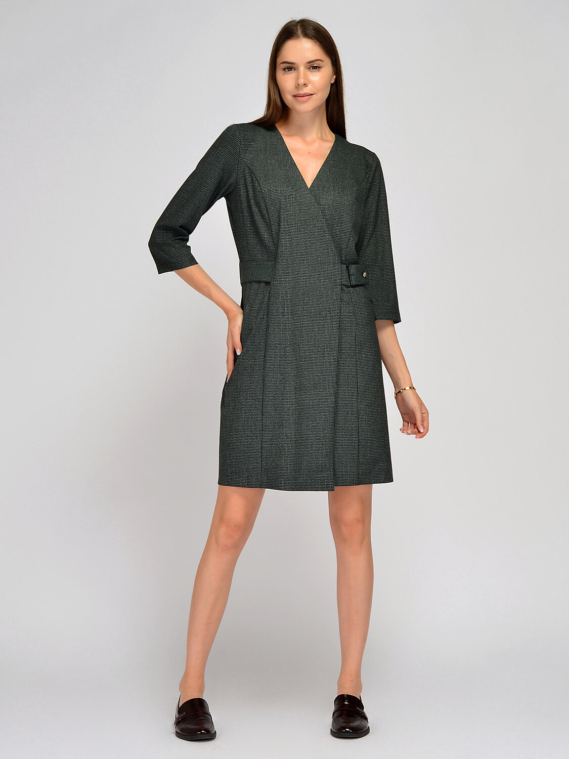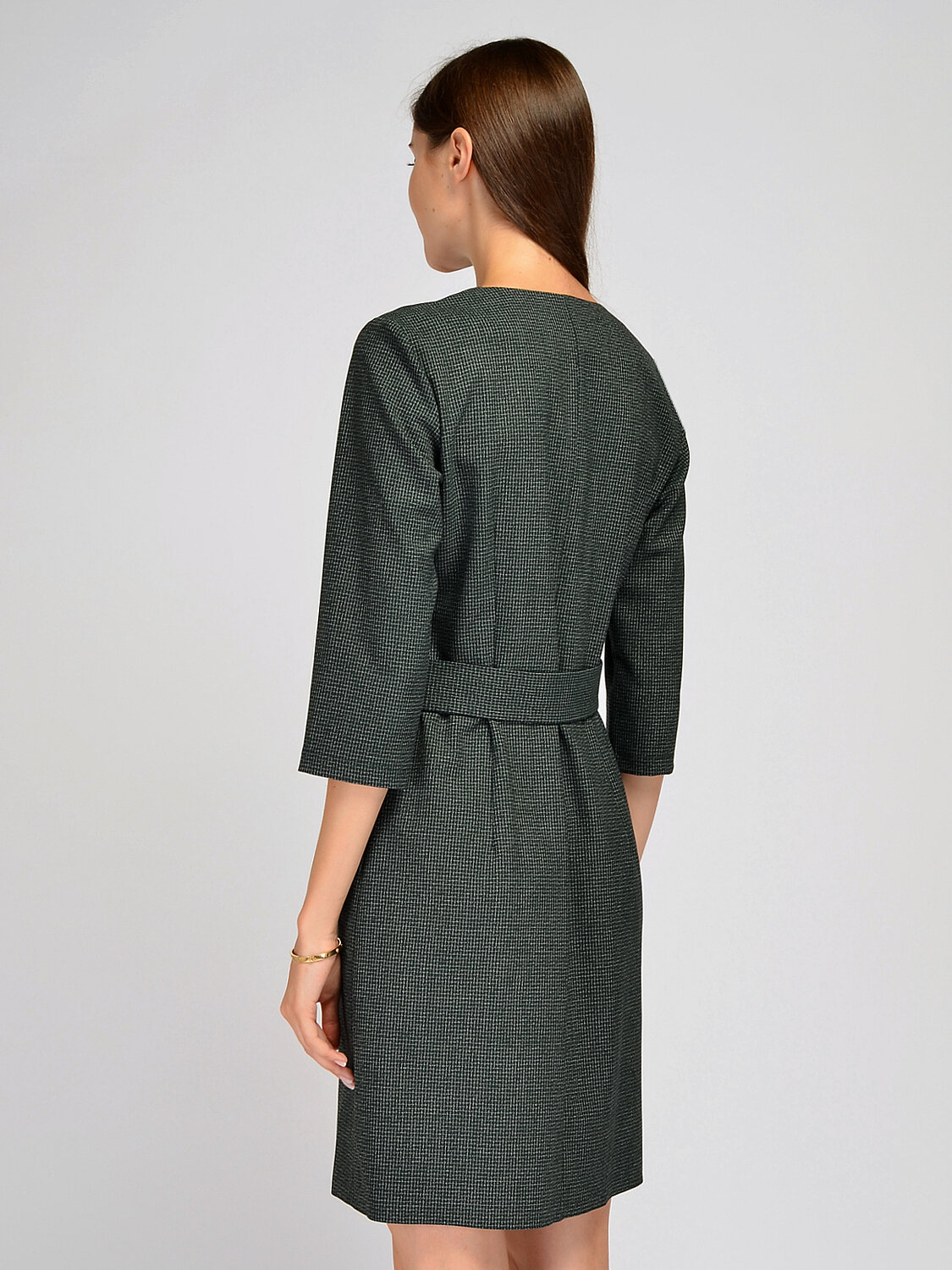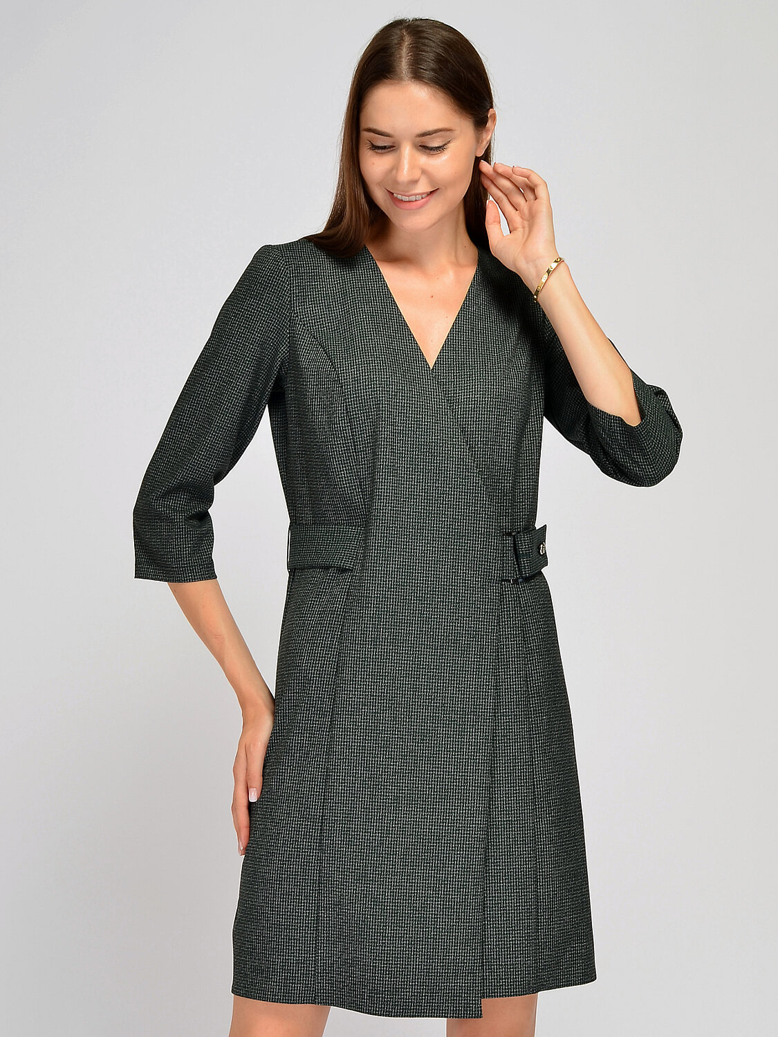 Стильное женское офисное платье приталенного силуэта имеет V-образный вырез горловины, рукав три четверти, регулируемый с помощью пуговиц пояс, который выгодно подчеркивает талию. Это строгое платье отлично подойдет для деловой встречи, торжественного мероприятия, в офис или на каждый день. Платье миди достаточно лаконичное и сдержанное, а значит, его можно дополнить яркими аксессуарами и туфлями на каблуке.