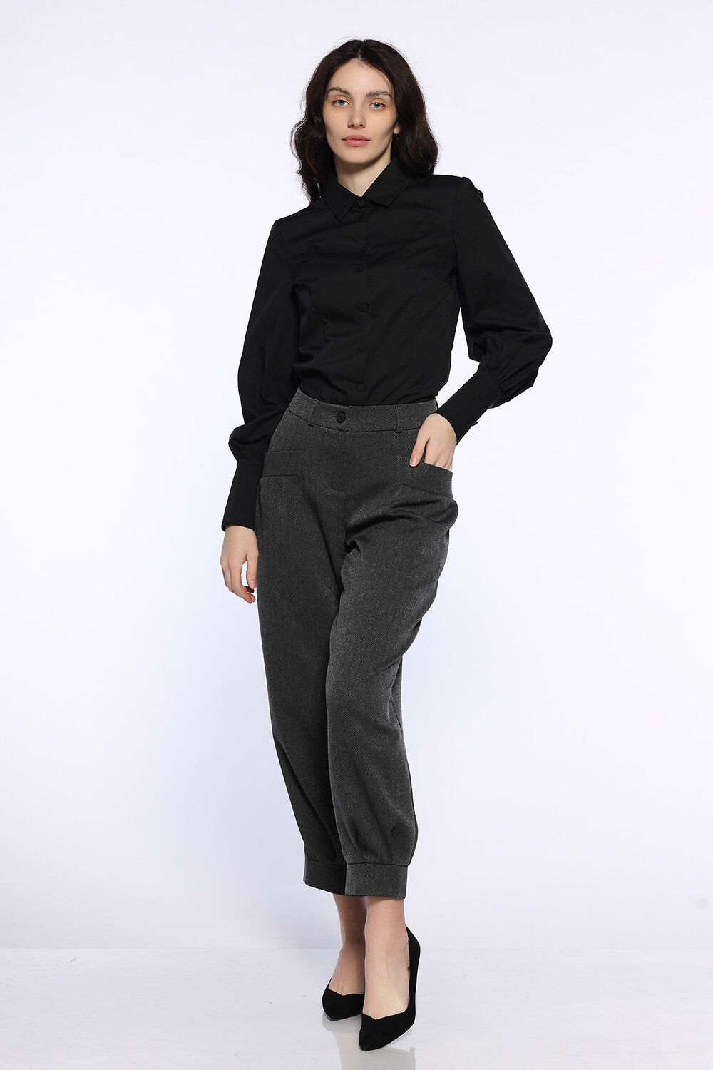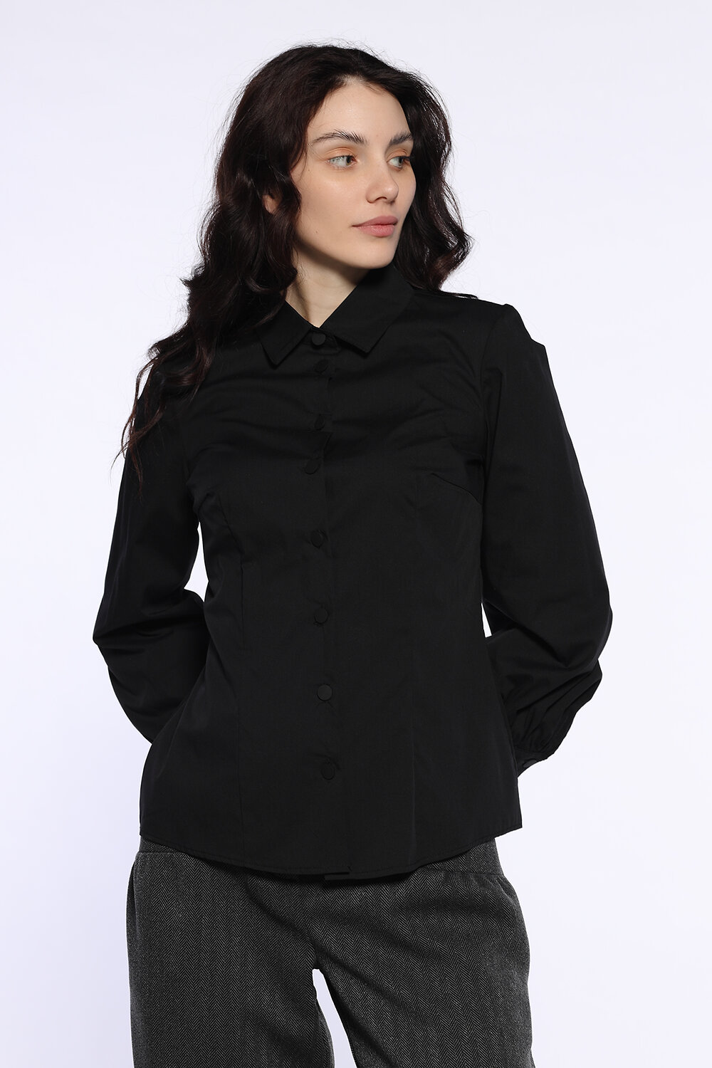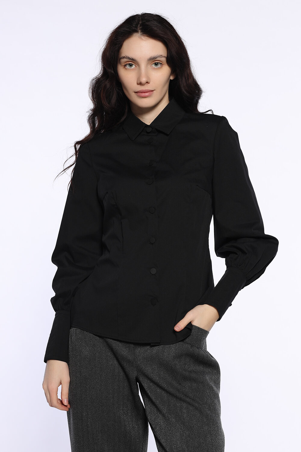Классическая женская блузка рубашка с отложным воротником и длинными объемными рукавами станет очаровательным дополнением осенних образов в офис, на праздник или в театр. Лаконичный приталенный фасон блузки дополнен пышными рукавами с удлиненными манжетами и складками, придавая образу изысканности. Универсальная блузка впишется и в строгий, и в повседневный стиль в зависимости от подобранных вещей и аксессуаров.