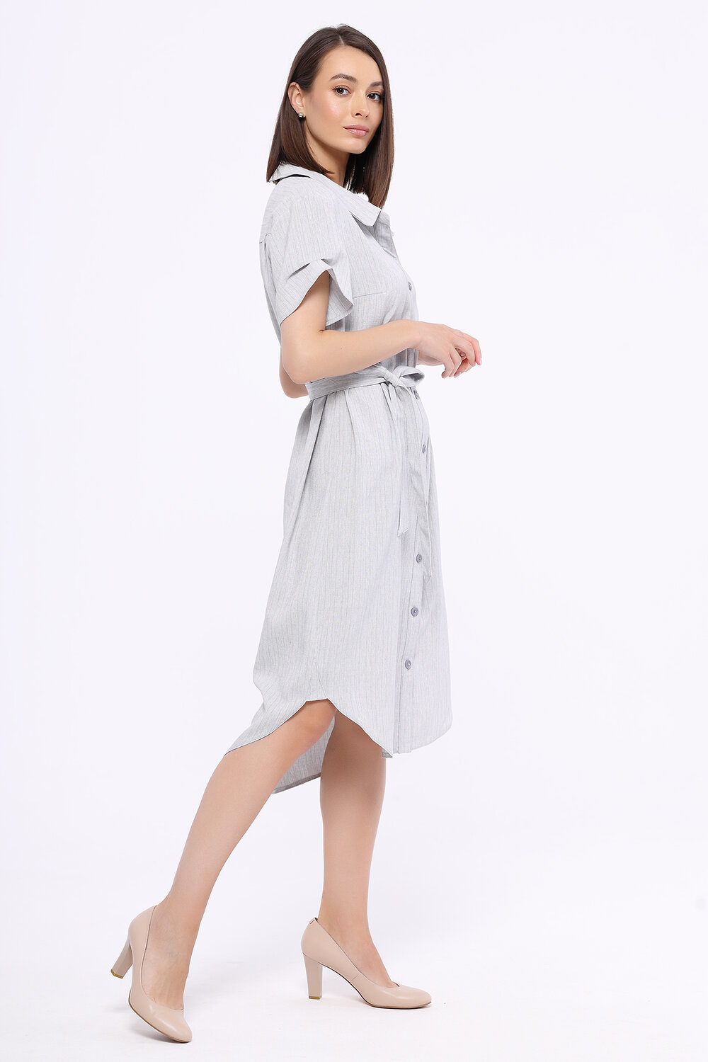 В составе платья-рубашки полиэстер 50%, вискоза 50%. Вырез горловины - круглый. Отделка горловины - воротник. Воротник отложной. Комплектация - пояс. Вид застёжки - пуговицы. Фигурный низ. Рукава короткие. Рукав втачной. Длина миди. Крой прямой. Без карманов. Рекомендована стирка при температуре не более 30С.