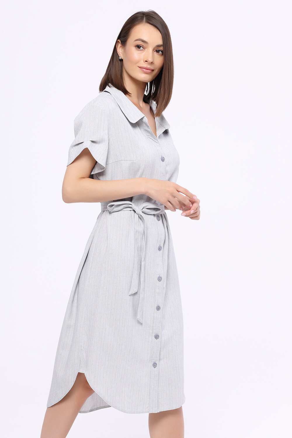 В составе платья-рубашки полиэстер 50%, вискоза 50%. Вырез горловины - круглый. Отделка горловины - воротник. Воротник отложной. Комплектация - пояс. Вид застёжки - пуговицы. Фигурный низ. Рукава короткие. Рукав втачной. Длина миди. Крой прямой. Без карманов. Рекомендована стирка при температуре не более 30С.