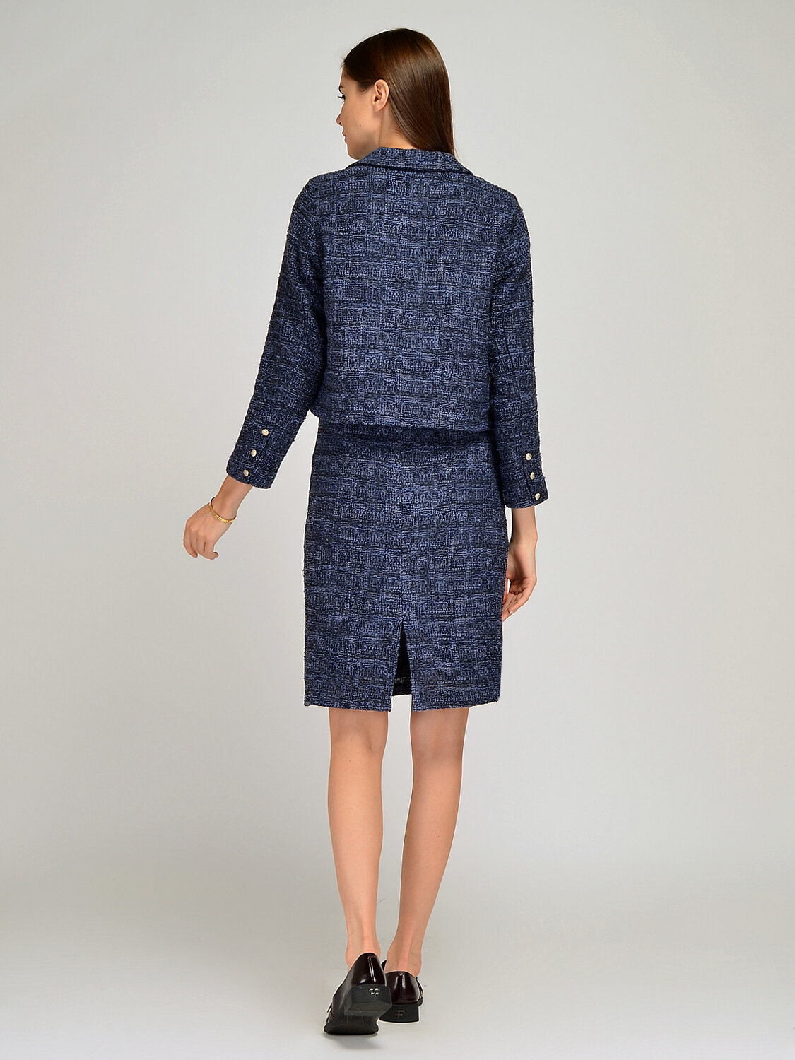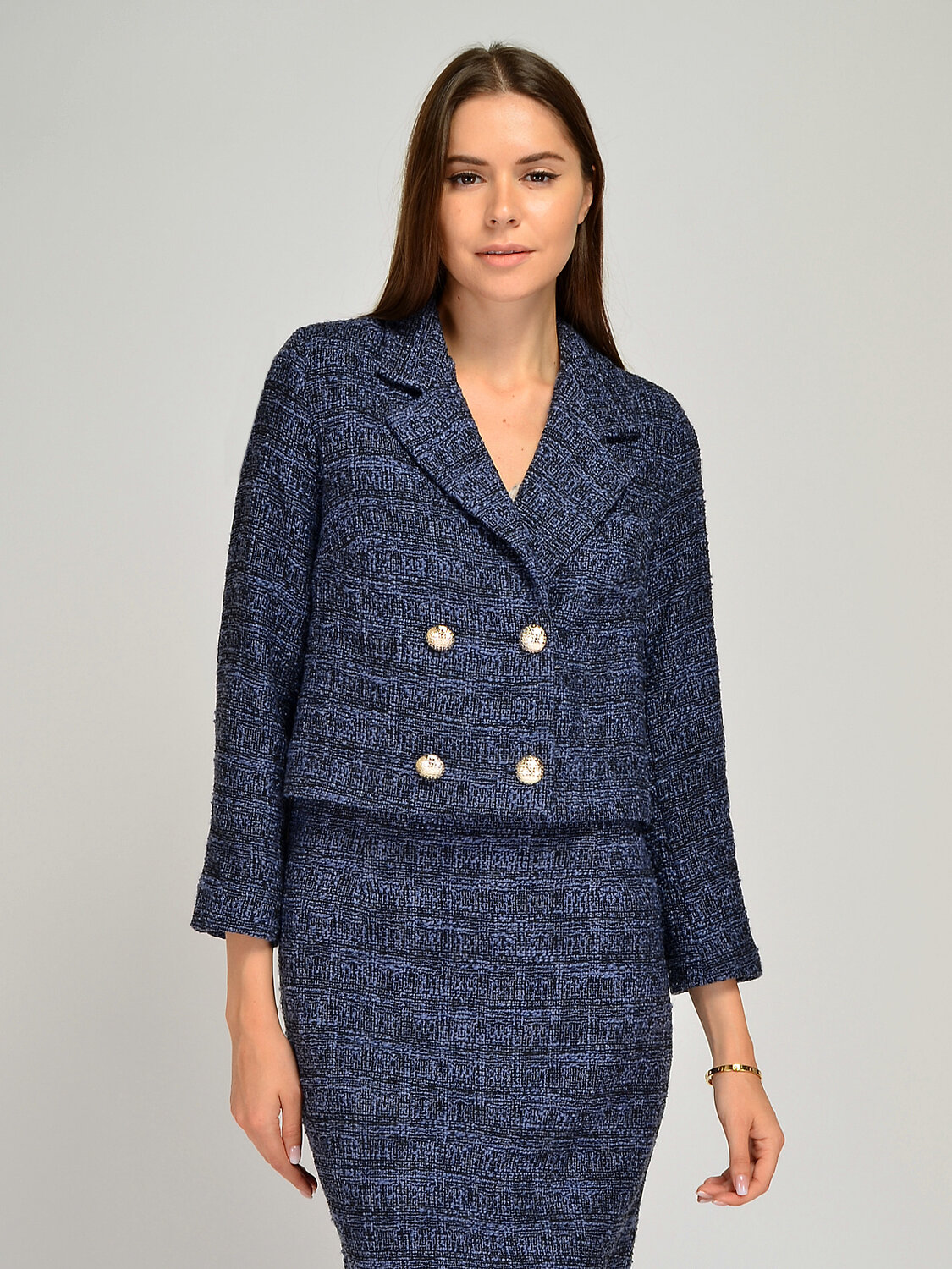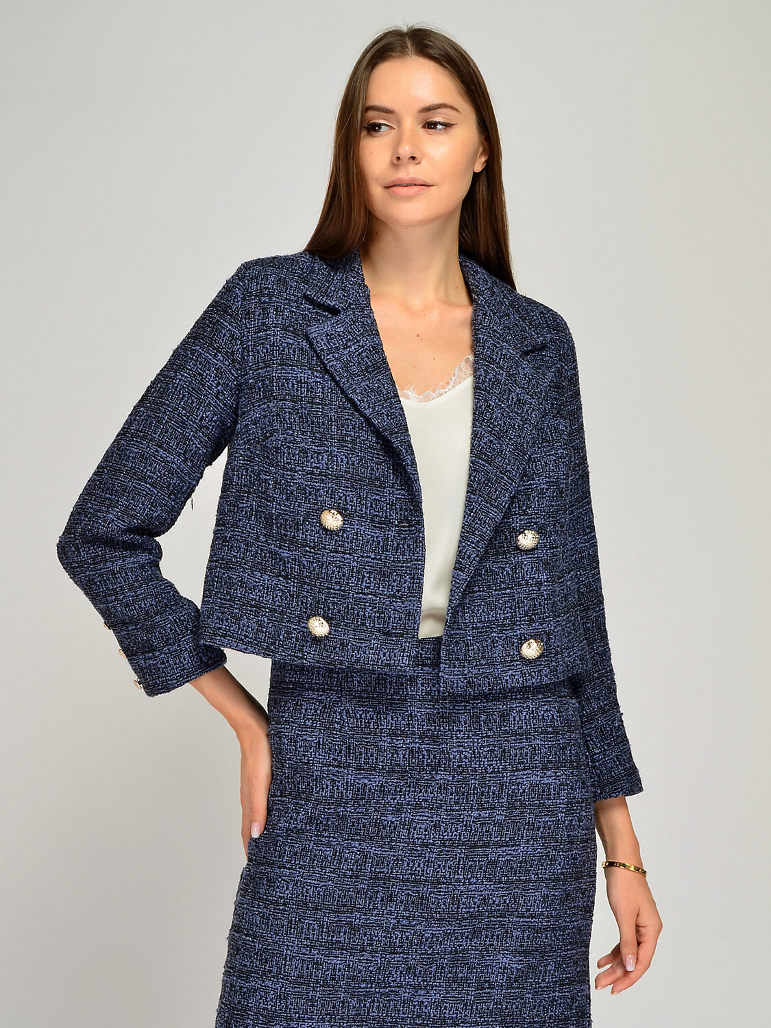 Двубортный женский укороченный жакет из твида клетчатой расцветки в сочетании с комплектной юбкой составит элегантный женственный образ для офиса, делового или торжественного мероприятия. Классический отложной воротник и укороченные рукава, декорированные нарядными пуговицами, дополняют строгий и утонченный стиль, подчеркивая чувство вкуса своей владелицы.