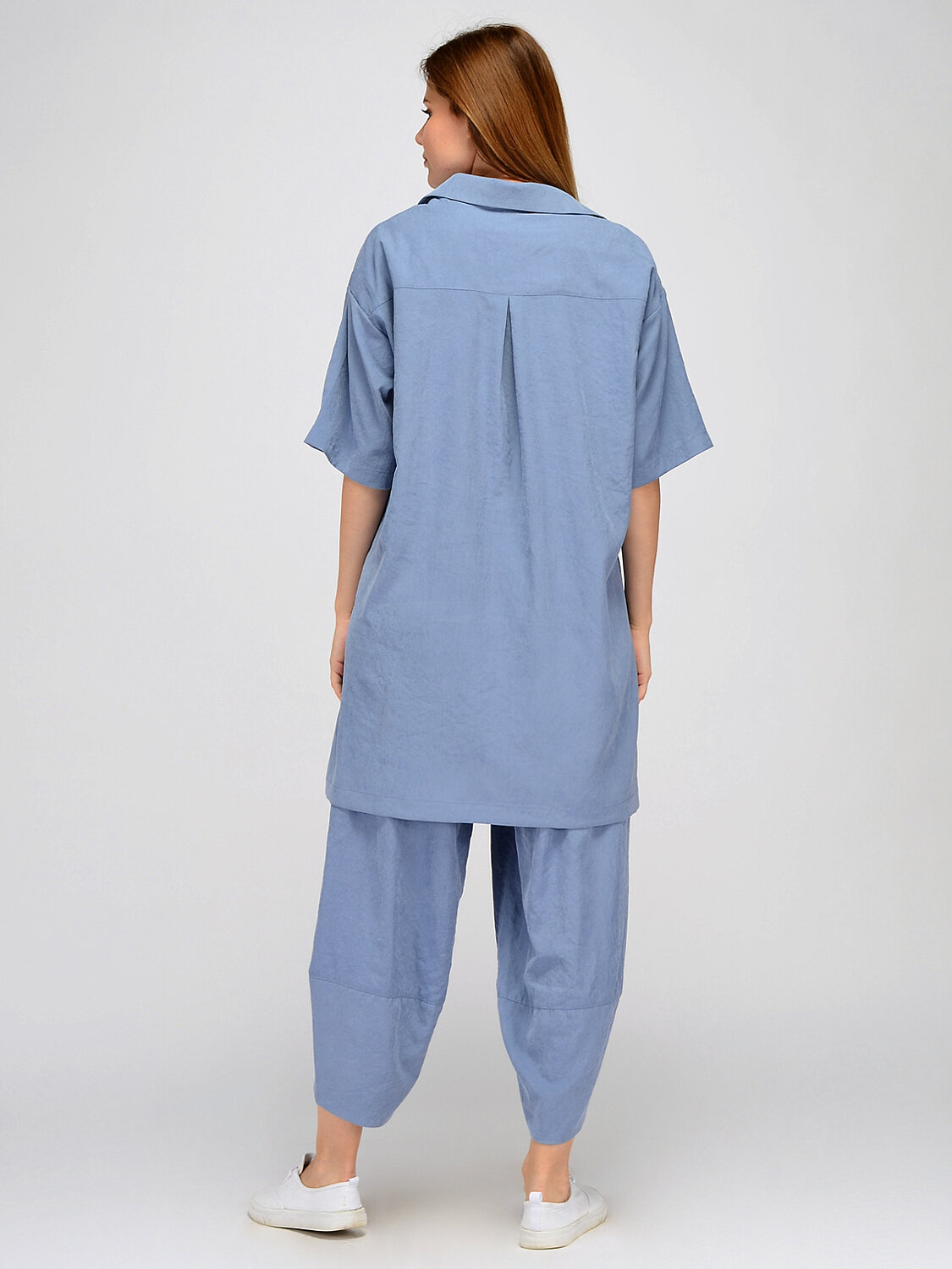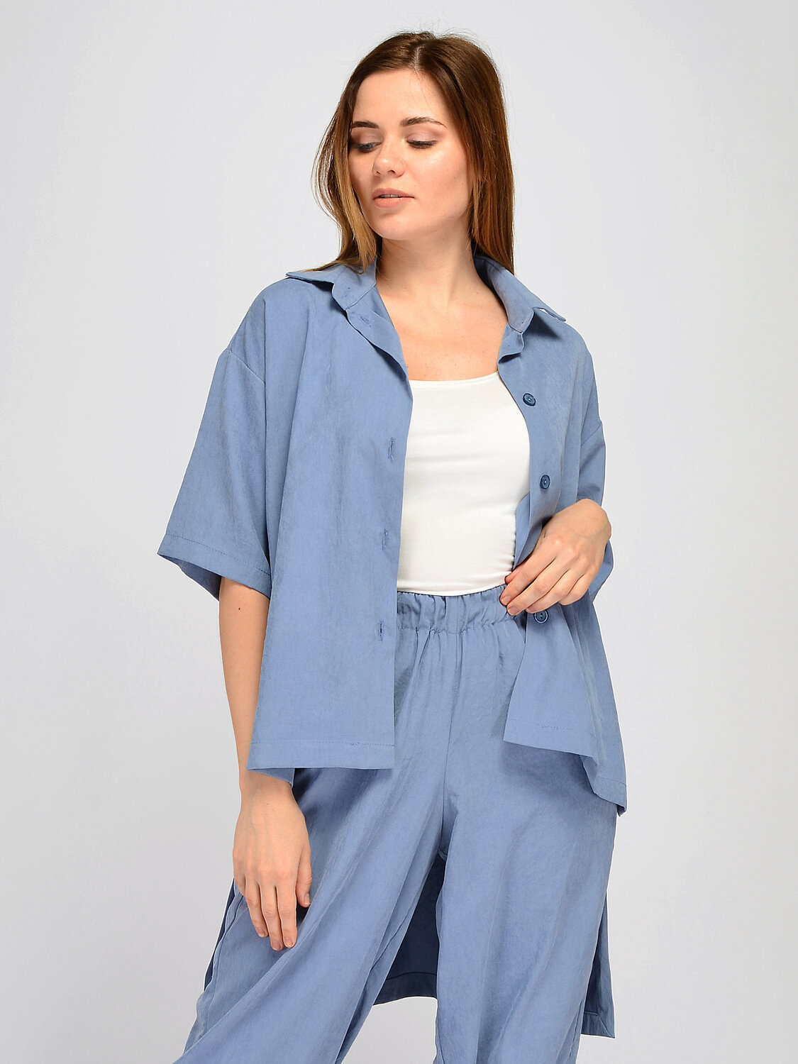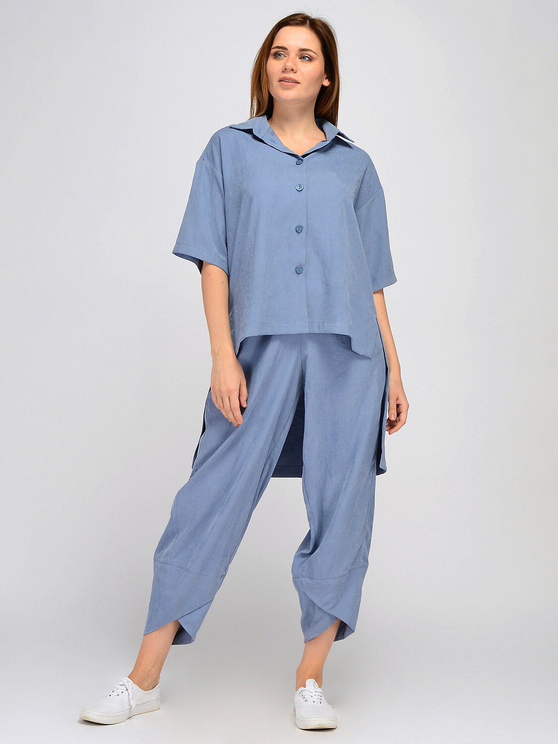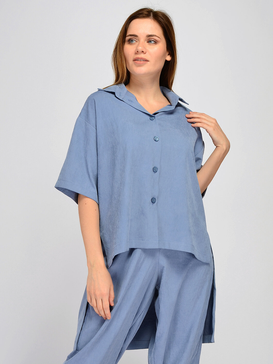 Блузка с отложным воротником. Прямая блузка с отложным воротником с легкостью дополнит офисный или повседневный образ в теплое время года. Горловина блузки оформлена классическим отложным воротником. Свободный крой и укороченные рукава обеспечат Вас максимальным комфортом. Смелая асимметричная длина блузки придает образу неординарности. Эффектный и комфортный образ на лето Вам будет обеспечен. Вырез горловины круглый. Отделка горловины отложной воротник. Рукава короткие. Рукава втачные. Вид застежки пуговицы. Декоративный элемент фигурный низ. Крой прямой. Рекомендована стирка при температуре не более 30С. Универсальная блузка с укороченными рукавами идеально дополнит разные стили и образы. Блузка с отложным воротником идеально сочетается с широкими брюками в тон из нашей коллекции, джинсами и шортами. Блузка застегивается на пуговицы, а значит, при желании, Вы сможете носить ее нараспашку, сочетая с топом или футболкой.