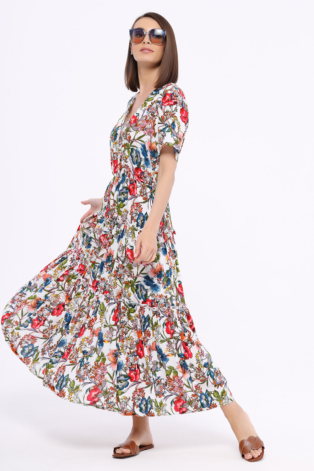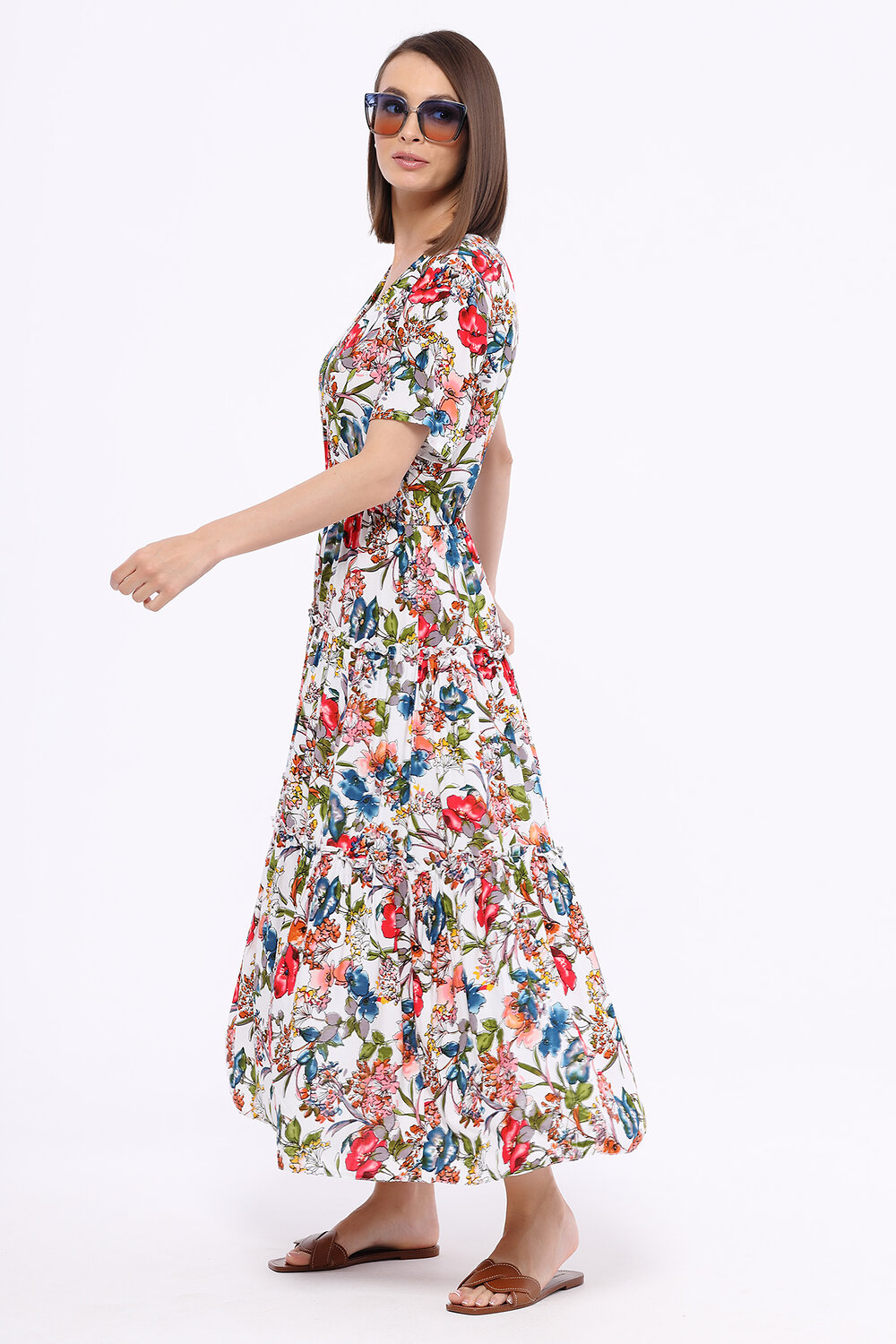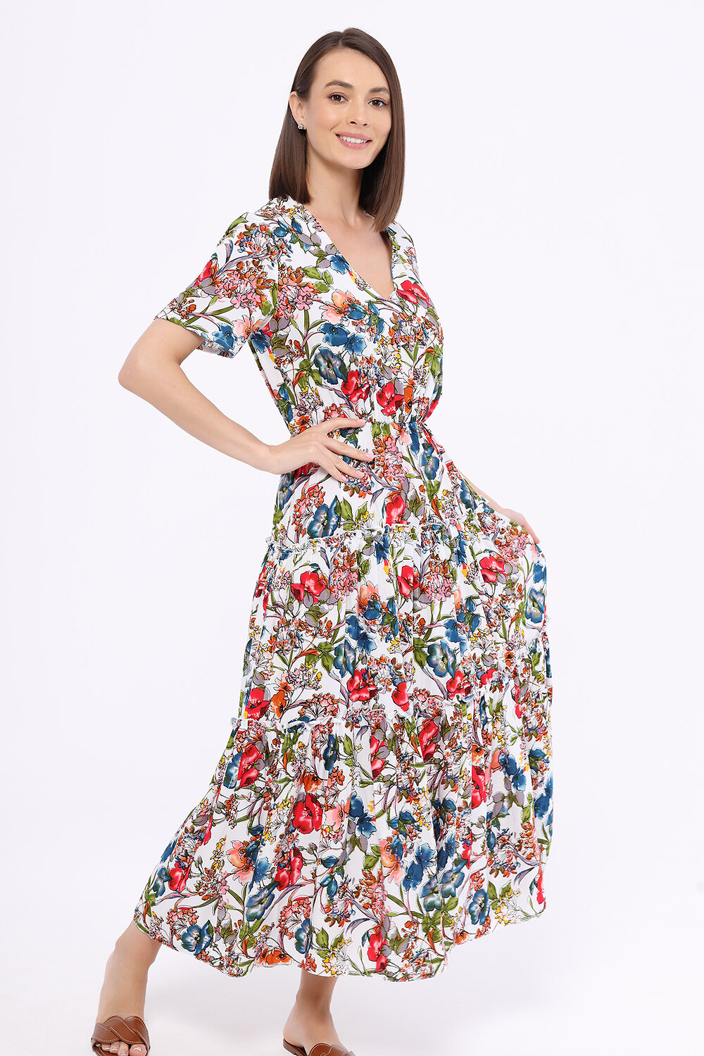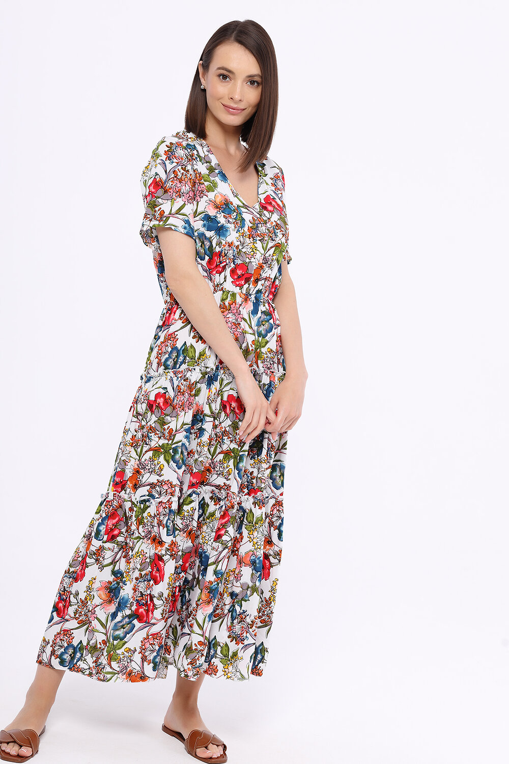 В составе платья вискоза 100%. V-образный вырез. Рукав короткий. Рукав втачной. Без воротника. Без застёжки. Длина макси. Конструктивный элемент - волан. Крой приталенный. Без карманов. Рекомендована стирка при температуре не более 30С.