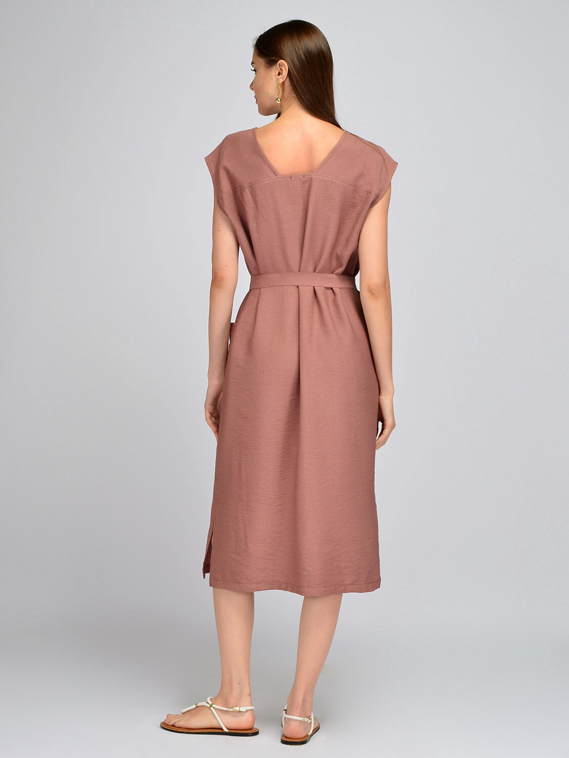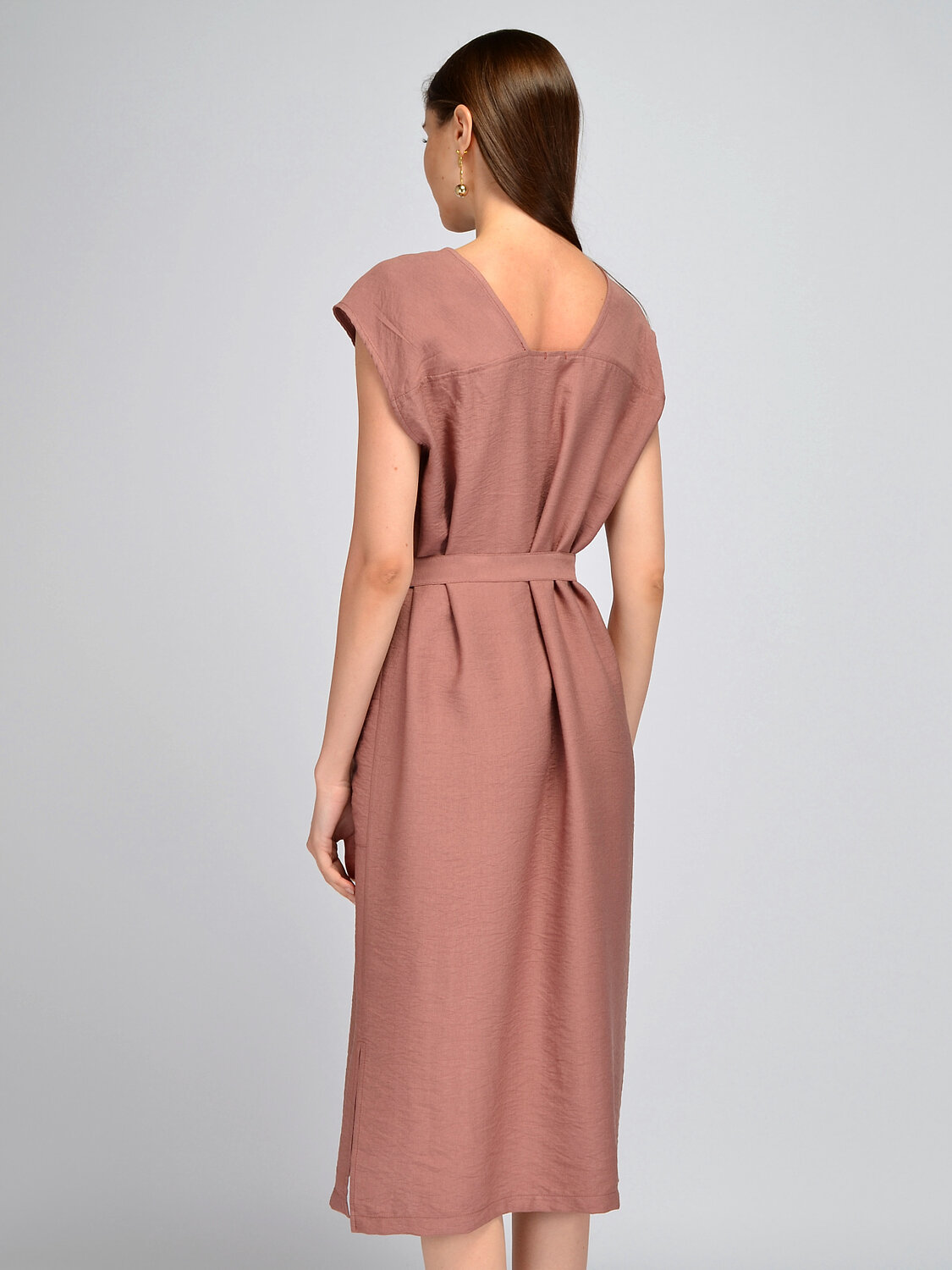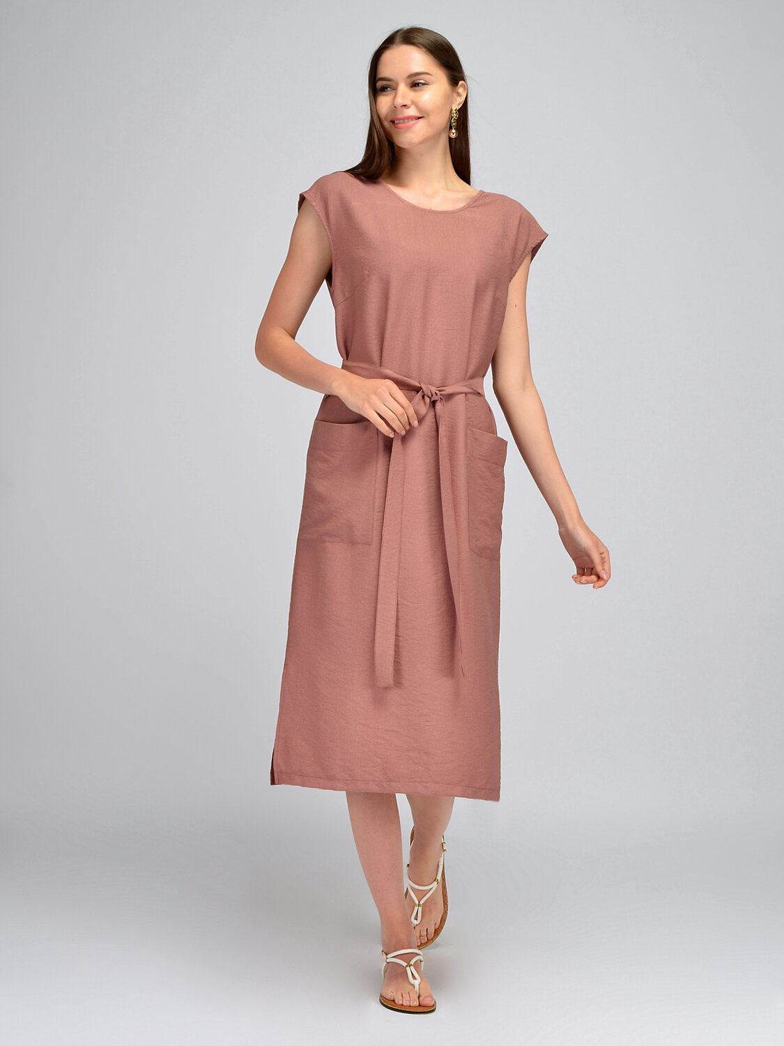 Лаконичное платье миди с короткими рукавами создаст удобный и женственный образ в летний сезон. Изящная округлая горловина приоткрывает ключицу и позволяет дополнить образ шейными украшениями. Короткие цельнокроеные рукава обеспечивают свободу движений. На платье предусмотрены вытачки на груди, поэтому модель прекрасно сядет на разные типы фигуры. Свободное платье комплектуется поясом в цвет, акцентируя внимание на талии и моделируя утонченный силуэт. На полочке располагаются накладные карманы, придавая образу практичности и удобства. По бокам находятся достаточно высокие разрезы, придавая легкости Вашей походке. Прямой крой платья поможет скрыть возможные недостатки фигуры, а пояс и вытачки подчеркнут ее достоинства. Летнее платье выполнено из приятного легкого материала, в основе состава вискоза, а это значит, что Вы будете чувствовать себя комфортно и уверенно на протяжении всего даже самого жаркого дня. Классический фасон может стать частью как офисного, так и повседневного или нарядного стиля. Завершенный образ будет зависеть от подобранной обуви, украшений и аксессуаров. Базовое платье придется по вкусу взрослым женщинам, молодым девушкам и будущим мамам.