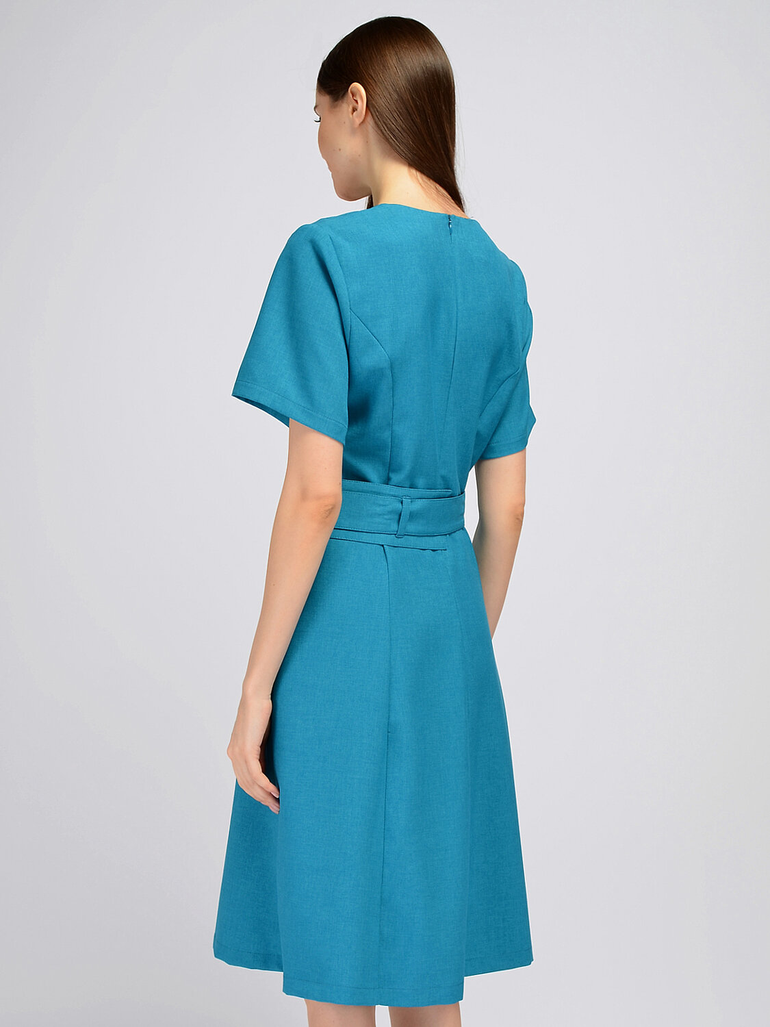 В составе платья полиэстер 50%, вискоза 50%. Вид горловины - V-образный вырез, рукав короткий, рукав втачной, в комплекте пояс, вид застёжки - молния сзади, длина миди, крой приталенный, без карманов. Рекомендована стирка при температуре не более 30С.