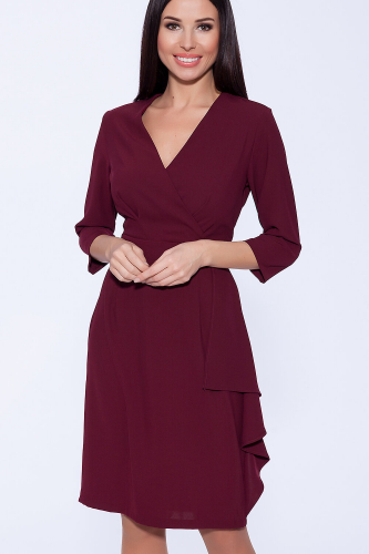 Приталенное платье миди будет выглядеть эффектно и гармонично как на деловых, так и на торжественных мероприятиях. V-образный вырез и свободный укороченный рукав с декоративными складками придают лаконичному силуэту женственности. В комплекте с платьем присутствует пояс, выполненный из материала, совпадающего с платьем, который подчёркивает линию талии и визуально делает ее изящнее.
