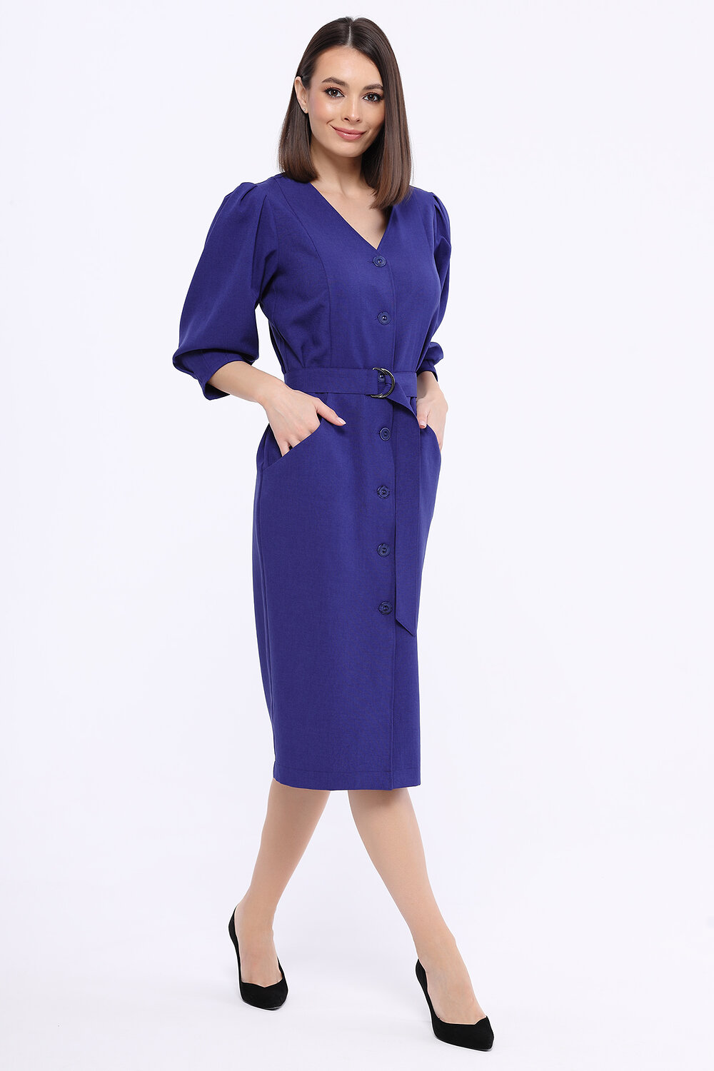 В составе платья полиэстер 50%, вискоза 50%. V-образный вырез. Вид застёжки - пуговицы. Пояс в комплекте. Рукав укороченный, до локтя. Декоративные складки на рукавах. Наклонные карманы в боковых швах. Длина миди. Модель юбки - зауженная. Крой приталенный. Рекомендована стирка при температуре не более 30С.