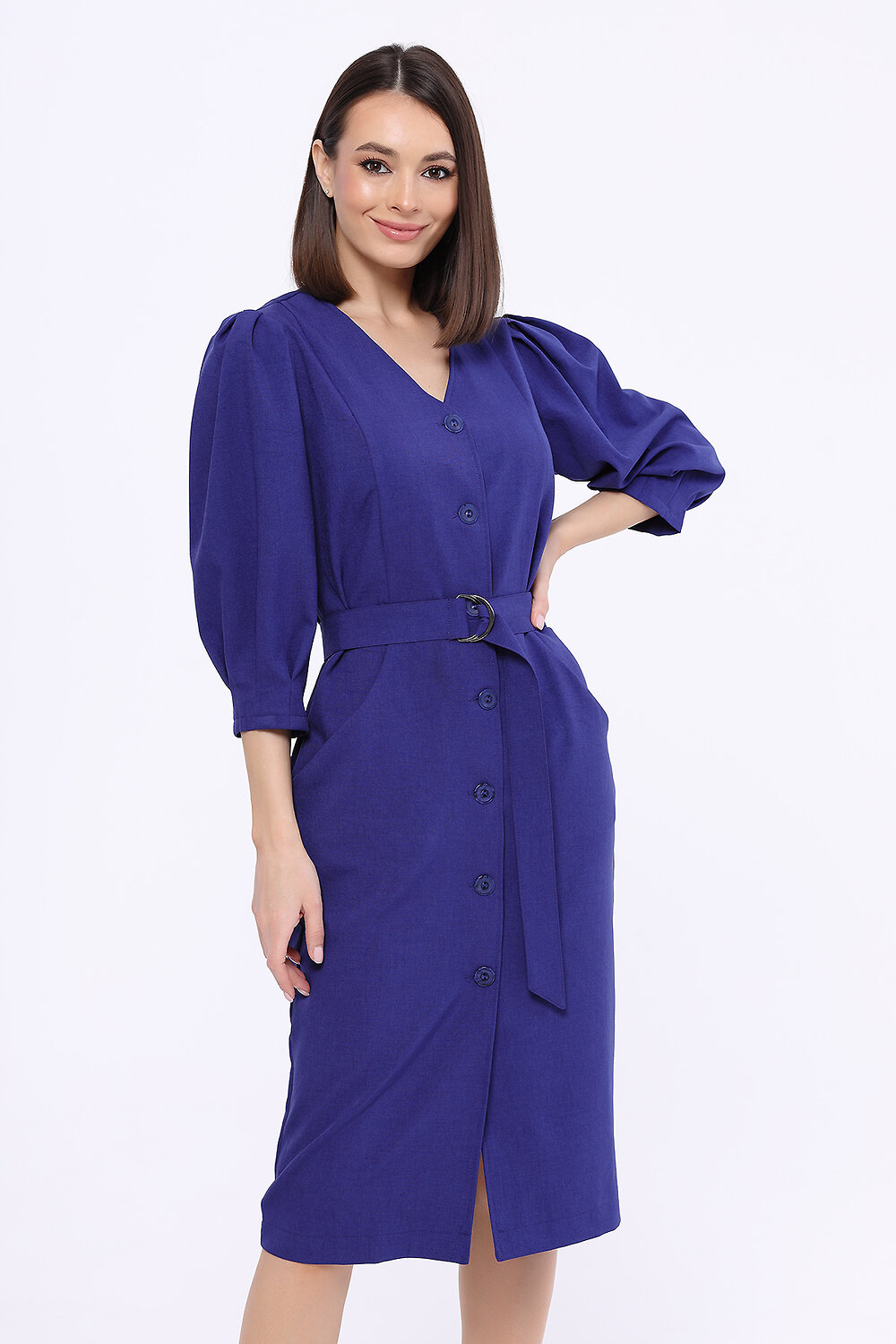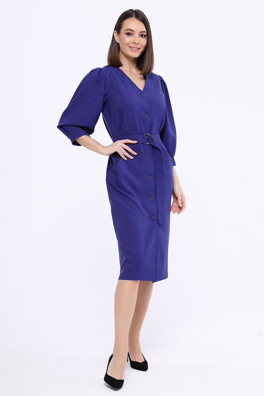 В составе платья полиэстер 50%, вискоза 50%. V-образный вырез. Вид застёжки - пуговицы. Пояс в комплекте. Рукав укороченный, до локтя. Декоративные складки на рукавах. Наклонные карманы в боковых швах. Длина миди. Модель юбки - зауженная. Крой приталенный. Рекомендована стирка при температуре не более 30С.