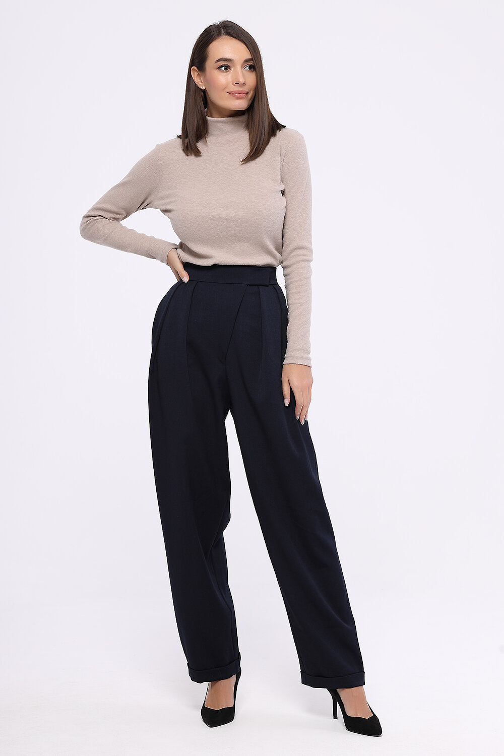 Брюки женские прямого силуэта на втачном поясе с манжетами. Впереди складки и фигурный гульфик. сзади накладные листочки. В боковых швах карманы.