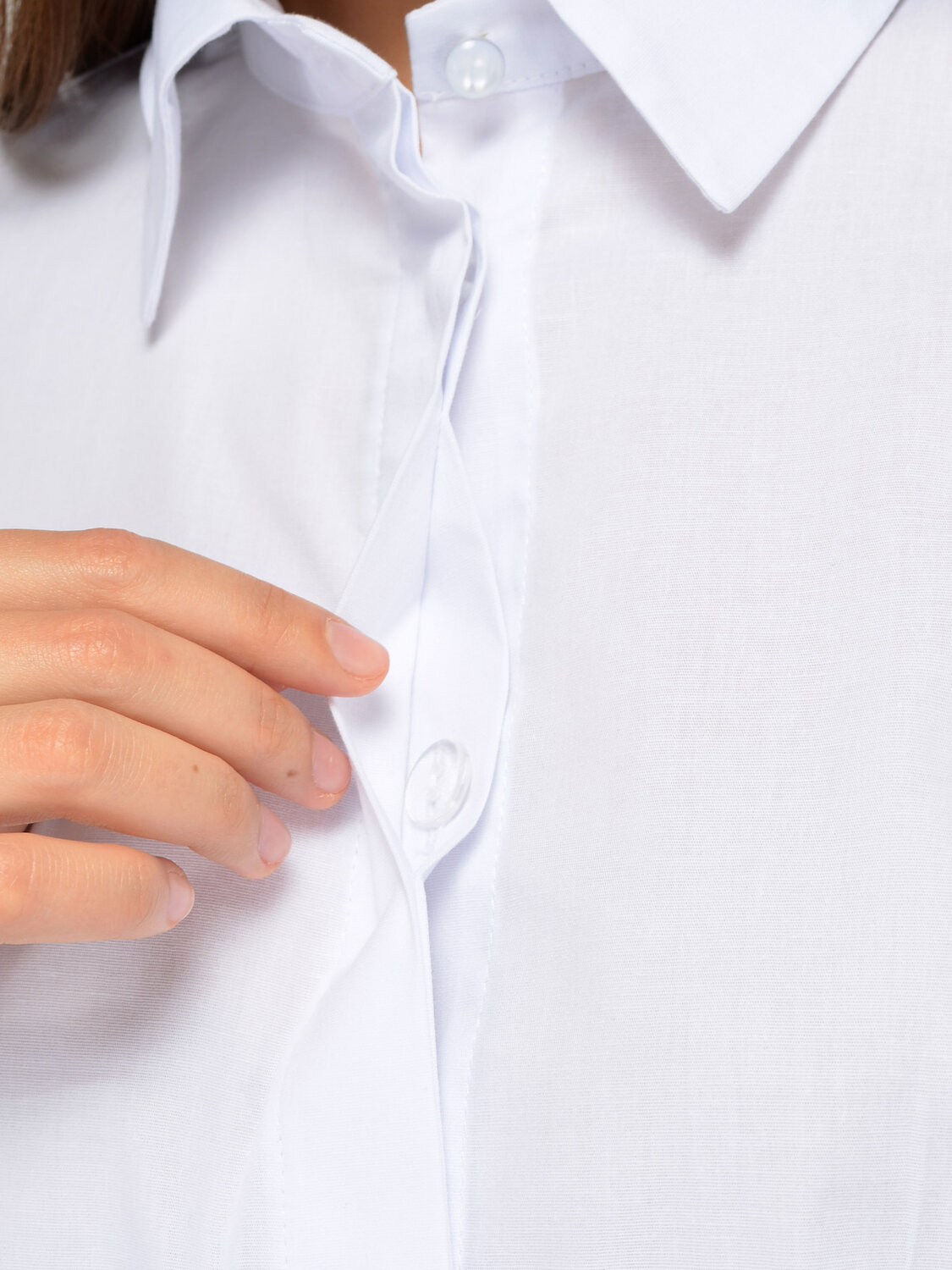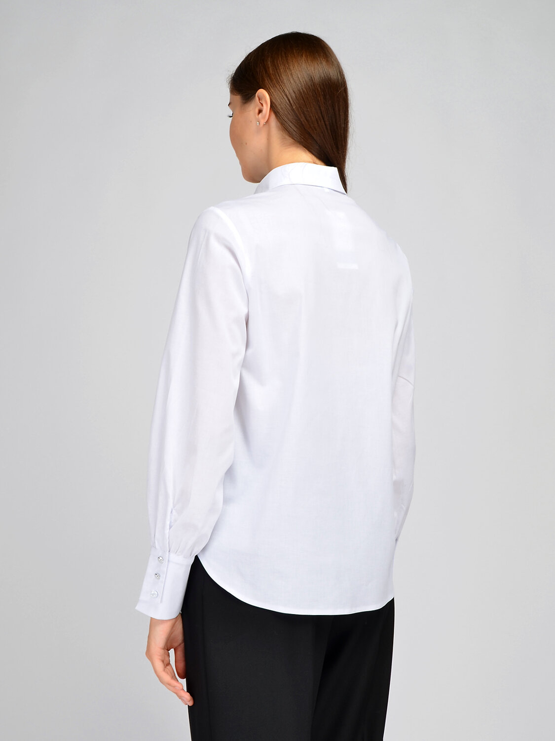 Базовая рубашка с оригинальными деталями придется по вкусу модницам любого возраста. Блузка имеет классический отложной воротник, застегивается на пуговицы, которые скрыты вертикальной планкой, чтобы ничто не отвлекало от Вашего образа. Прямой крой с вытачками на груди позволяет вещи идеально сесть на любую фигуру, даже если у Вас большой размер одежды. У блузы модные объемные рукава с интересными манжетами, на которых расположены по три изящных пуговицы. Сам манжет асимметричный, что придает изделию эффектный акцент. Рубашка выполнена из качественной хлопковой ткани, обеспечивая Вам комфорт на протяжении всего дня. Вы можете надеть универсальную блузу на работу, в офис, в школу, а также на торжественные мероприятия, театр или вечеринку. Изделие имеет фигурные вырезы по бокам, полочка и спинка имеют закругленную форму. Вы можете носить вещь как навыпуск, так и заправлять ее за пояс. Вы можете заправить блузу только спереди или со всех сторон. Лаконичная рубашка оверсайз сочетается как со строгими брюками, юбками и жакетами, так и с более повседневными вариантами, например, джинсами. Создайте свои неповторимы образы, взяв за основу базовую блузку оверсайз!
