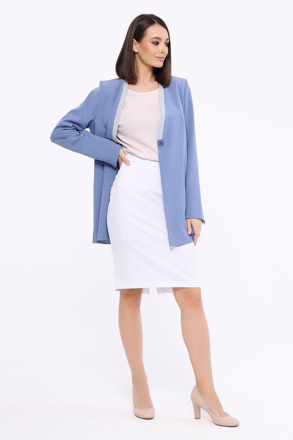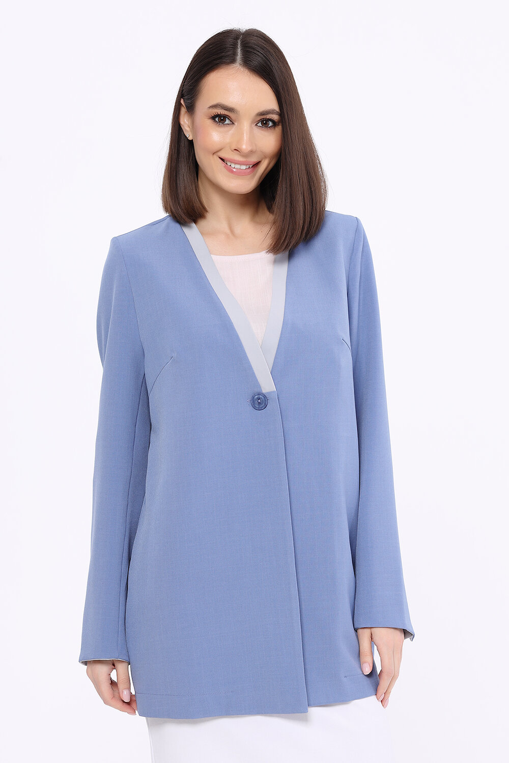 Свободный жакет на одной пуговице сделает Ваш офисный или повседневный образ стильным и современным. Прямой крой жакета будет беспроигрышно смотреться на любом типе фигуры. Глубокий V-образный вырез открывает ключицу и добавляет образу женственности. Удлинённый жакет впишется в офисный стиль и в модный образ в стиле кэжуал.
