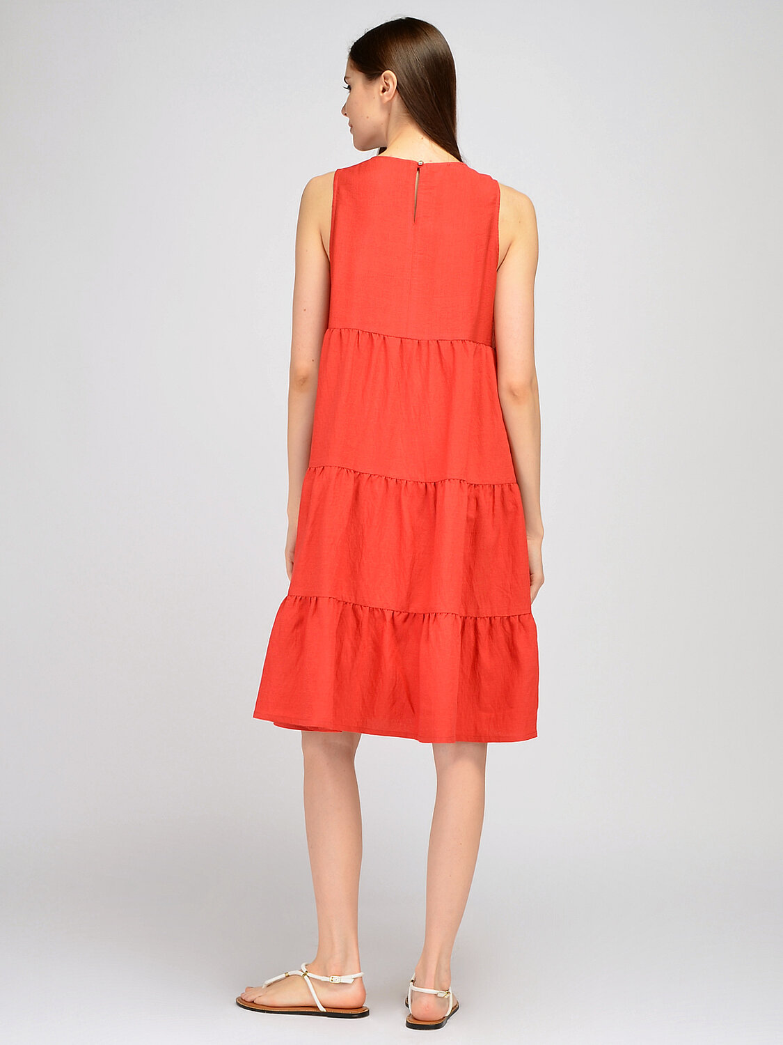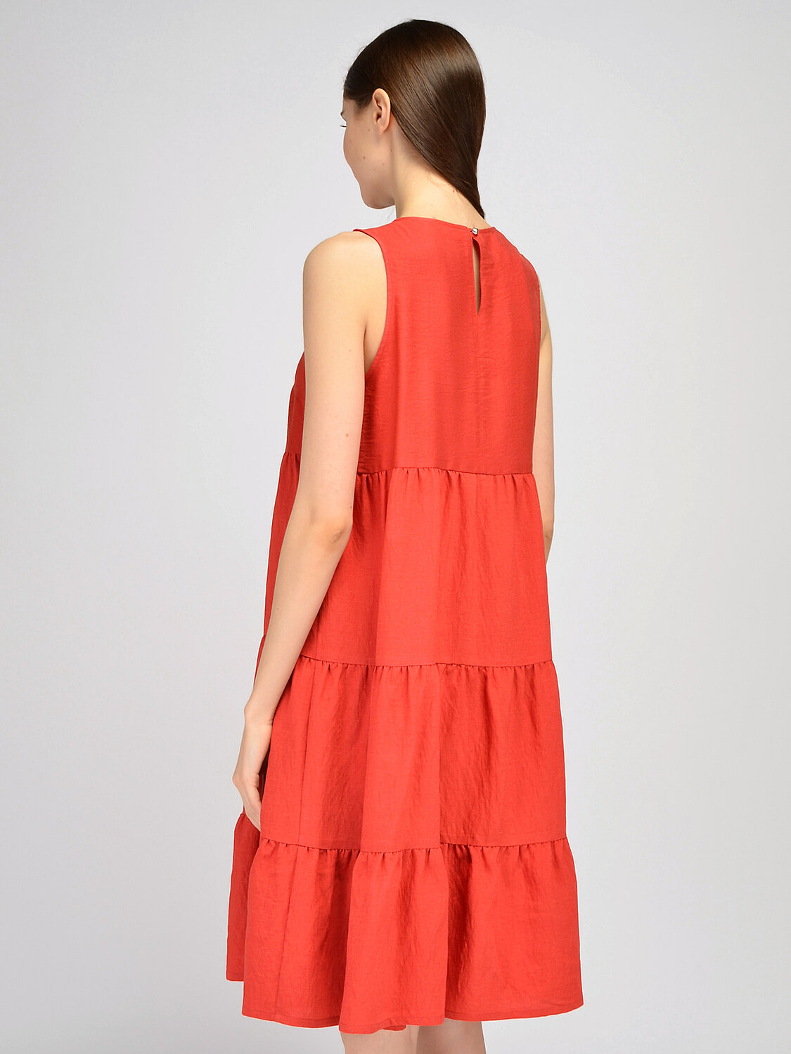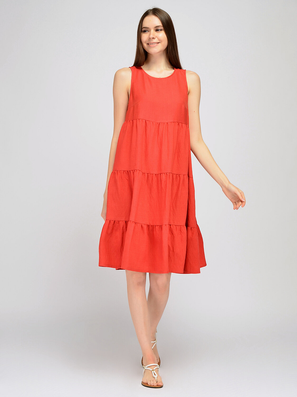 Платье миди с оборками. Широкое платье миди без рукавов по праву займёт место в Вашем весеннем или летнем гардеробе. Аккуратный округлый вырез и длина миди придают образу сдержанности, а свободная широкая юбка с оборками добавит образу романтичности, даря своей владелице ощущение комфорта в жаркий сезон. Вырез горловины круглый. Без отделки горловины. Без рукава. Вид застежки пуговицы. Декоративный элемент оборка. Длина миди. Крой широкий. Покрой свободный. Рекомендована стирка при температуре не более 30С. Платье миди со свободной юбкой подойдет любому типу фигуры. В нём Вы будете чувствовать себя легко и женственно. Платье миди без рукавов гармонично смотрится с обувью как на низком ходу, так и на каблуке. Прохладным вечером Вы можете накинуть на плечи кардиган контрастного цвета. Завершите образ сумкой или рюкзаком контрастного цвета.
