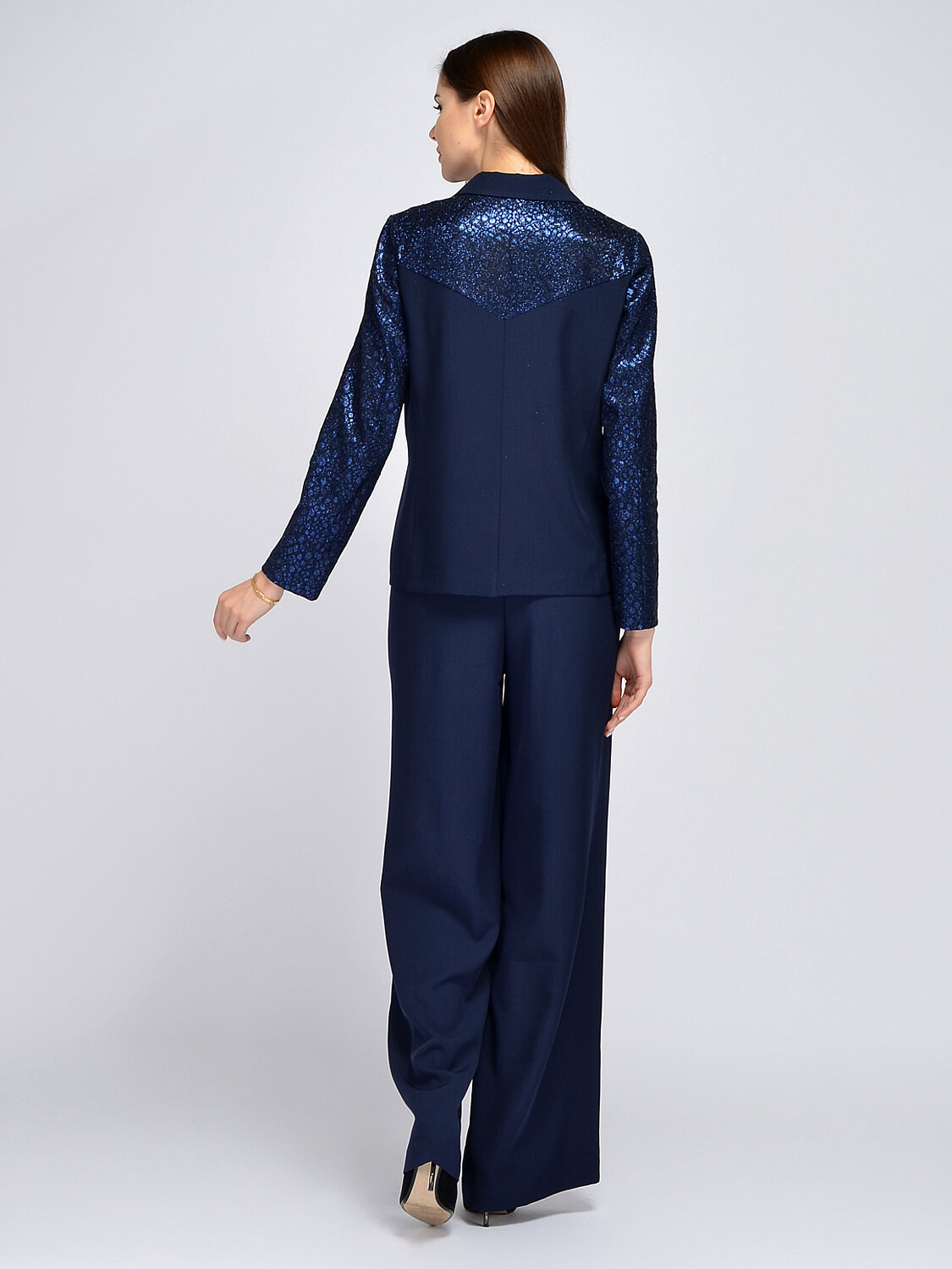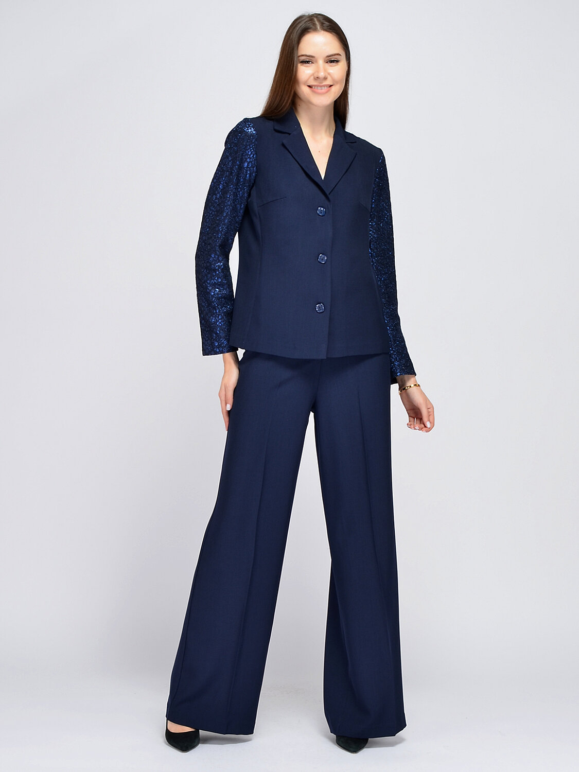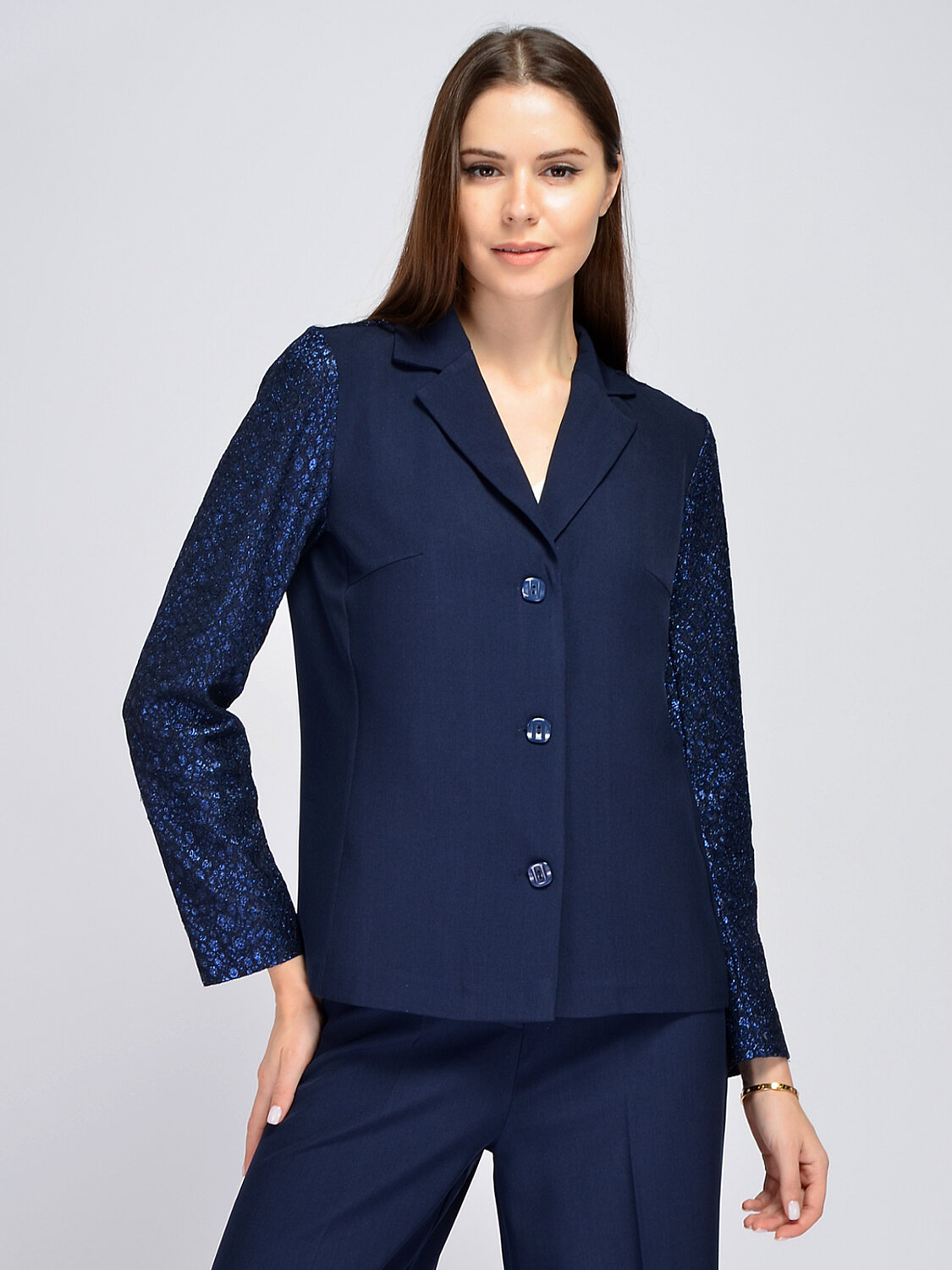Праздничный жакет прямого кроя впишется как в вечерние и офисные образы. Классический фасон с отложным воротником дополнен эффектными кружевными рукавами с блестками. Вытачки на груди обеспечивают жакету идеальную посадку в области груди. Прямой жакте до бедра застегивается на три пуговицы. Свободная посадка не сковывает движений и скрывает возможные недостатки фигуры. Нарядный жакет идеально гармонирует с комплектными брюками в тон. Вы также можете сочетать его с другими брюками, юбками, топами, блузками. Для завершения вечернего образа на выход, подберите подходящие украшения, аксессуары и оубвь. К классическому жакету подойдет женственная обувь на высоком ходу. Жакет с длинными рукавами подойдет взрослым женщинам и молодым девушкам. Вы легко сможете подобрать нужный размер, ведь данная модель выпускается в широком размерном ряду. Выбирайте классику, которая сохранит свою актуальность на долгие годы!