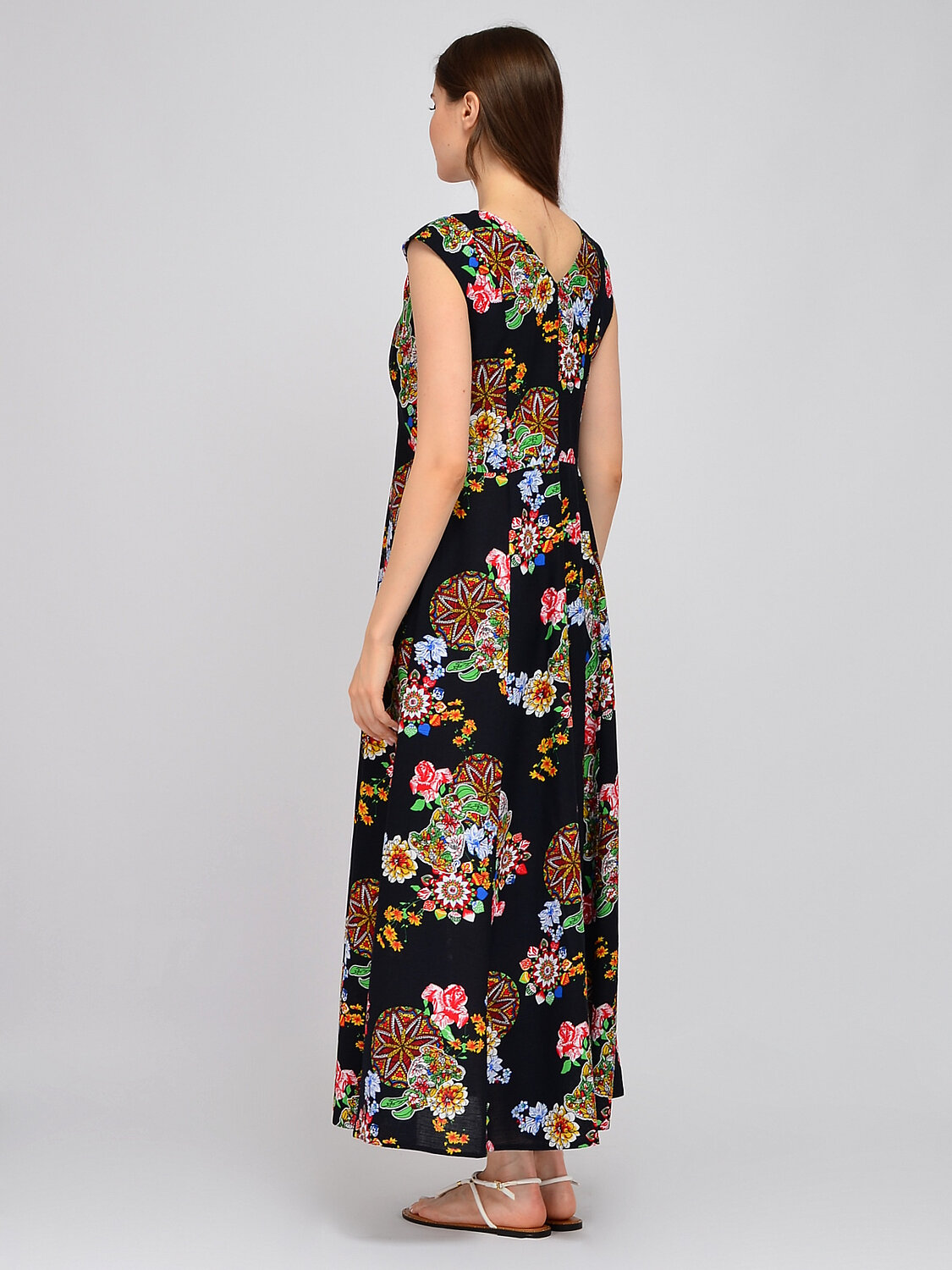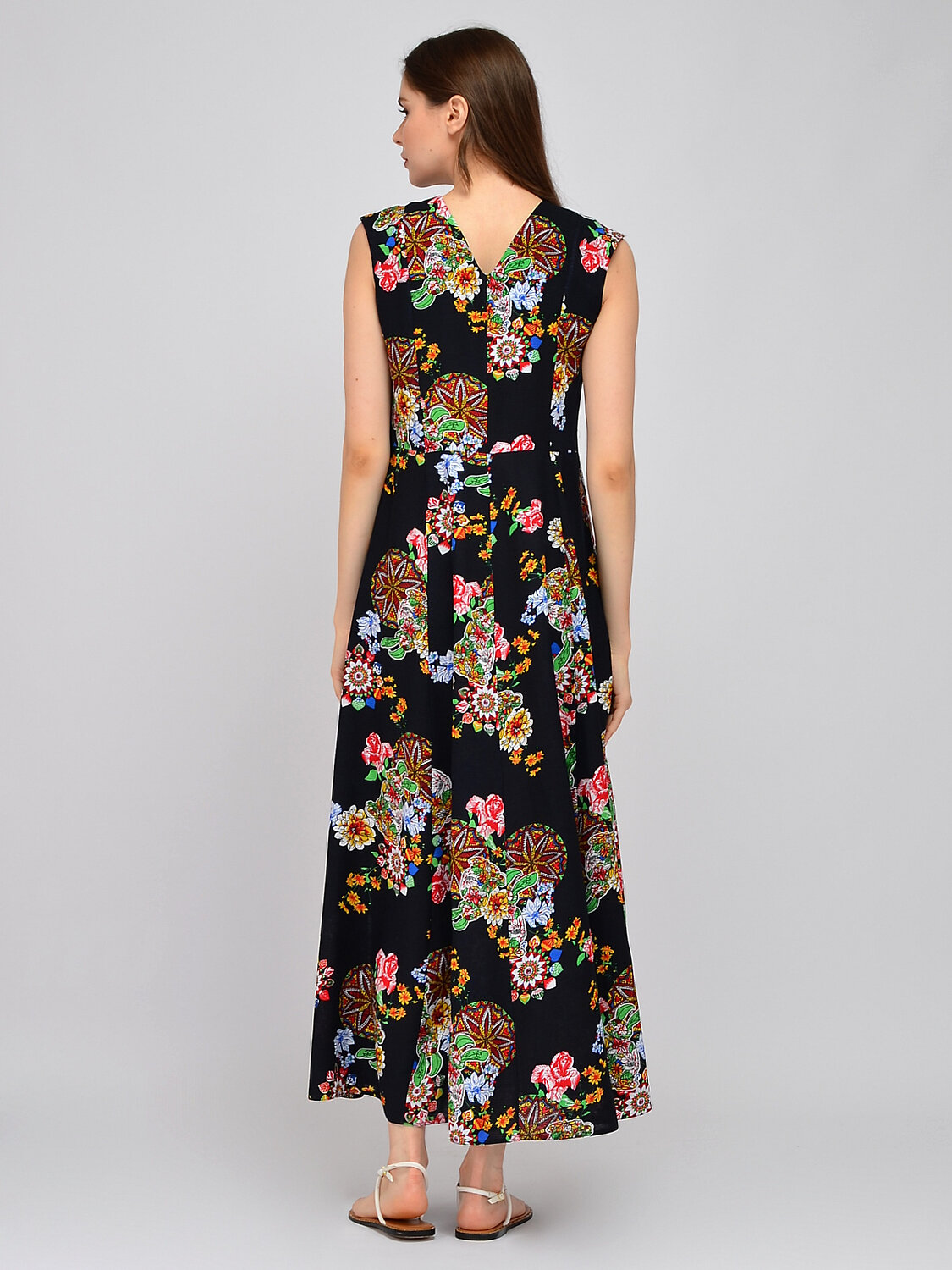В составе платья вискоза 100%. V-образный вырез. Без отделки горловины. Без рукава. Без застёжки. Длина макси. Крой приталенный. Без карманов. Рекомендована стирка при температуре не более 30С.