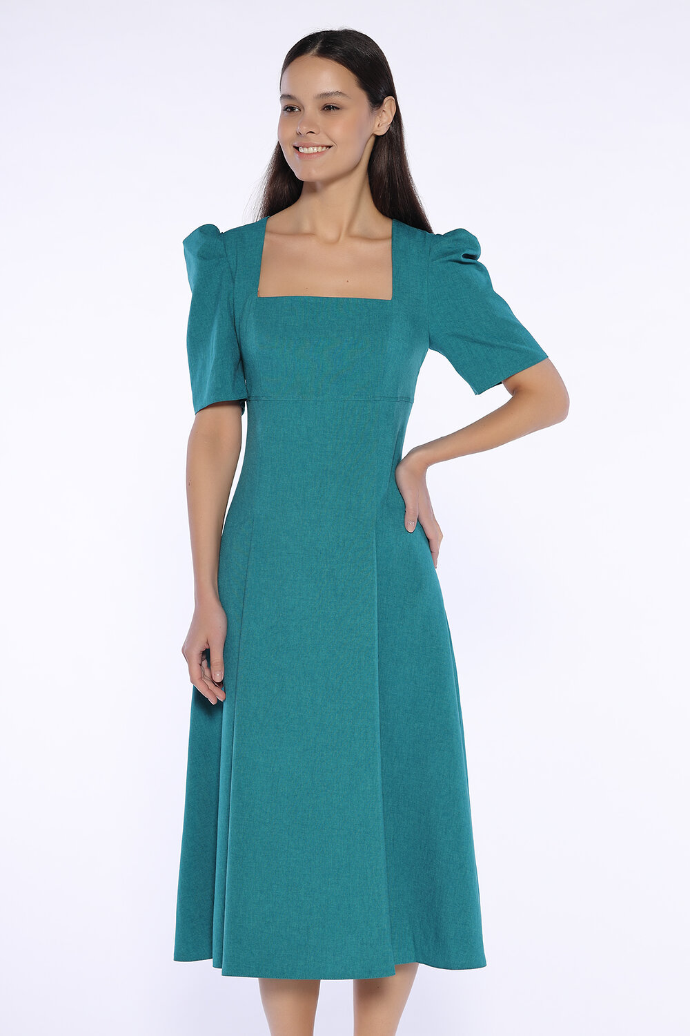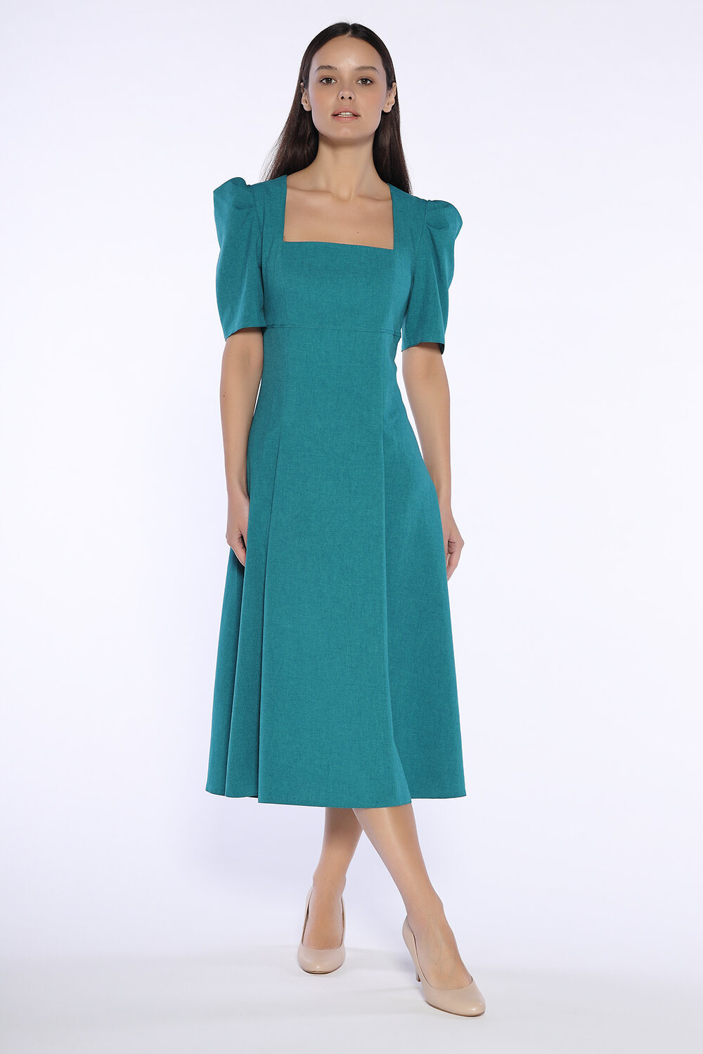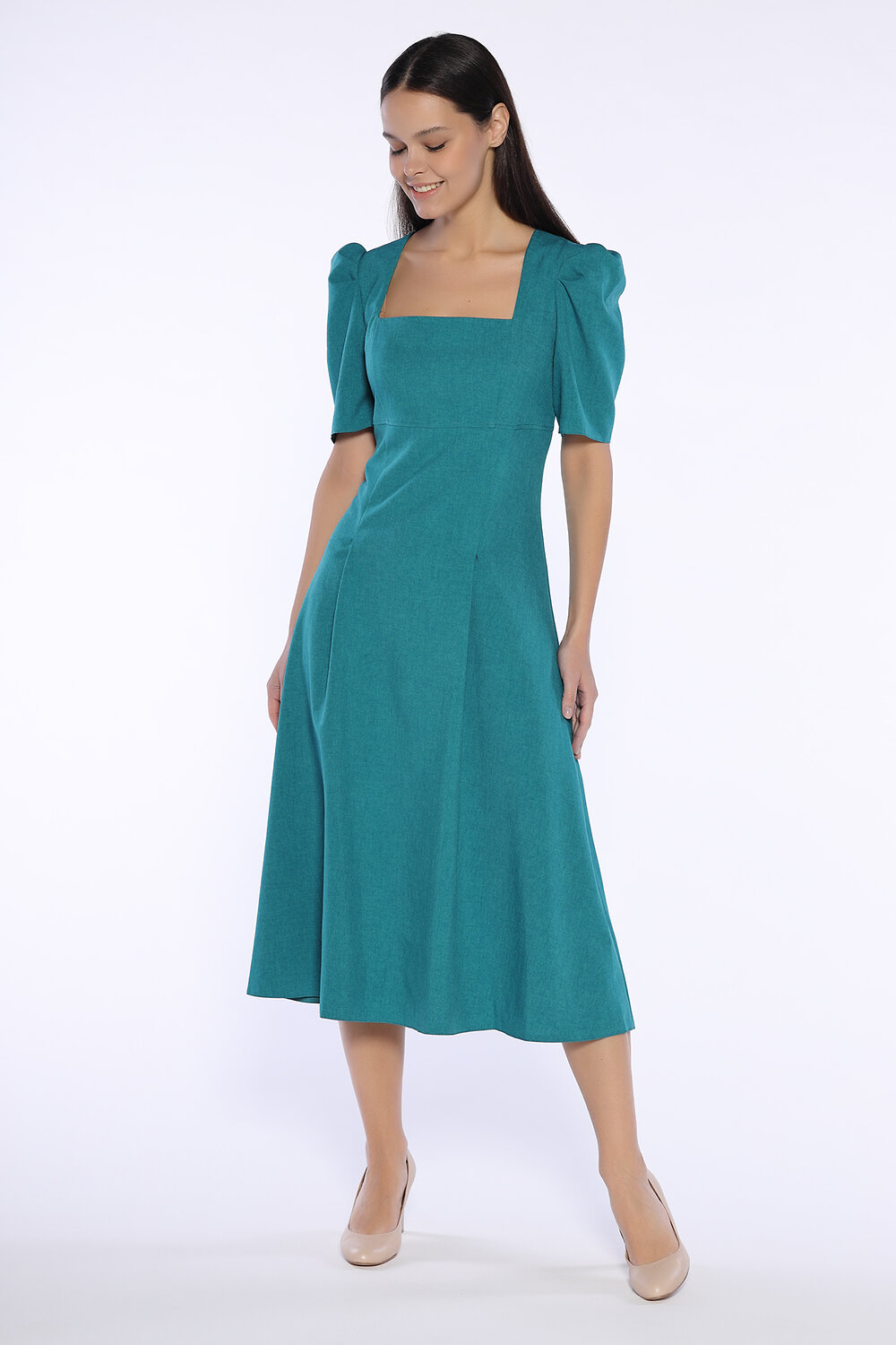 Летнее платье миди приталенного силуэта станет важной новинкой Вашего гардероба. Миди платье с расклешенной юбкой обеспечит Вам элегантный и женственный образ на каждый день или для особых случаев. Длинное летнее платье имеет стильный квадратный вырез горловины, придавая образу интеллигентности. Под грудью находится декоративная горизонтальная отстрочка, привлекающая внимание к зоне декольте. Чтобы платье миди идеально сидело фигуре, на нем предусмотрены вытачки. Оригинальной деталью платья являются объемные рукава чуть выше локтя. Спереди и сзади на юбке находятся складки, моделирующие силуэт. Свободный крой юбки скроет возможные недостатки фигуры. Лаконичный фасон с эффектными элементами составит строгий и в то же время игривый образ. Вы можете надеть летнее платье ниже колена в офис, на свидание, на торжественное мероприятие, на свадьбу. Универсальное платье придется по вкусу как взрослым женщинам, так и молодым девушкам. Завершите образ украшениями и обувью на каблуке (лодочками или босоножками).