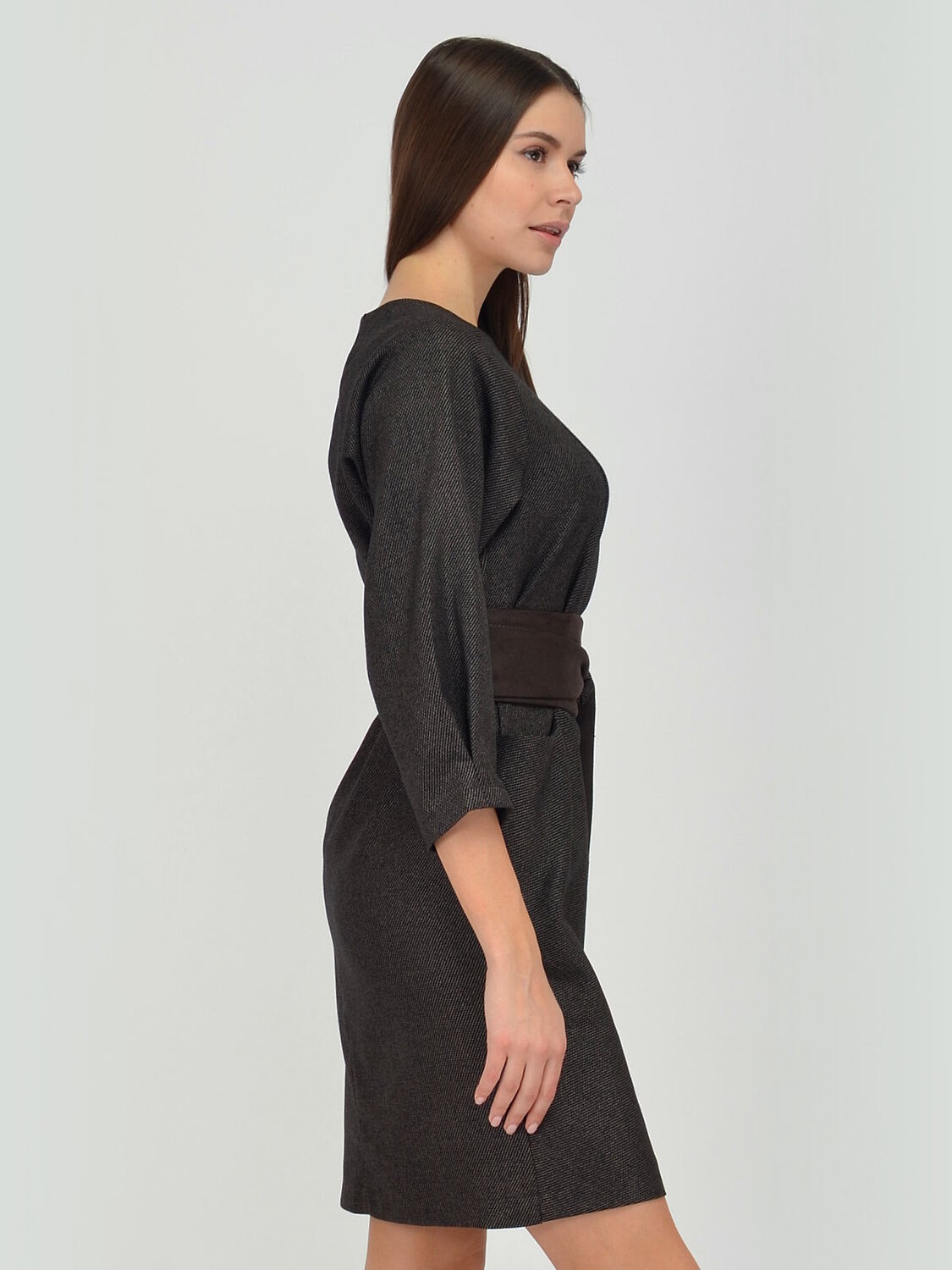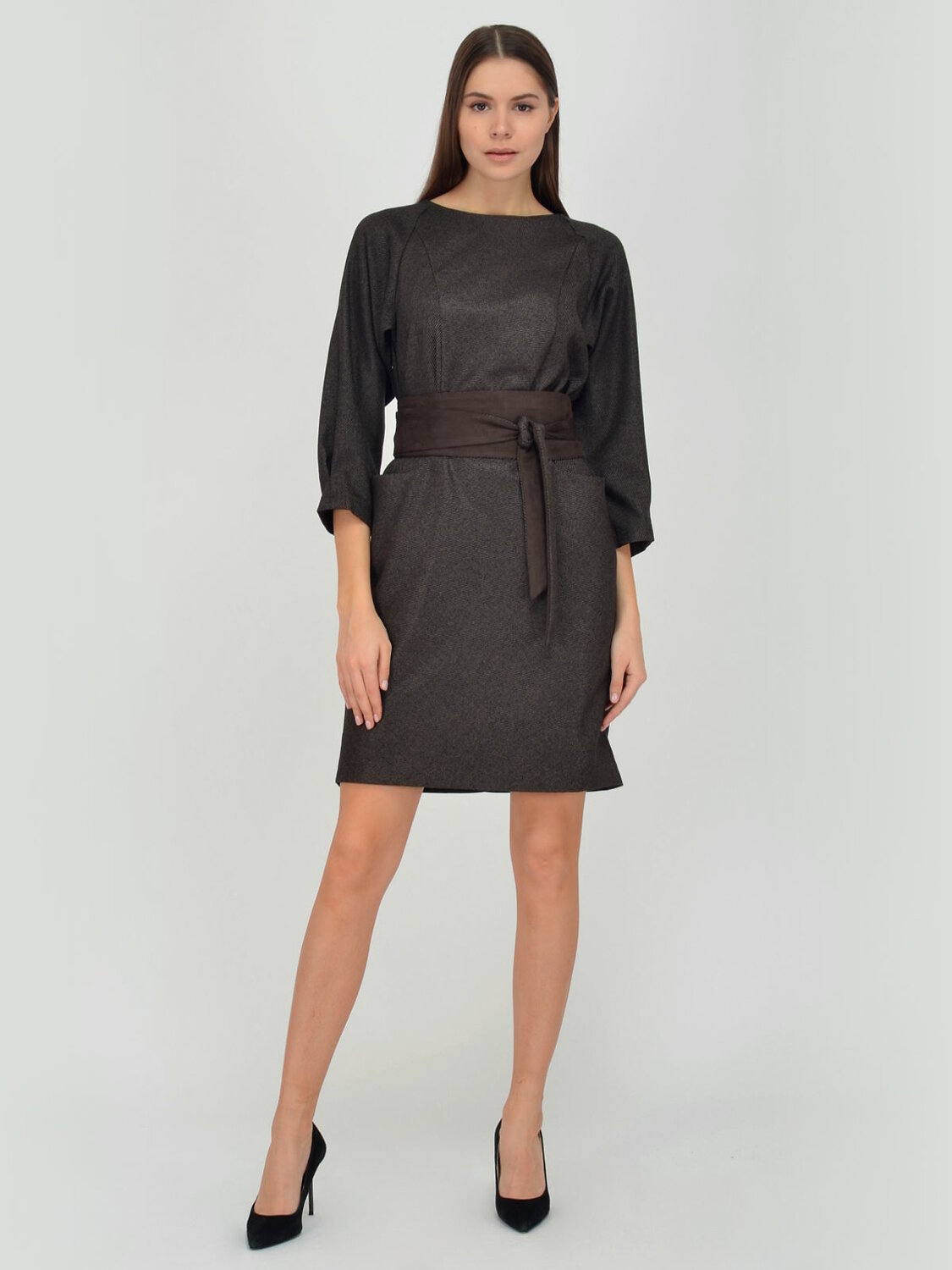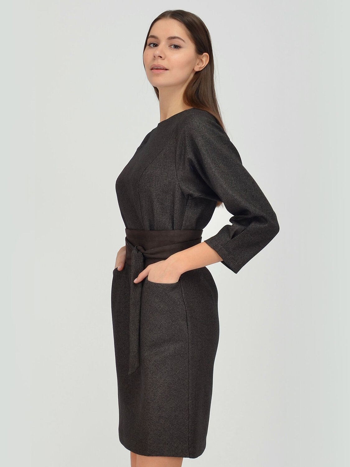 Платье женское приталенного силуэта. Рукав-реглан 3/4.На полочке в подрезах карманы.Платье дополнено поясом-кушаком.