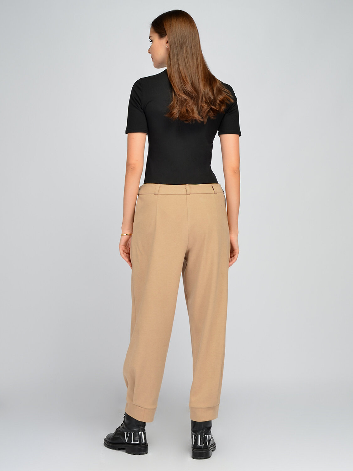 В составе изделия полиэстер 70%, вискоза 25%, лайкра 5%. Вид застёжки - молния, пуговица. На полочке карманы с листочкой. Завышенная талия. Зауженные книзу со складками, на манжете. Защипы на карманах. Рекомендована стирка при температуре не более 30С.