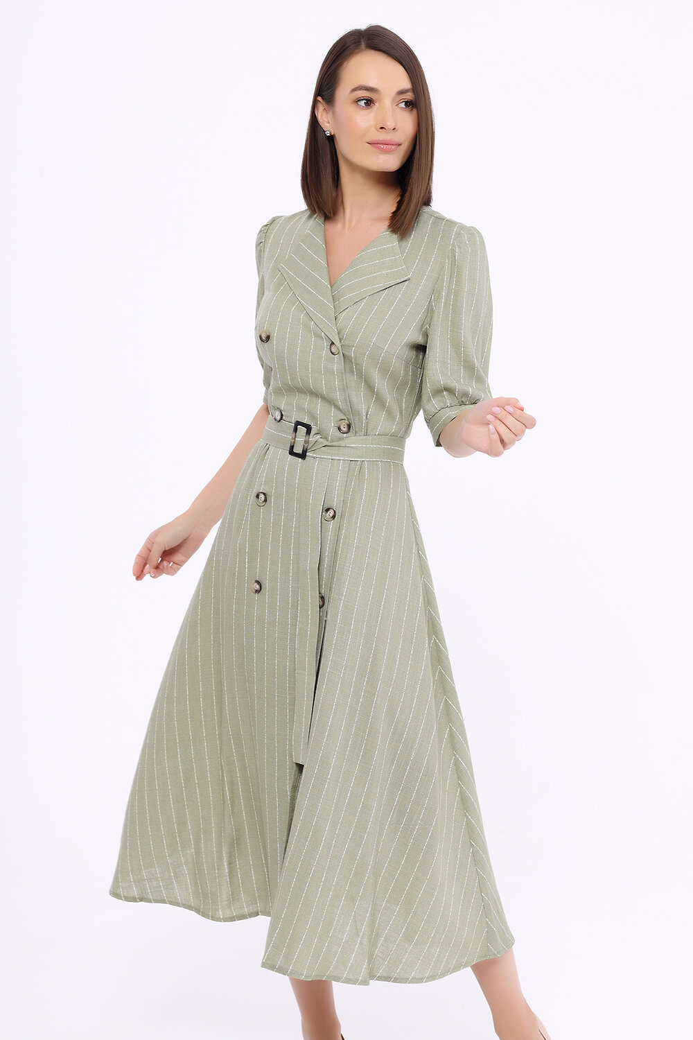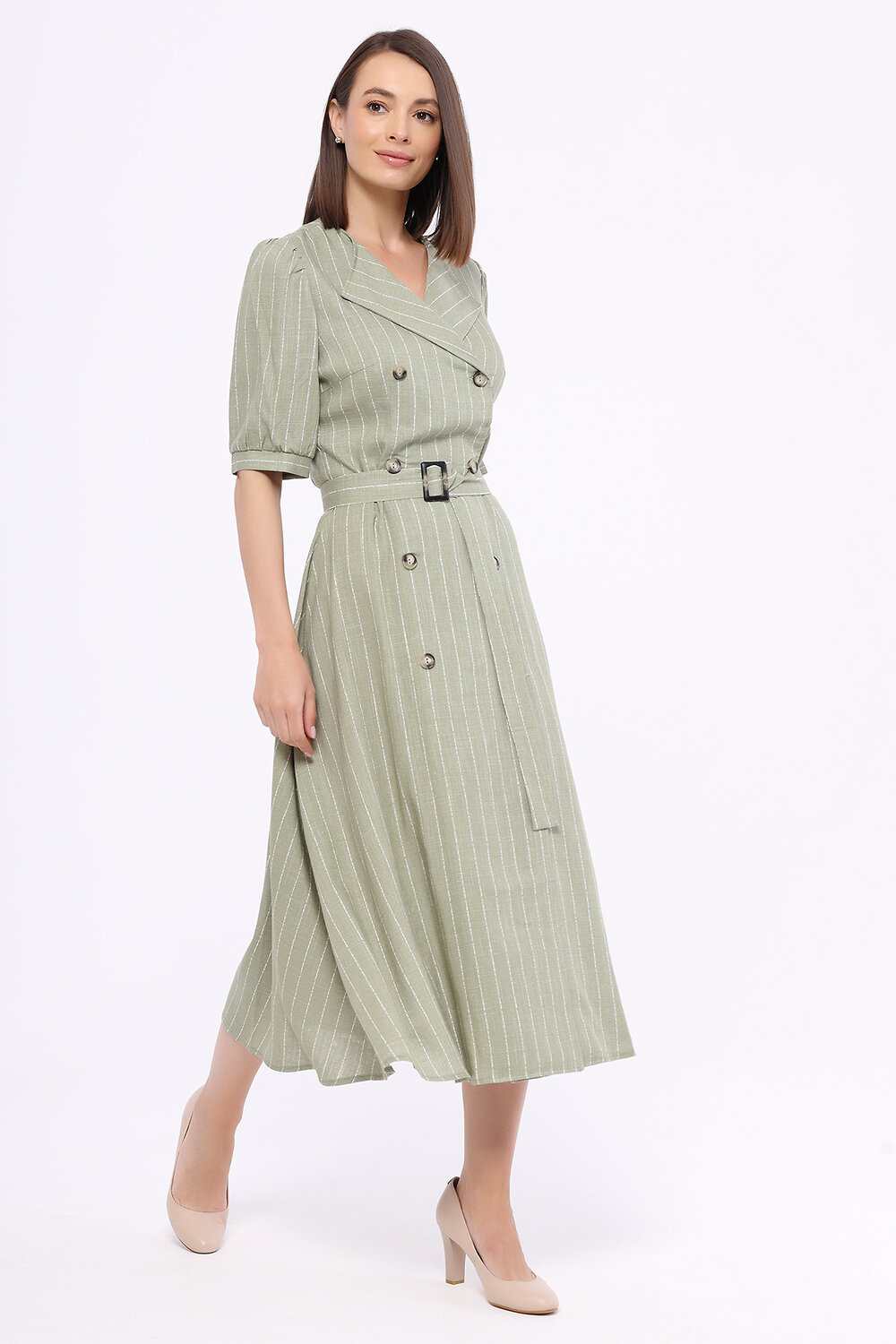 В составе платья лён 80%, полиэстер 20%. V-образный вырез. Без отделки горловины. Отложной воротник. Рукав короткий. Рукав втачной. Форма рукава - фонарик. Комплектация - ремень. Вид застёжки - пуговицы. Длина макси. Конструктивный элемент - запах. Крой приталенный. Рекомендована стирка при температуре не более 30С.