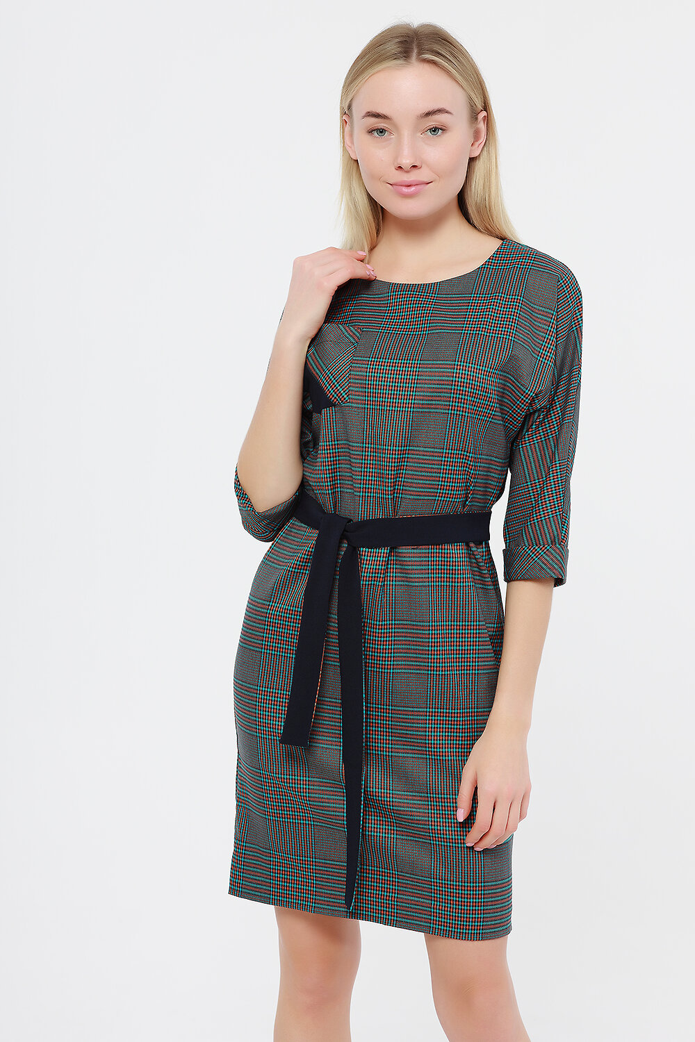 Платье женское прямого силуэта. рукав цельнокроеный три четверти. На передней полочке накладной карман. Изделие дополнено двусторонним поясом.